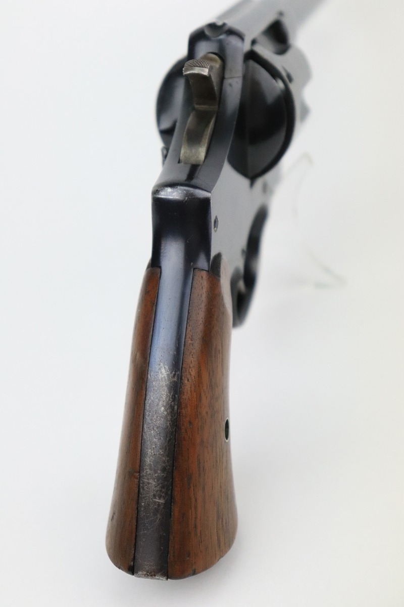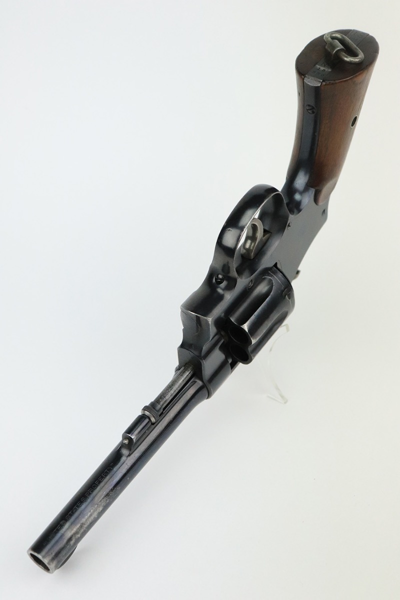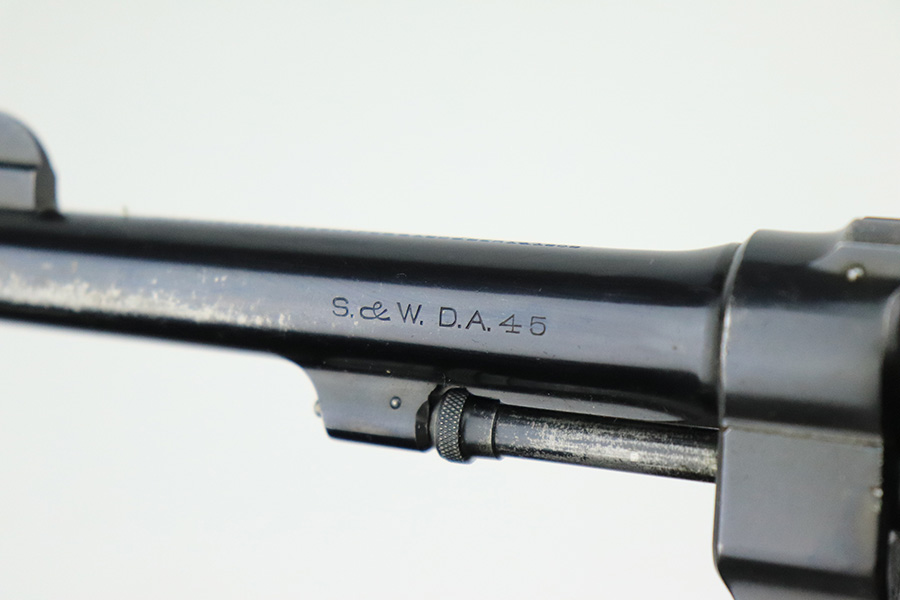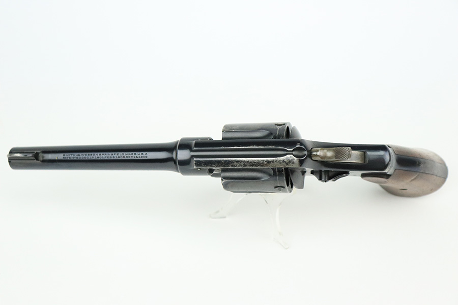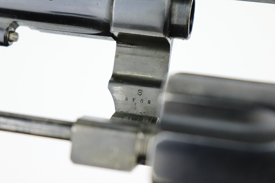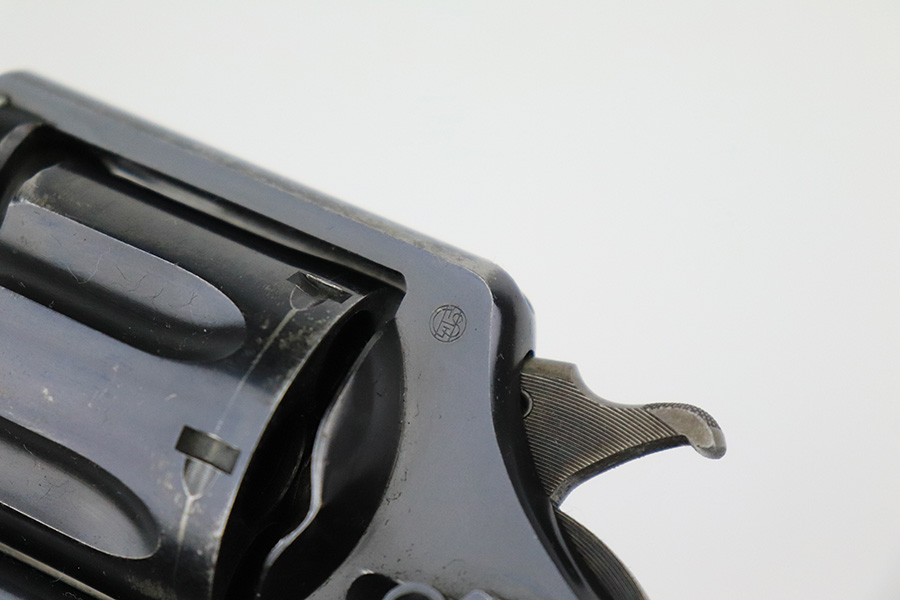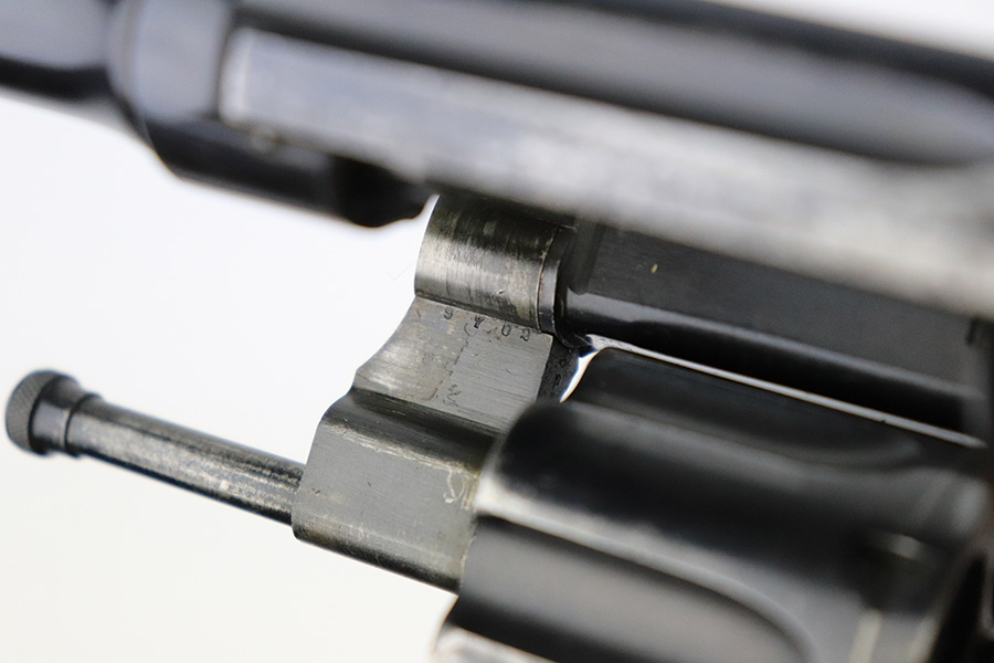 8/1/22 – This is an original, fairly early Smith & Wesson Model 1917 from WW1. It’s a scarce sub-variation with early hammer showing a concentric circle design. The revolver is all matching and original with ~80% of the polished blue remaining. Most of the wear is on either side of the barrel and back of grip frame, with some additional wear on the cylinder. The frame is military inspector marked and the barrel is marked ‘UNITED STATES PROPERTY’. Matching numbers throughout. Unmarked grips. Nice bore with just a little frost.