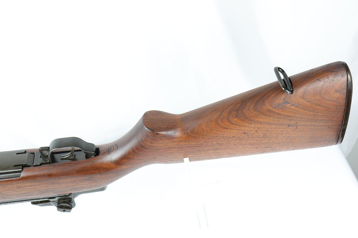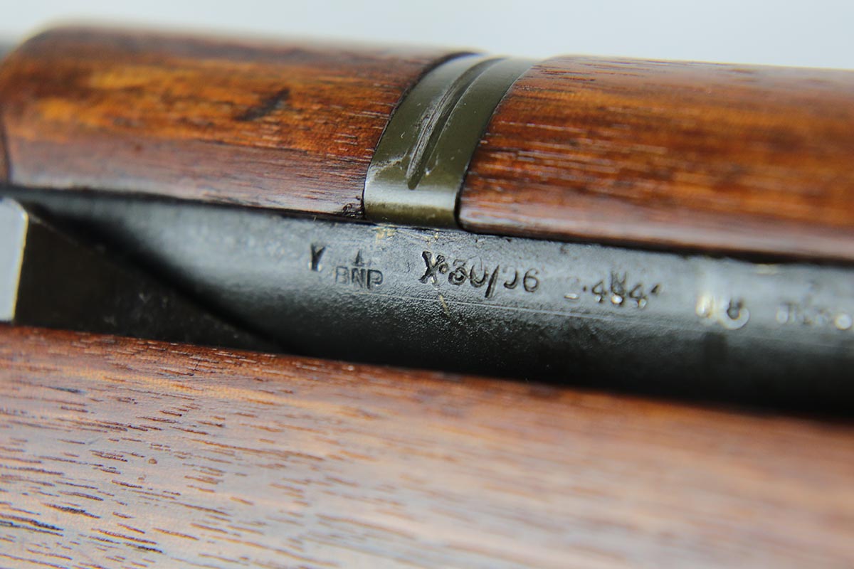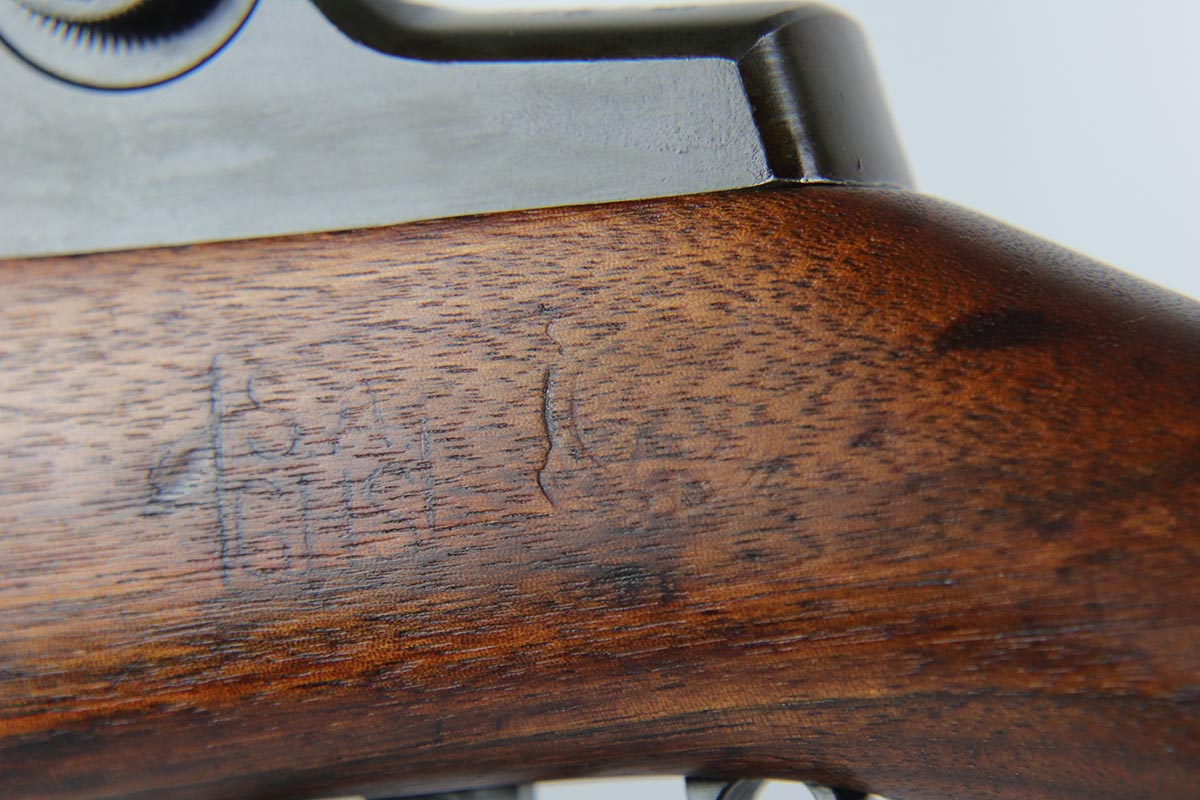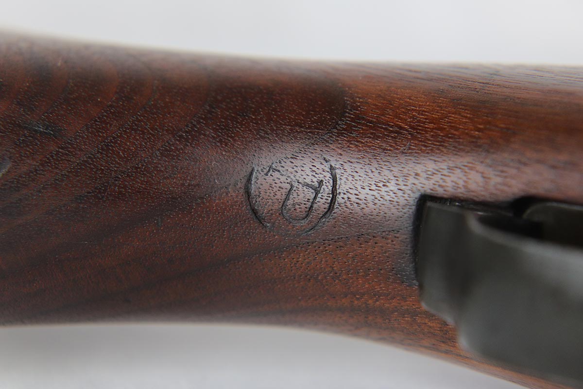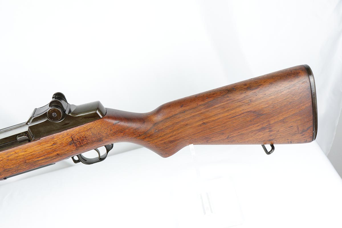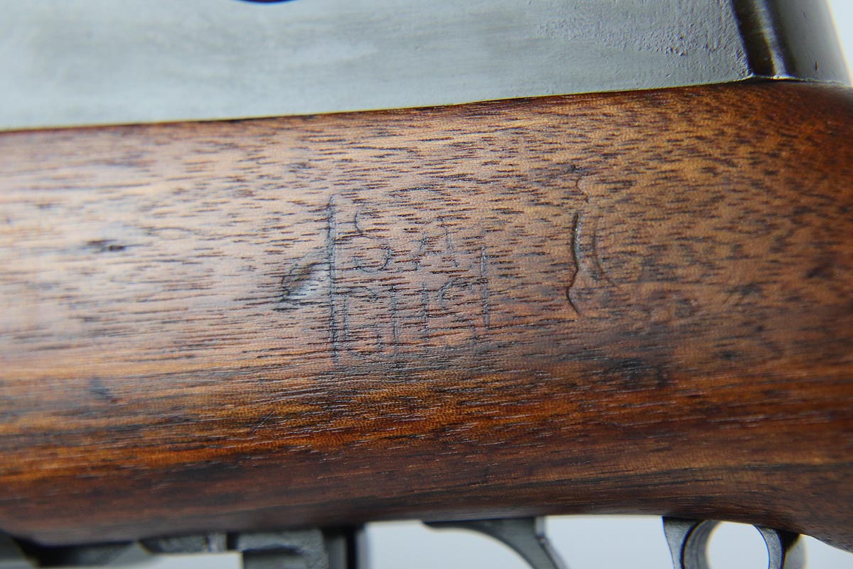 3/12/18 – This is a great example of an early WWII M1 Garand rifle, made in March of 1942. Non-reworked examples of the early garands are very uncommon as most went through three years of war and were then reworked and used in the Korean War as well. The only unmolested examples of the early guns can be found in the batch of Lend Lease guns shipped to England and then returned to the US, most likely in the 50s. This is one of these rifles, with British BNP proofs on the barrel, which is dated properly with an upside down S-A-3-42 date. It has all the correct internal parts with the ‘drawing’ numbers all dating to 1942. The stock is marked with an SA GHS cartouche and a large ‘ordnance wheel’ next to it. The serifed P in the circle is present on the pistol grip. The wood is superb with only a few scratches and minor dents. The gun has over 95% of the original green parkerizing on the metal. Bore has strong rifling with minor frosting but no corrosion. The rear sight is an original WWII lock bar type.