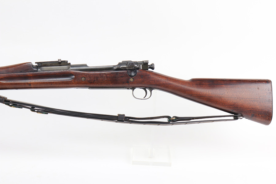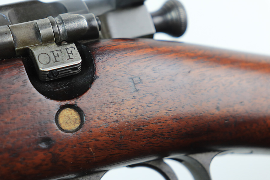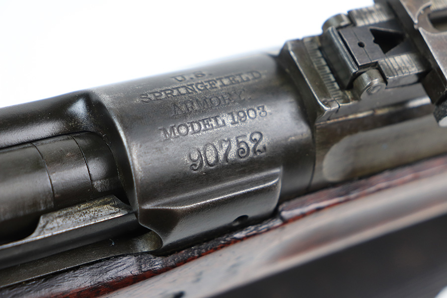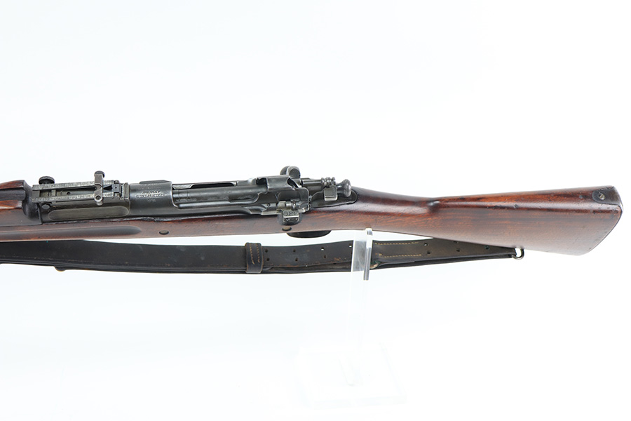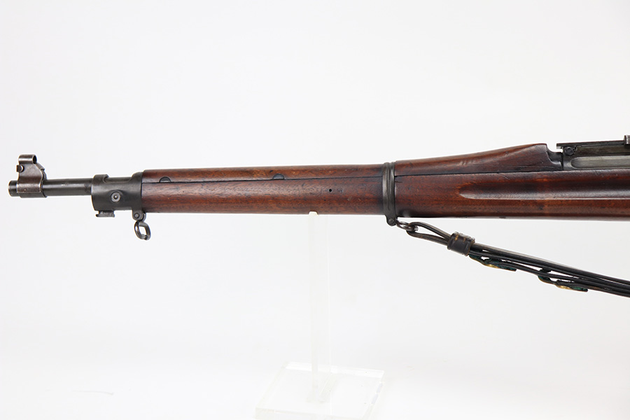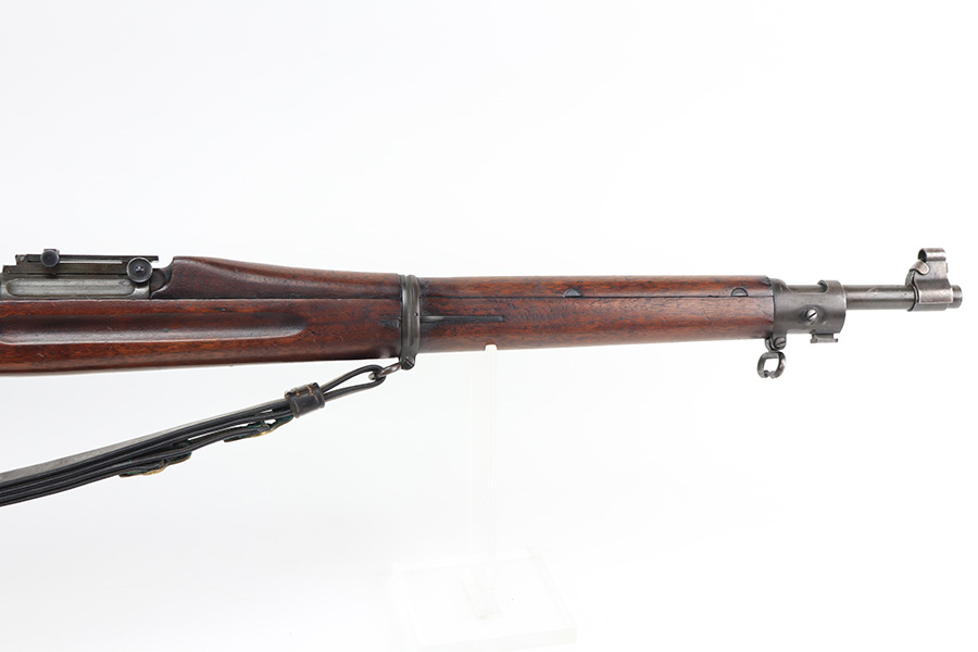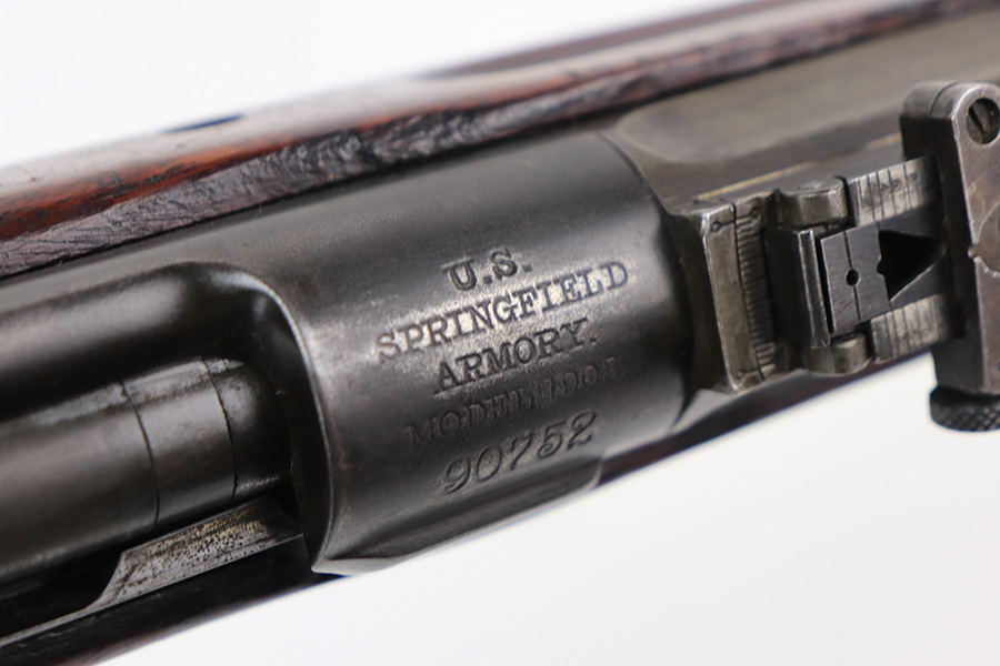 2/24/22 – This is a very nice example of an early Springfield M1903 rifle issued to the US military in 1905. It has a Remington bolt and an October 1918-dated barrel. Presumably, this gun was at least partially rebuilt for issue during WW1. It comes with an original front sight hood and leather sling. Overall, it has retained the majority of its finish. There is minor wear around the muzzle and some light streaks of wear on the barrel. Some light splotchy discoloration on the barrel and floor plate. Areas of minor thinning here and there on the receiver. The stock has a “P” proof on the wrist. Overall, it is in very nice condition with only minor bruises and handling marks here and there. The bore has decent rifling with minor pitting throughout.
