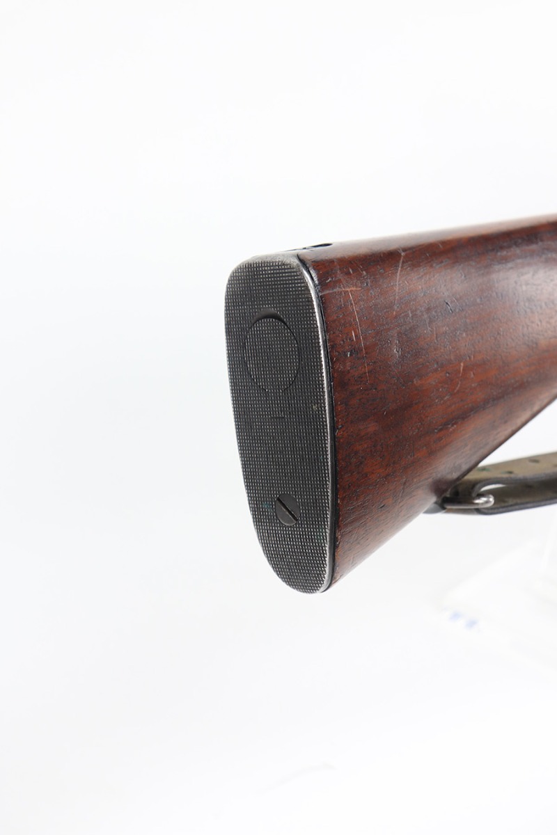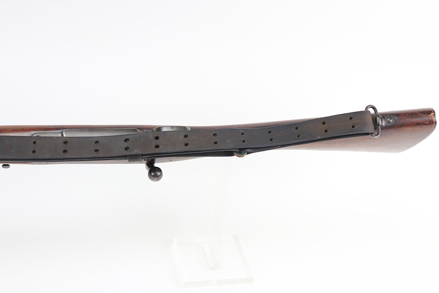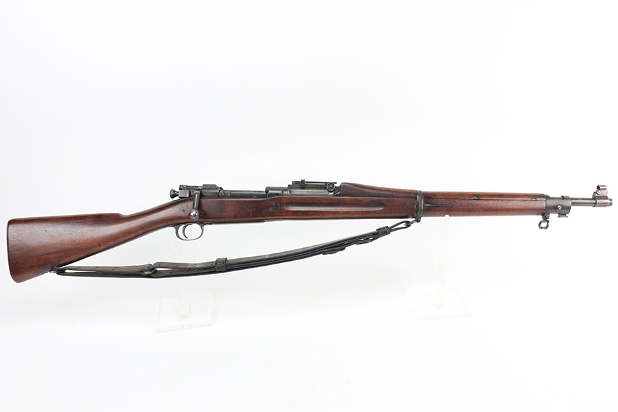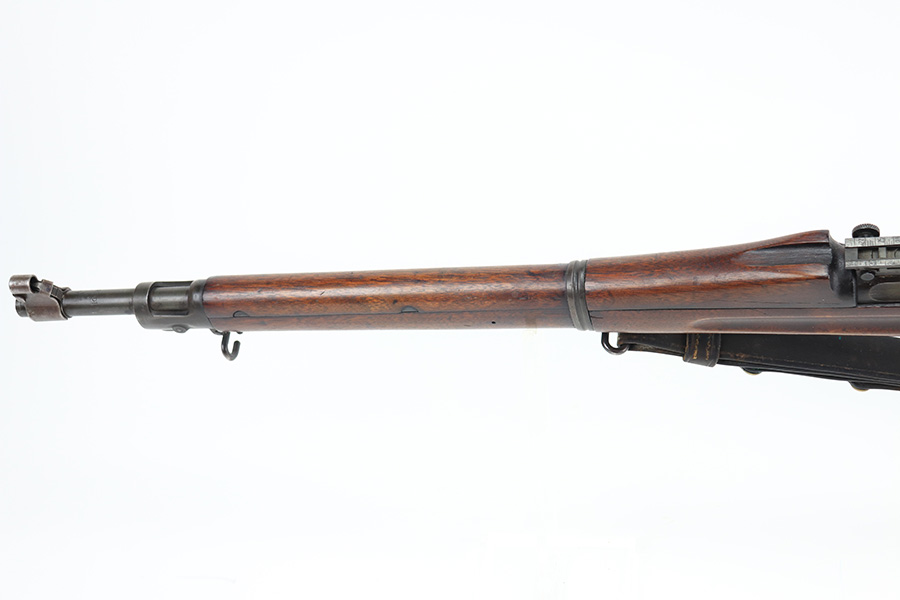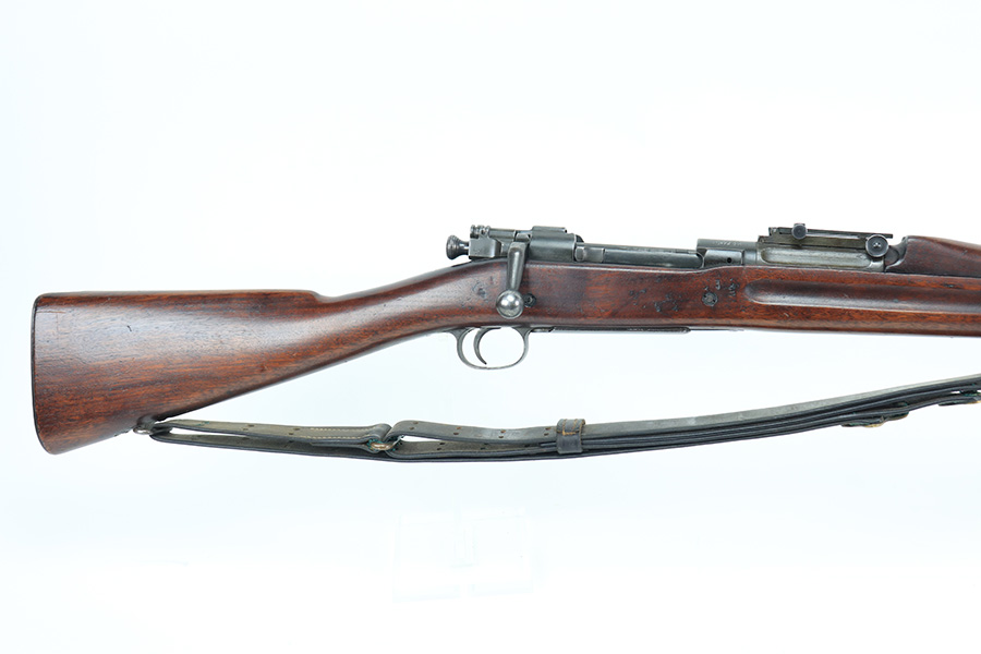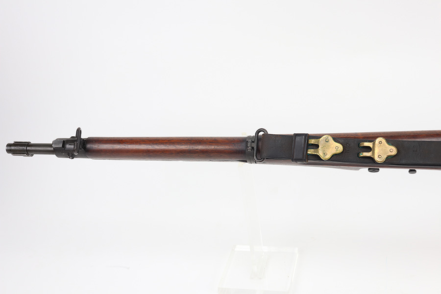 2/24/22 – This is a very nice example of an early Springfield M1903 rifle issued to the US military in 1905. It has a Remington bolt and an October 1918-dated barrel. Presumably, this gun was at least partially rebuilt for issue during WW1. It comes with an original front sight hood and leather sling. Overall, it has retained the majority of its finish. There is minor wear around the muzzle and some light streaks of wear on the barrel. Some light splotchy discoloration on the barrel and floor plate. Areas of minor thinning here and there on the receiver. The stock has a “P” proof on the wrist. Overall, it is in very nice condition with only minor bruises and handling marks here and there. The bore has decent rifling with minor pitting throughout.
