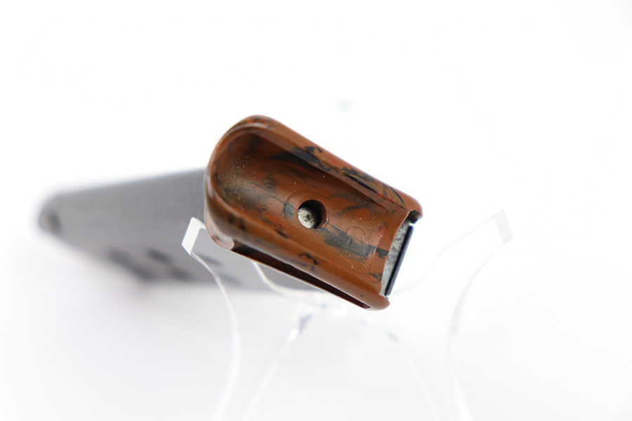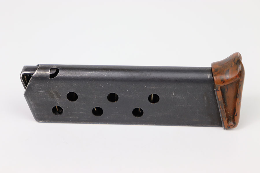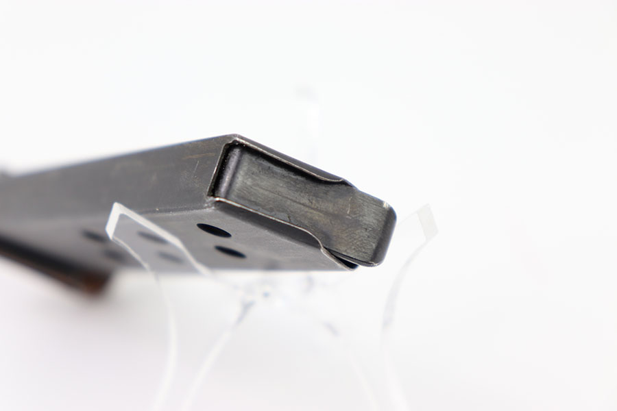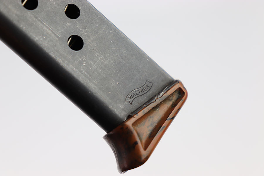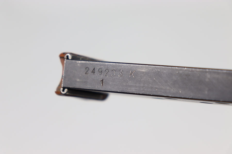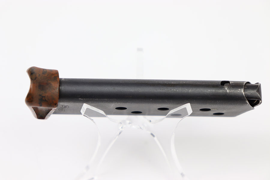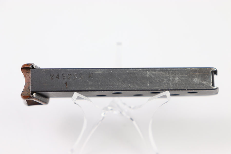 1/31/24 – This is a rare SS model Walther PPK magazine with an early finger extension. This example is in near minty condition with most of its original dull finish. The magazine has minimal wear with only some around the top edge of the tube. The left side of the tube is stamped with only Walther’s banner, which is expected for this early variation. The brown bakelite finger extension base is the early thin-lipped variation with a black swirl pattern. The spine of the magazine is numbered, “249233K” with a “1” below it, indicating it is the number 1 magazine for a SS model PPK. Spring is strong and functional on this beautiful piece.