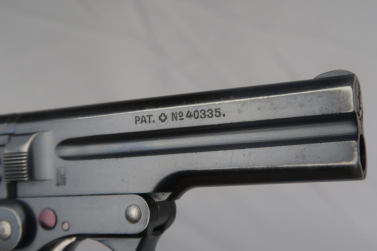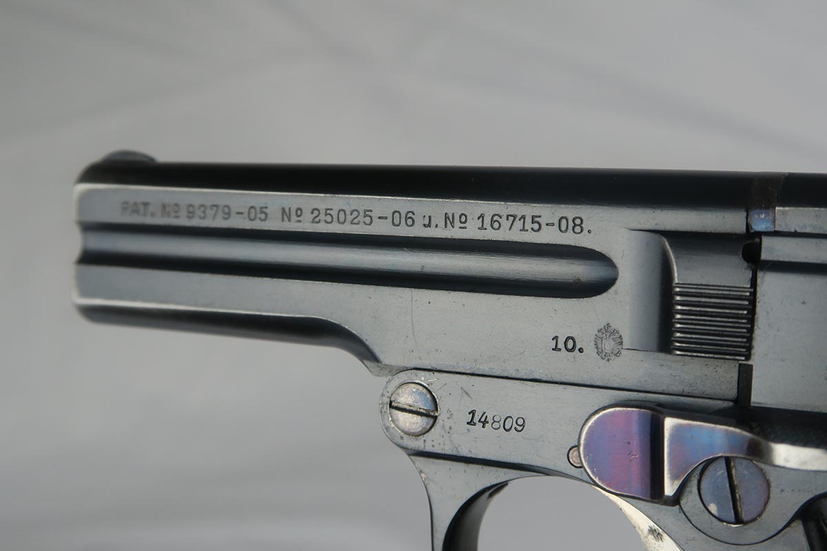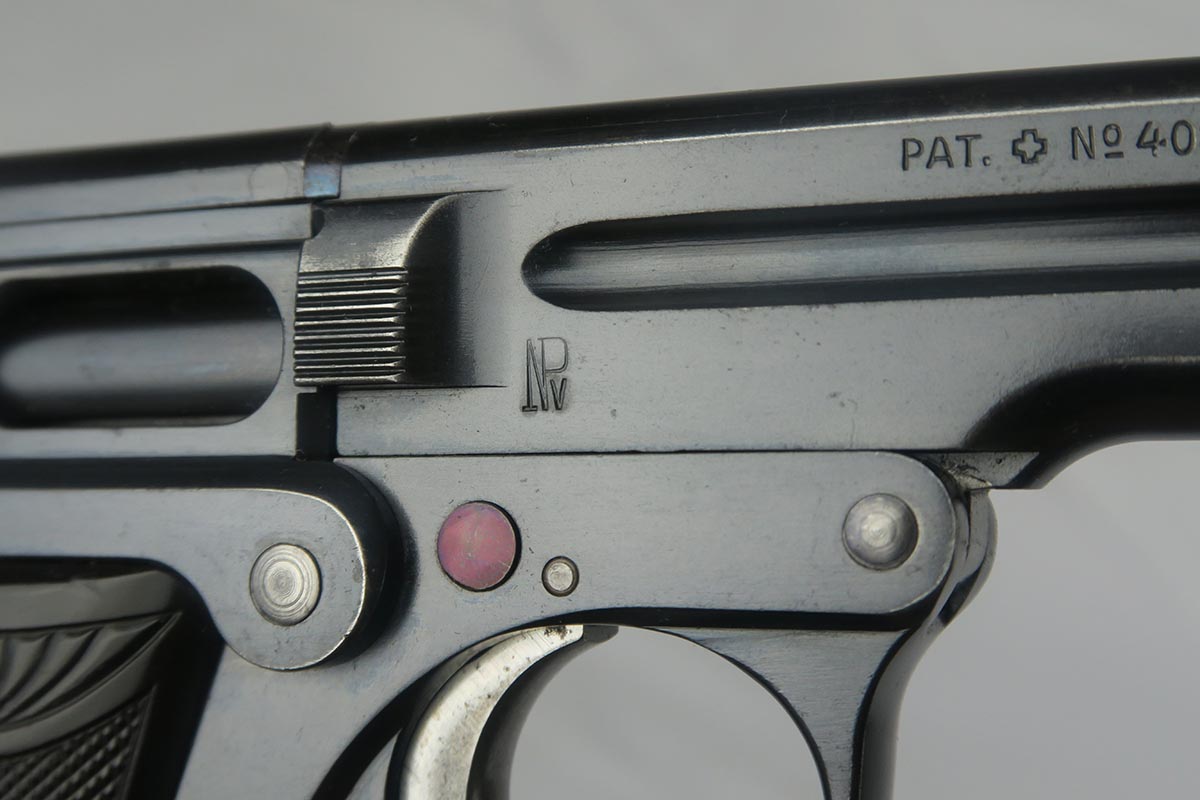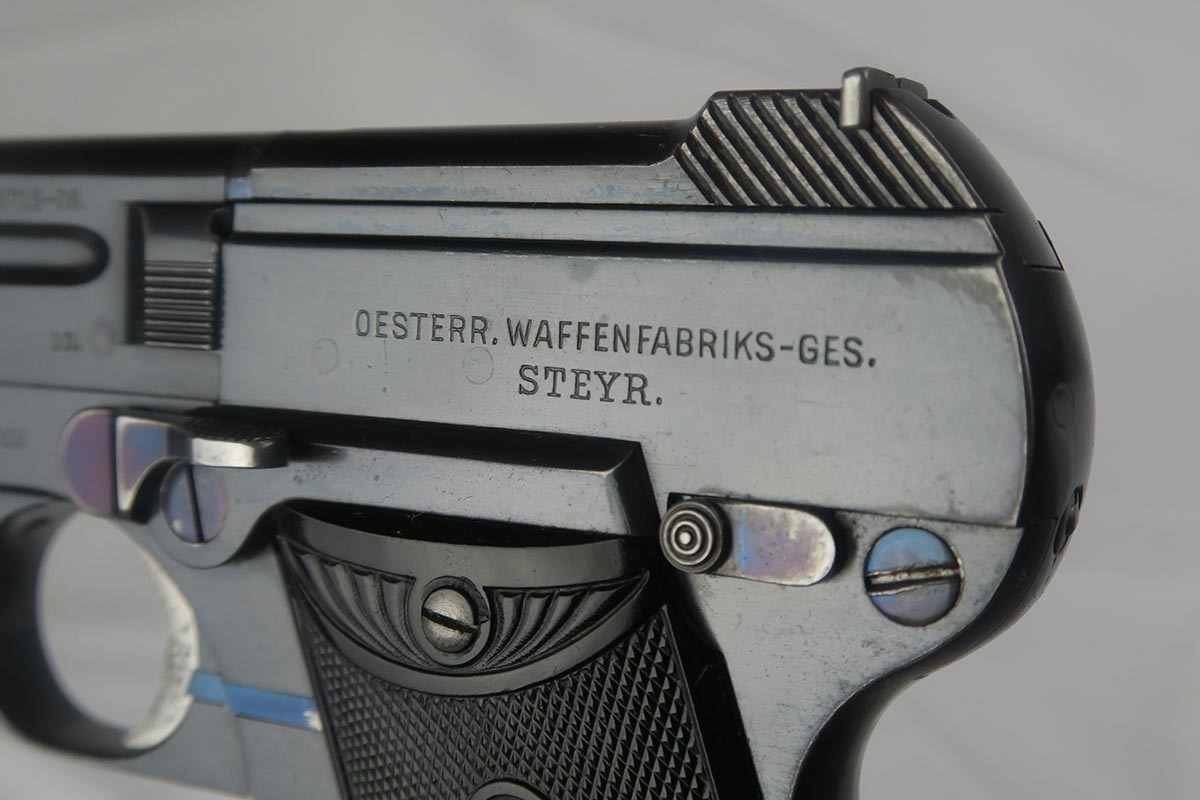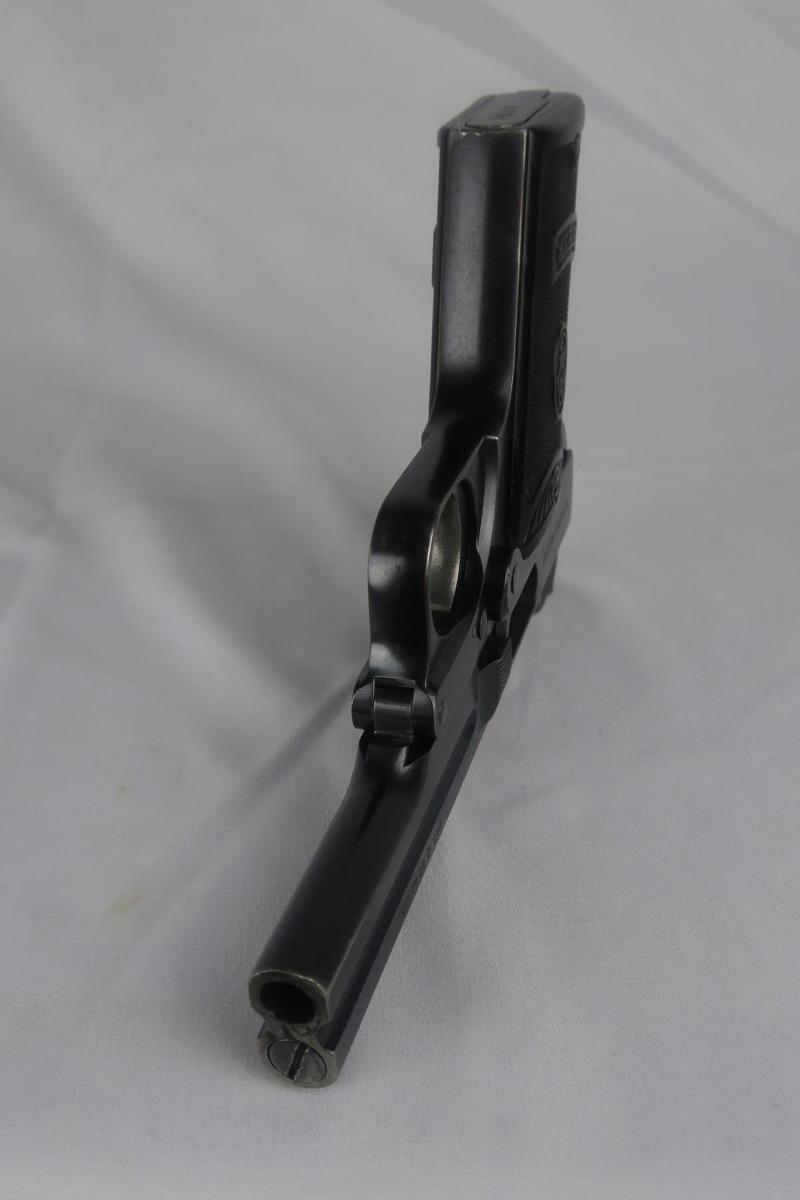 9/13/17 – This is an early Austrian Steyr Pieper model 1908 pistol in all original configuration. The polished blue rates at about 96% with some browning on the straps and a little wear on the muzzle and trigger guard. The pistol is ’10 dated, and production only started in 1909 but continued through until 1929. These pistols are an unusual blowback type with tip-down barrel. The barrel is retained with a pivoting bolt and is held by a thumb latch barrel-locking mechanism. Manufacture started in 1909 and was suspending in 1911, then resumed in 1919 and wrapped up in 1929. The thumb latch still shows a pretty fire blue. The grips are in very good condition with no cracks or chips. The magazine is correct and numbered on the bottom, but to another pistol. Bore is mint.