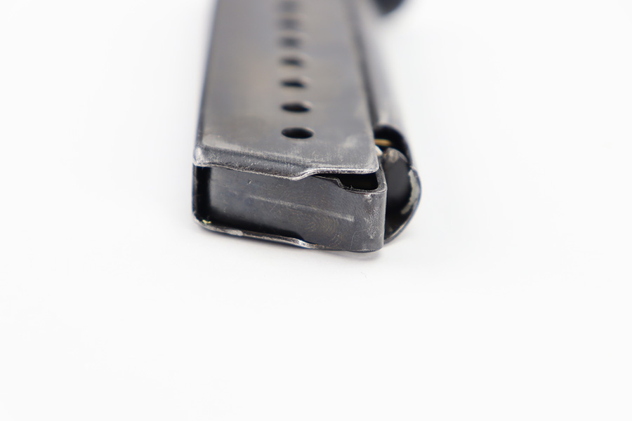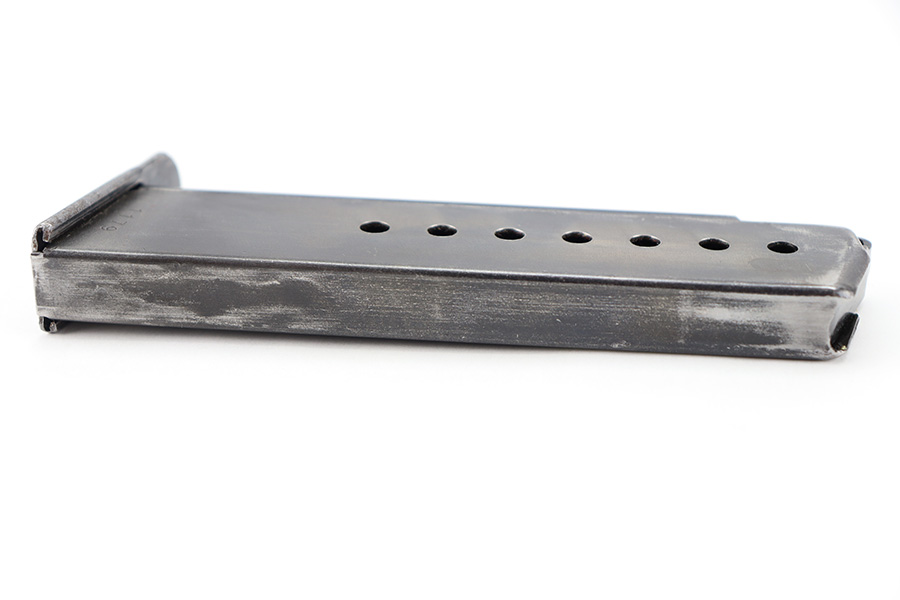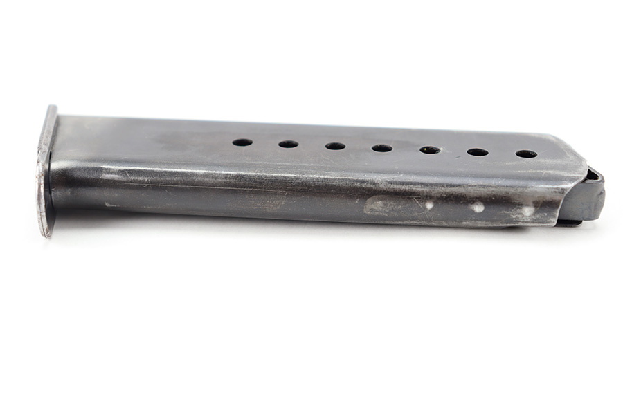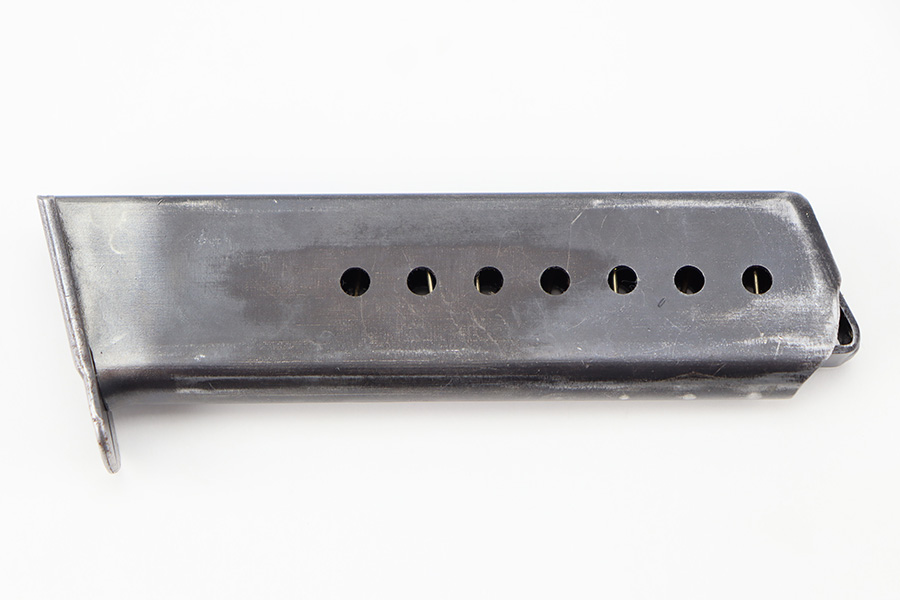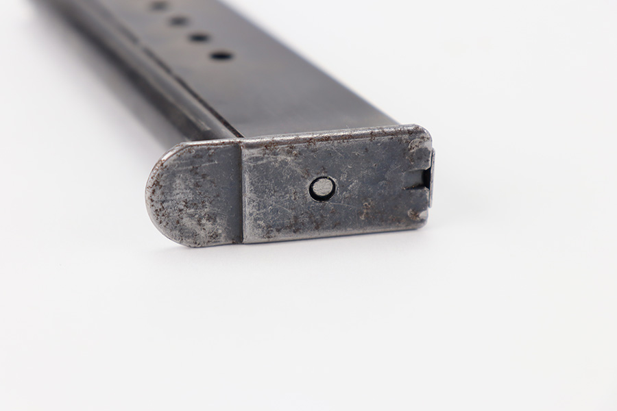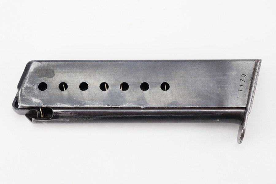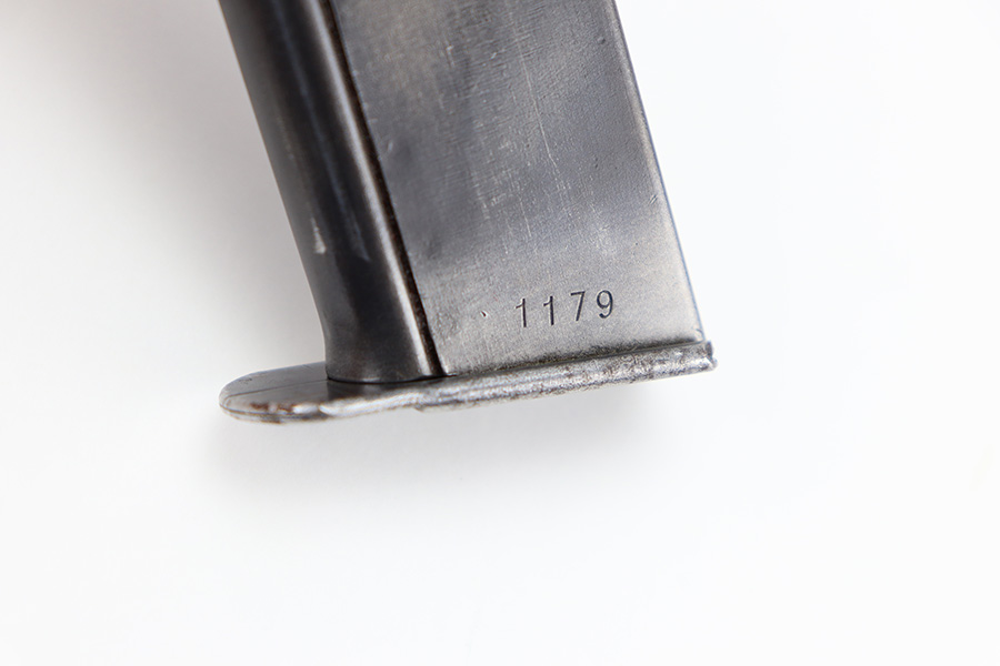 11/16/23 – This is an early Swedish contract HP P.38 magazine. The magazine is serial numbered on the left side of the tube, 1179 with no other markings or stamps. The finish is thinning and missing in areas throughout the tube and base. The base is a later “step” style, instead of an early flat base. No rust or pitting, but natural surface patina and light wear as shown. The spring is strong and fully functional.
