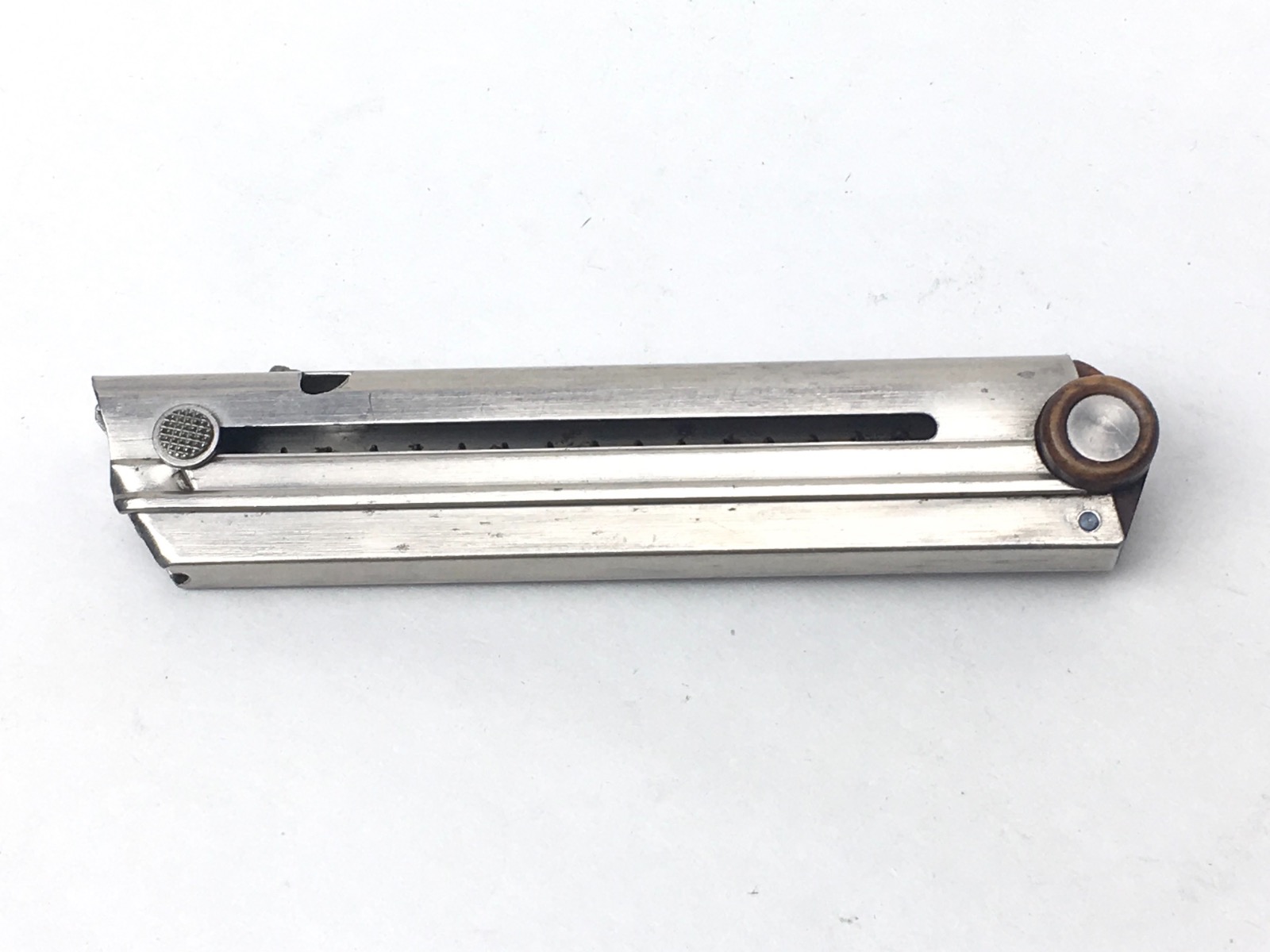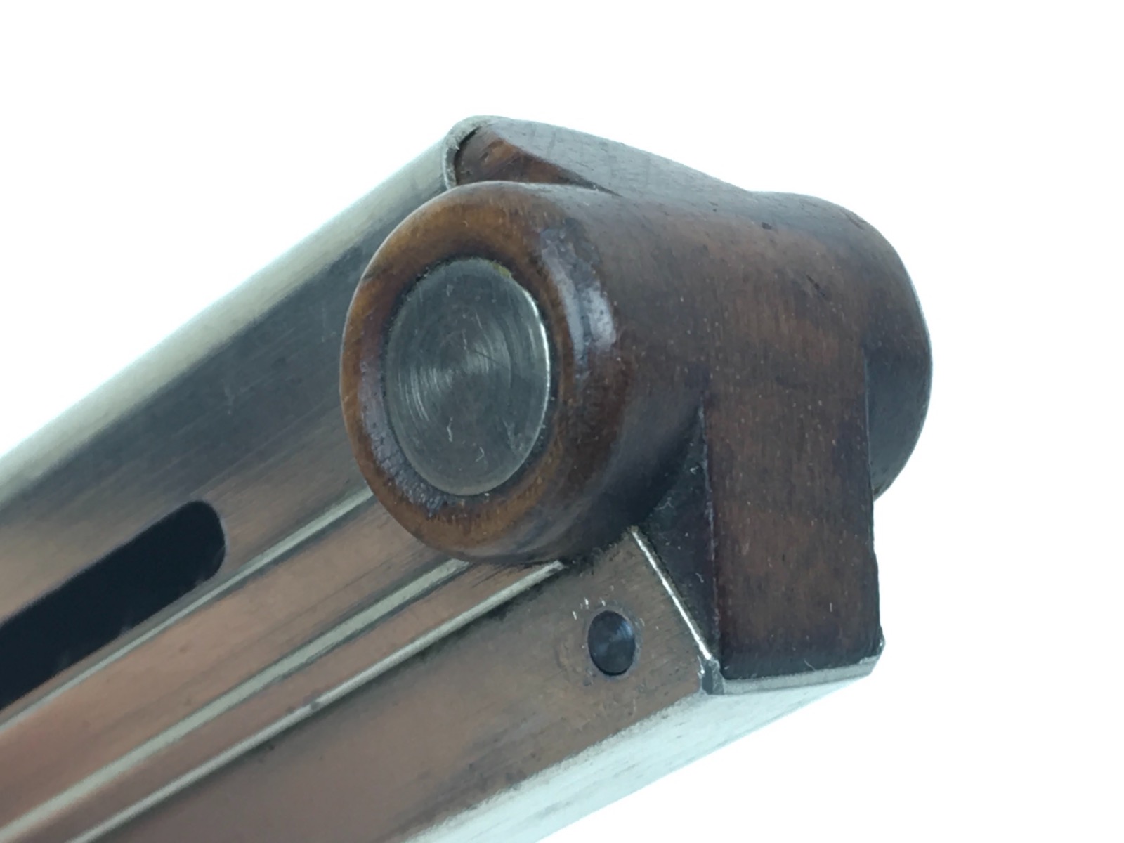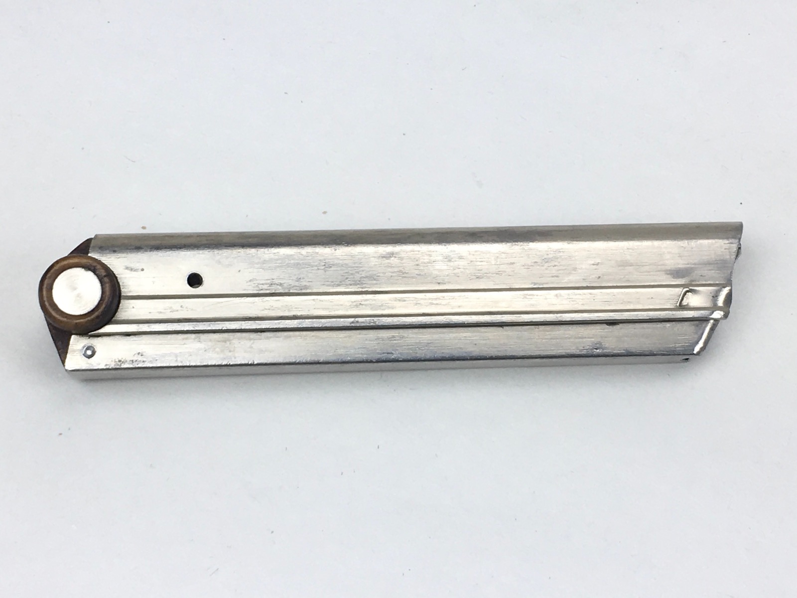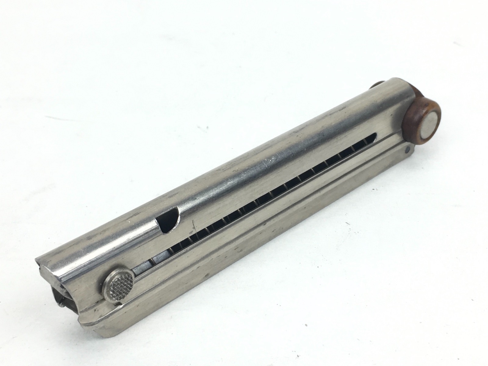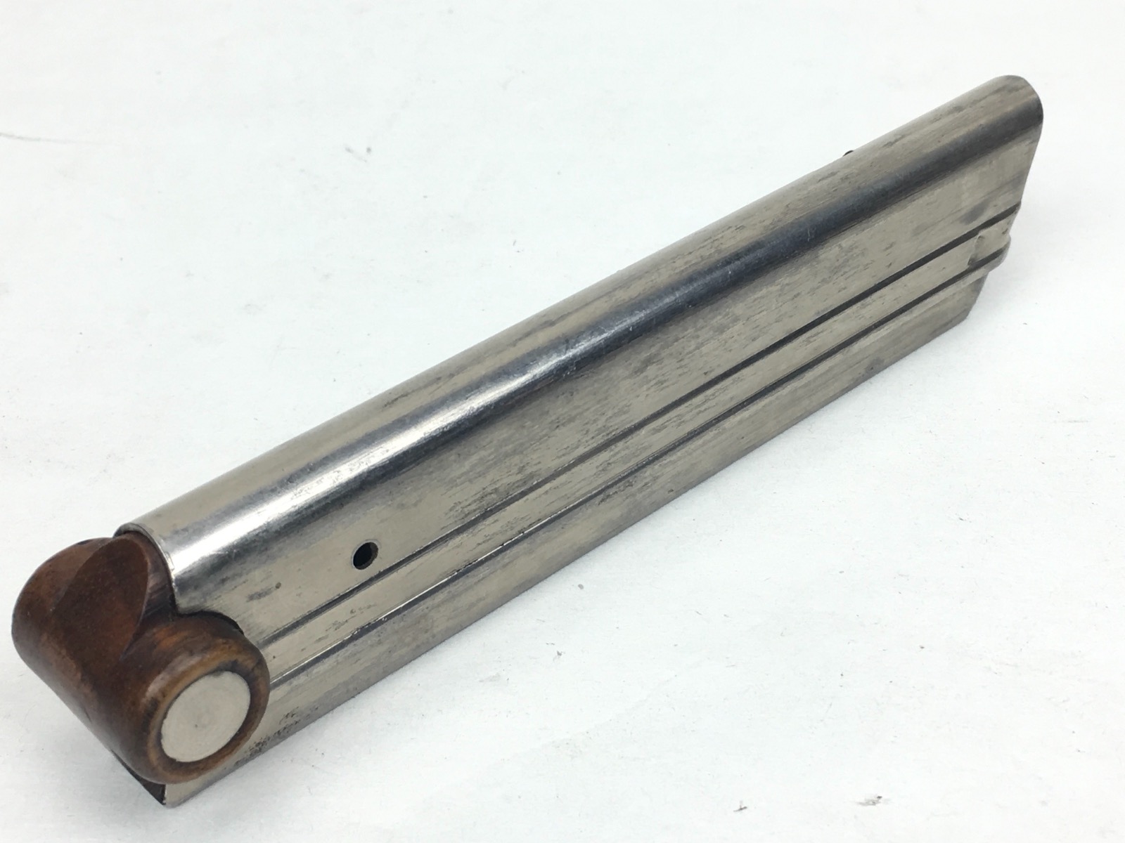 3/12/19 – This is an original Swiss Luger magazine manufactured for a 1900 to 1906 DWM Swiss Luger. The bottom of the magazine is wood with metal inlays. The magazine is in near mint condition and has no markings. Has a very strong spring that is fully functional. Guaranteed original and authentic.