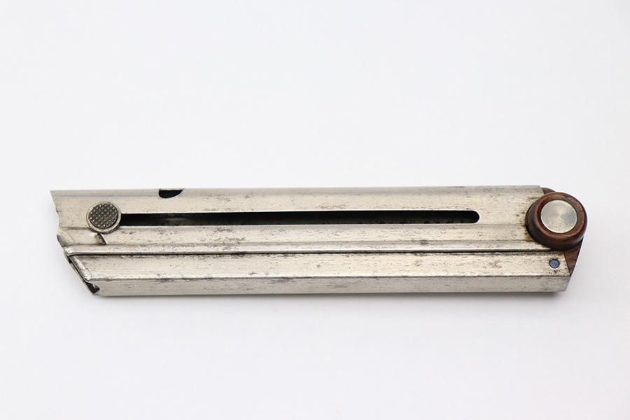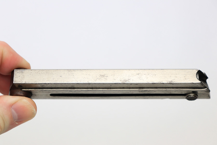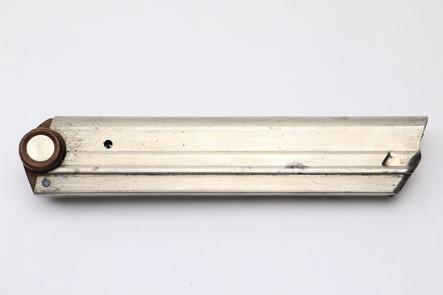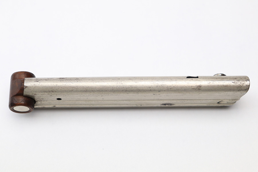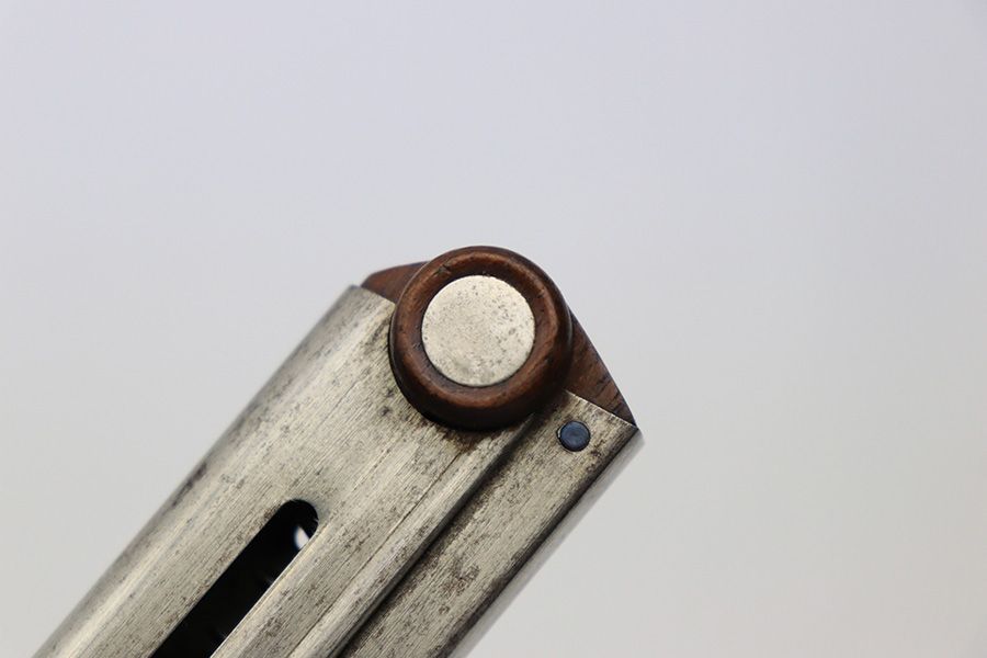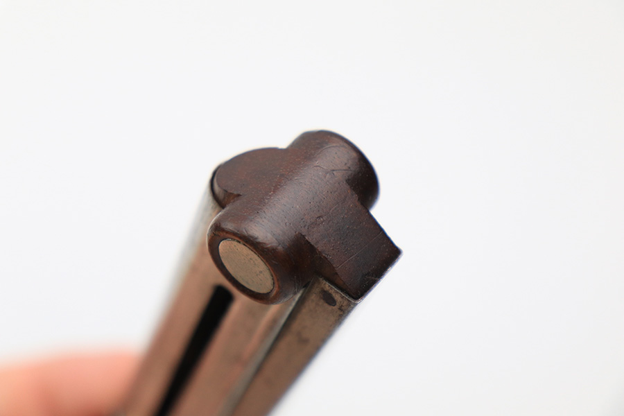5/6/22 – This is an original, early Swiss Luger magazine. The magazine features a wood base with metal inlays and a nickel tube. The tube has some dark patina spots, but these are mild. No rust or pitting and a fully functional spring. The base is unmarked and excellent condition.