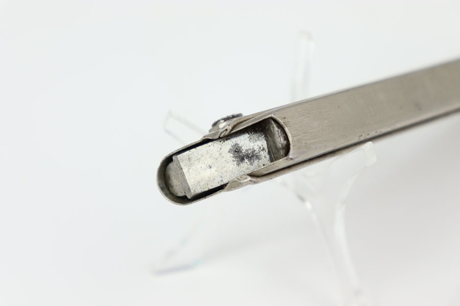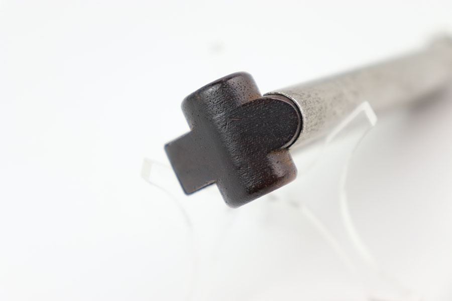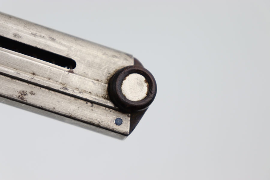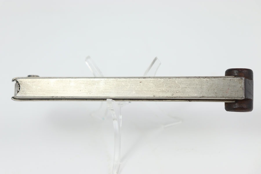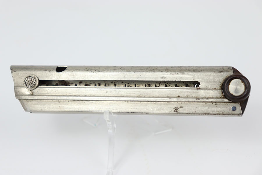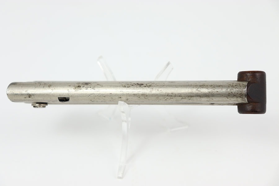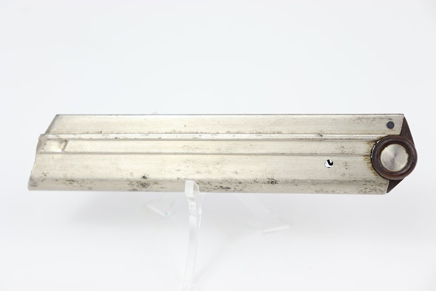 10/15/24 – This is an original, early Swiss Luger magazine. The magazine features a wood base with metal inlays and a nickel tube. The tube has some dark patina spots, but these are mild. No rust or pitting and a fully functional spring. The base is unmarked and great+ condition.