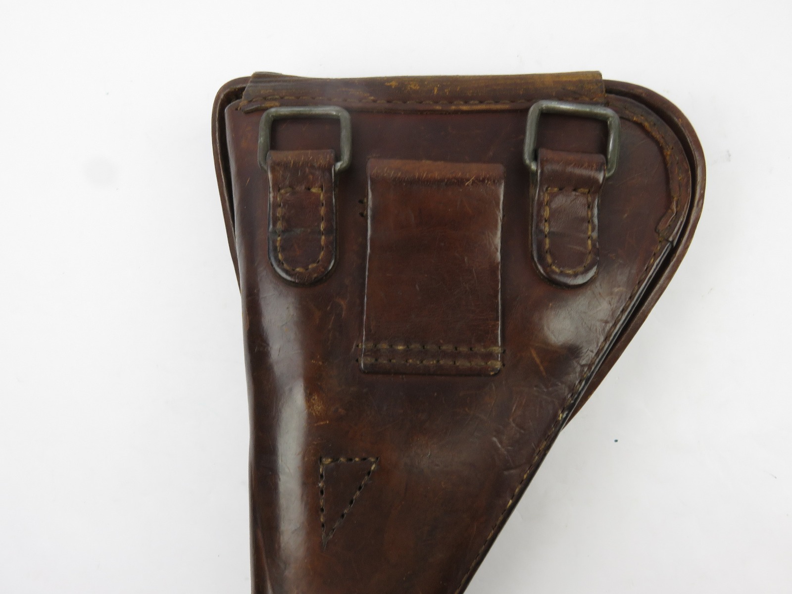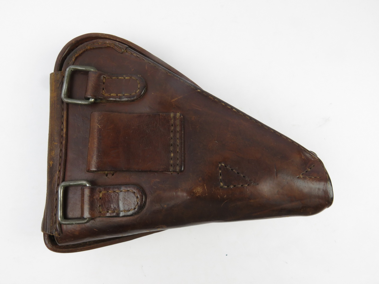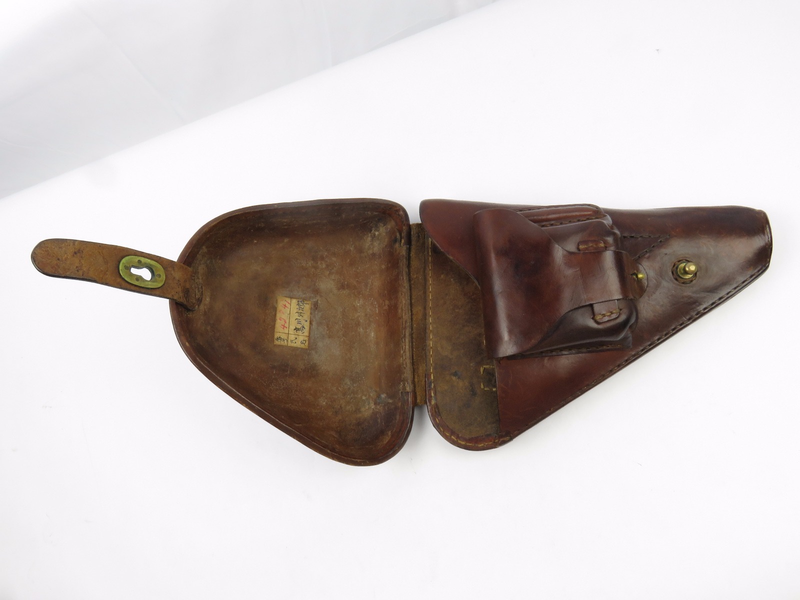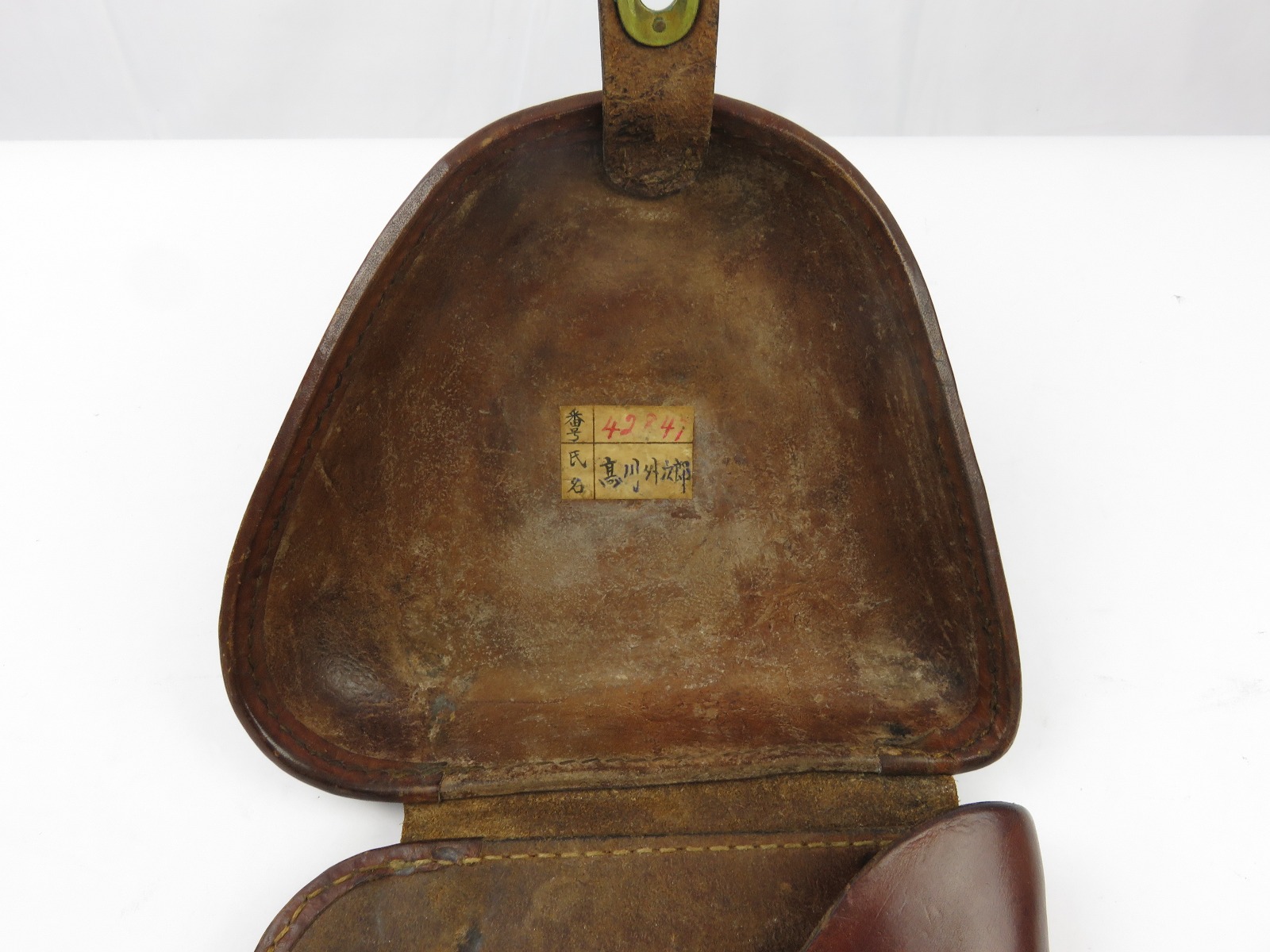 8/7/17 – This is an original early WW2 production Type 14 Nambu holster. The holster has early features like brass closure knobs and all leather construction. The leather has nice finish, all original and in tact. There is some surface scuffs and rub marks on the top leather, but this is normal wear. The interior leather is clean and has an original label completely in tact. The stitching is all tight and original with no major flaws. Guaranteed original.