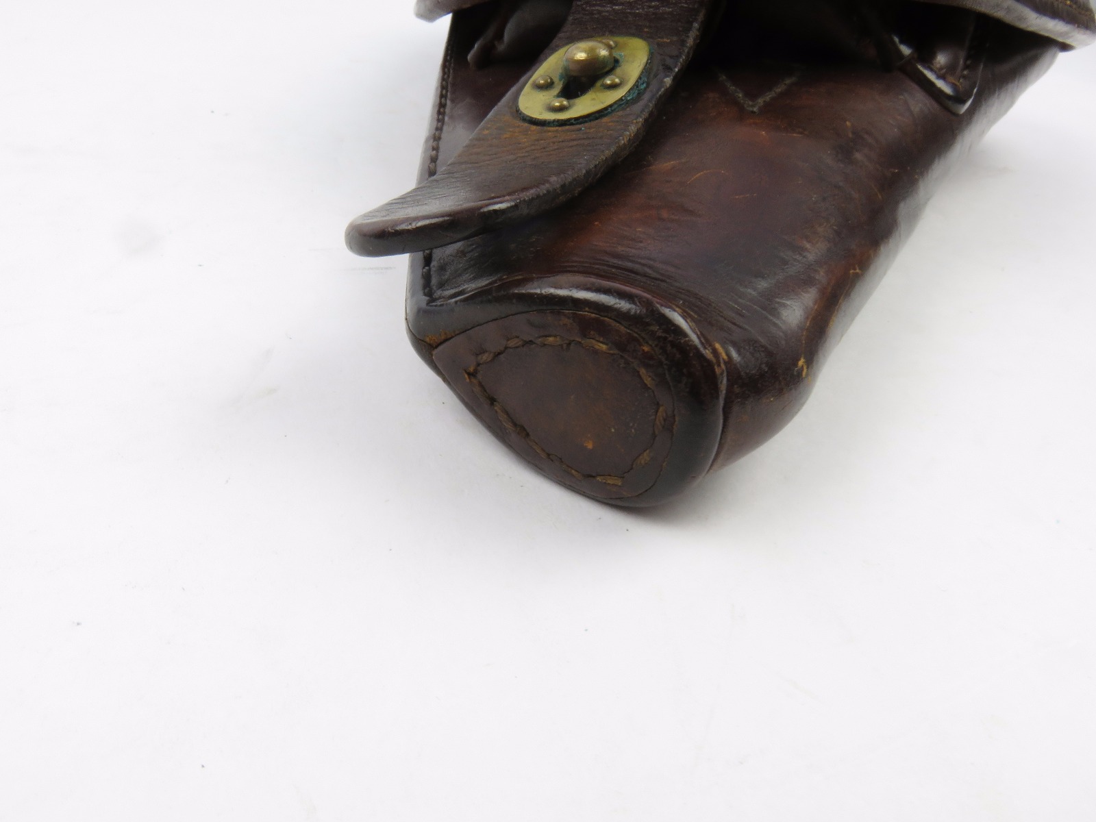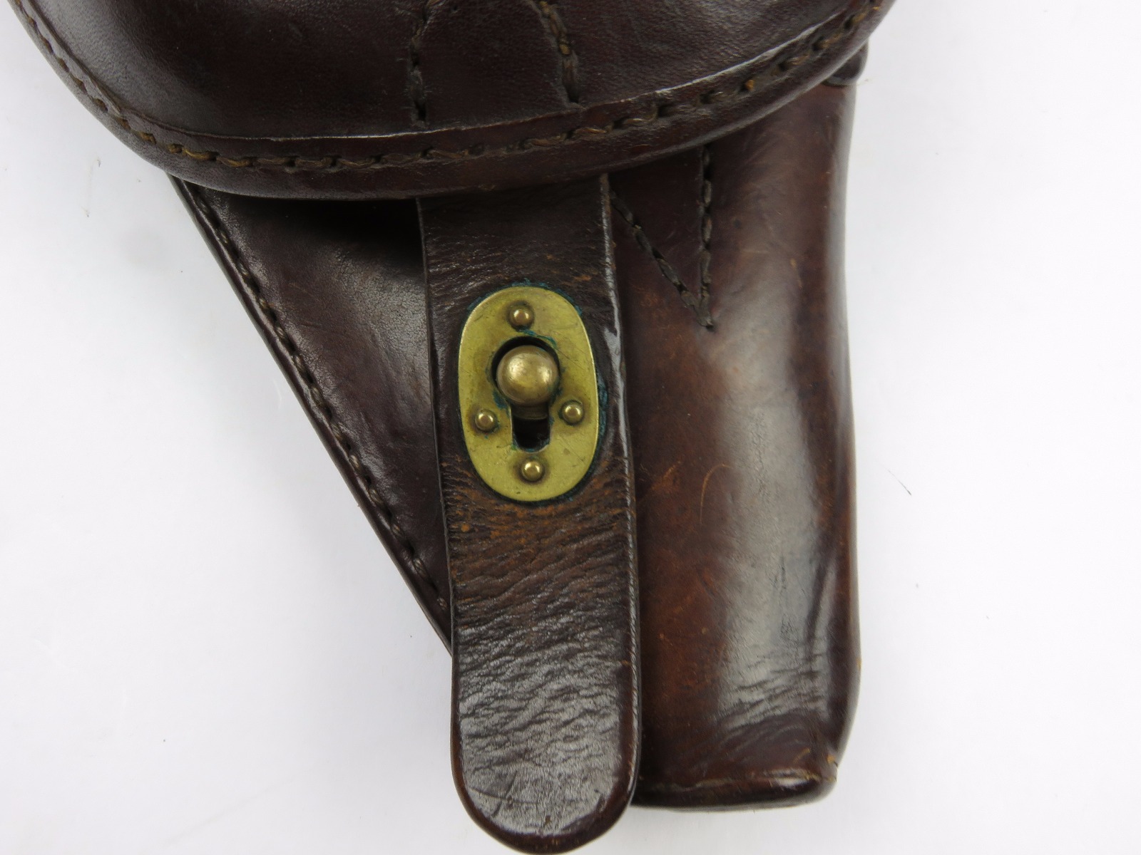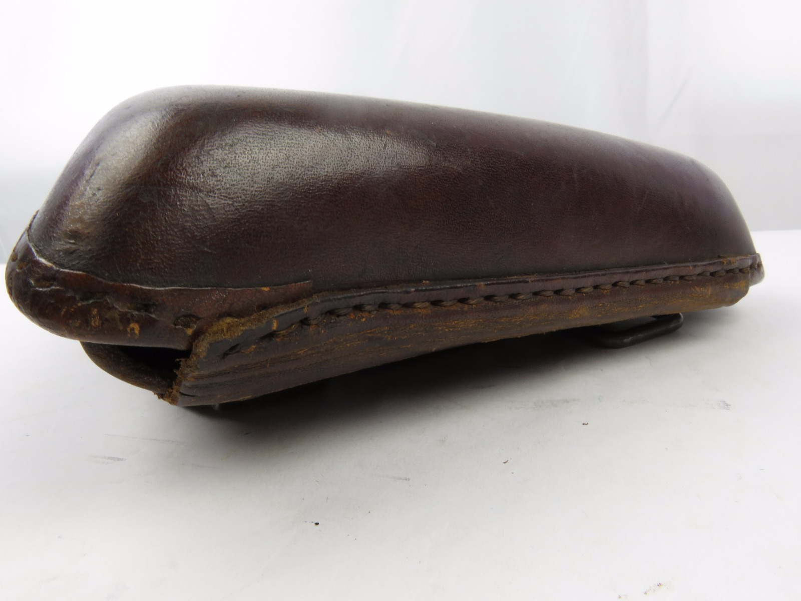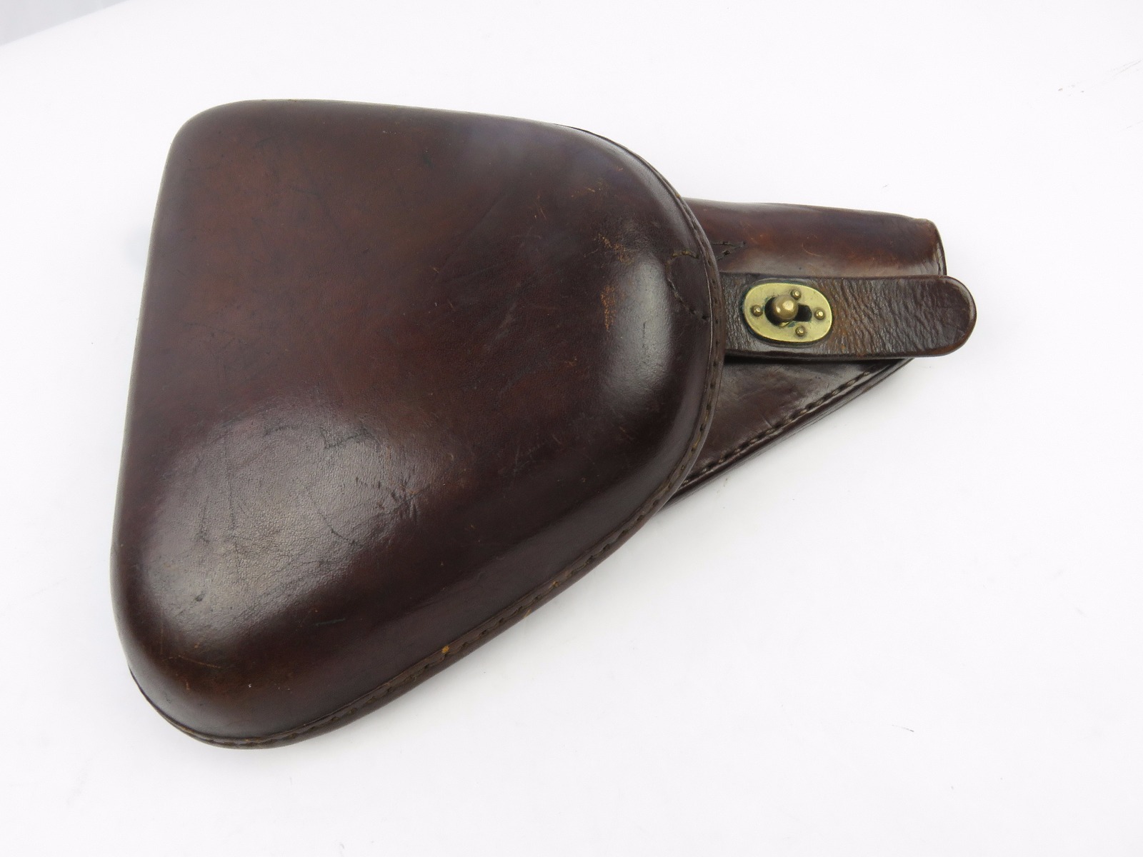 8/7/17 – This is an original early WW2 production Type 14 Nambu holster. The holster has early features like brass closure knobs and all leather construction. The leather has nice finish, all original and in tact. There is some surface scuffs and rub marks on the top leather, but this is normal wear. The interior leather is clean and has an original label completely in tact. The stitching is all tight and original with no major flaws. Guaranteed original.