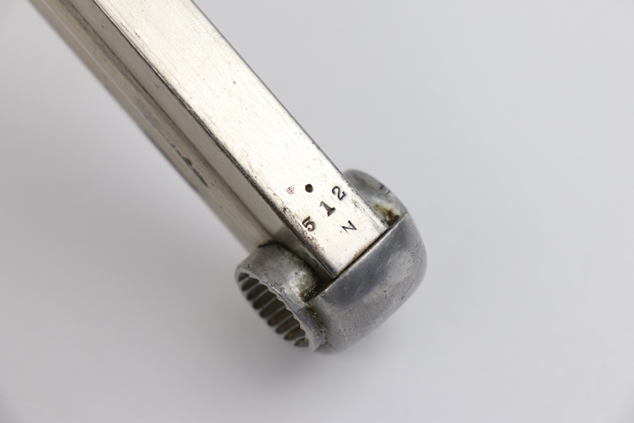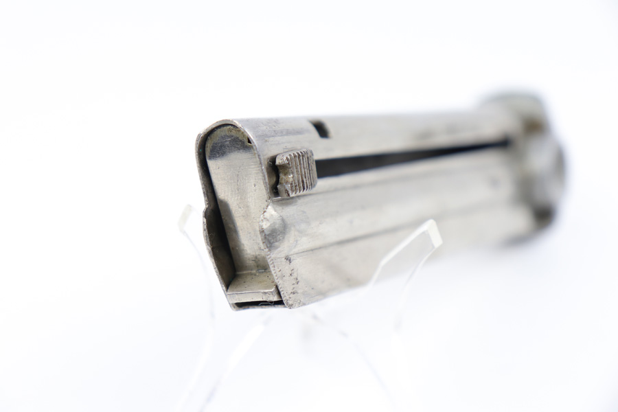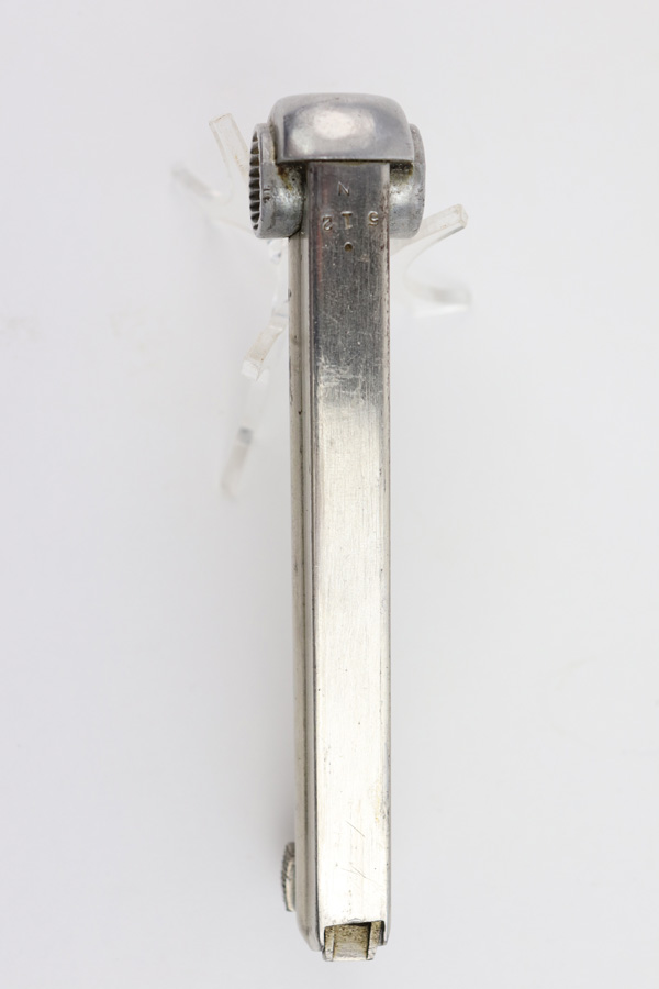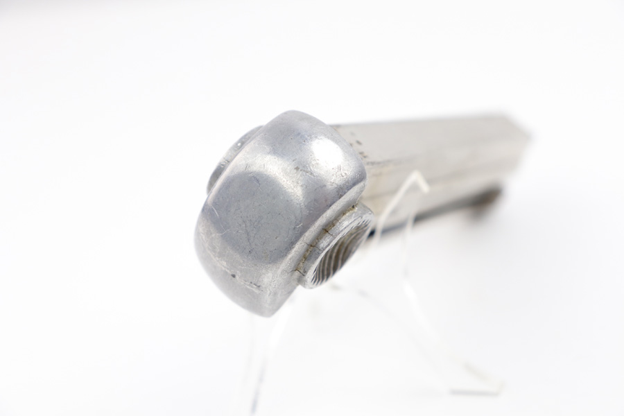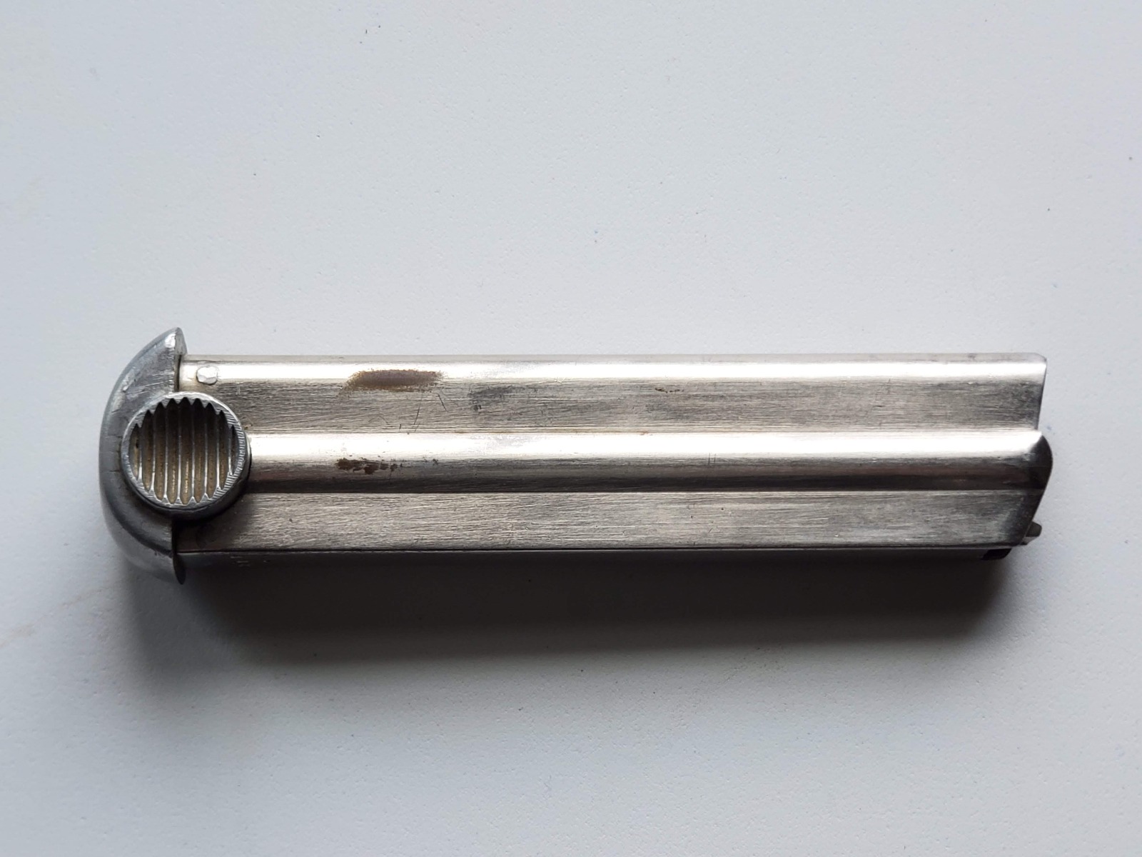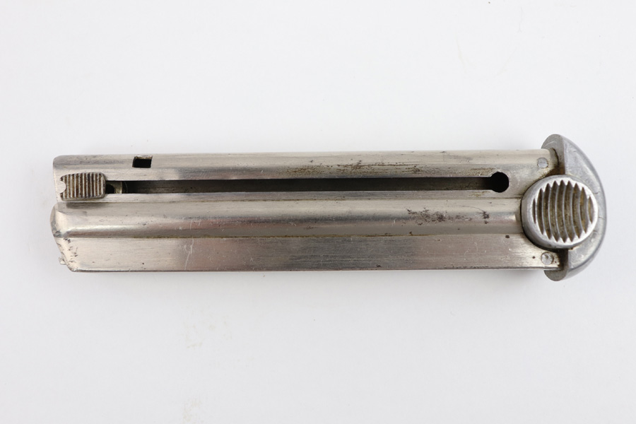 7/31/19 – This is an original, early variation T14 nambu magazine. The magazine has a nickel frame and aluminum base. The spine is stamped “512”. There are a few small areas of discoloration but overall great condition with no rust or pitting. Strong, fully functional spring as well.