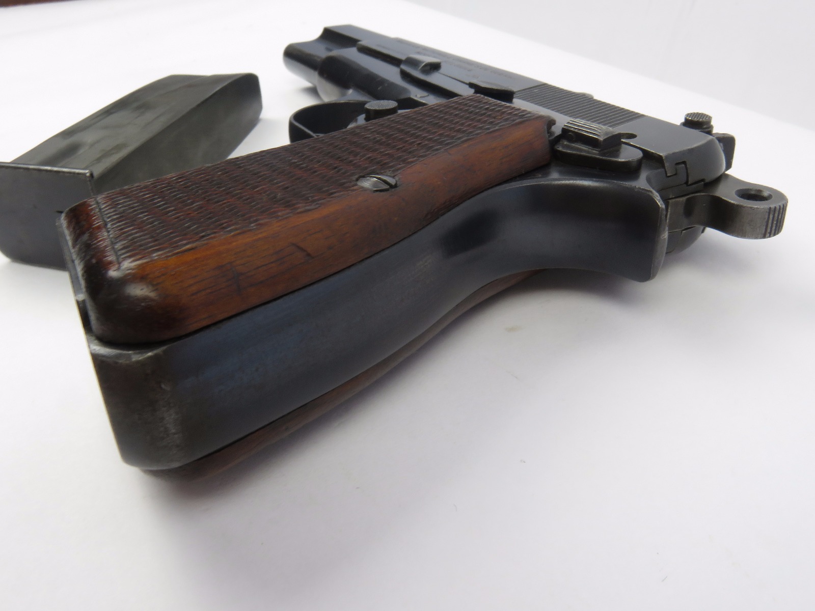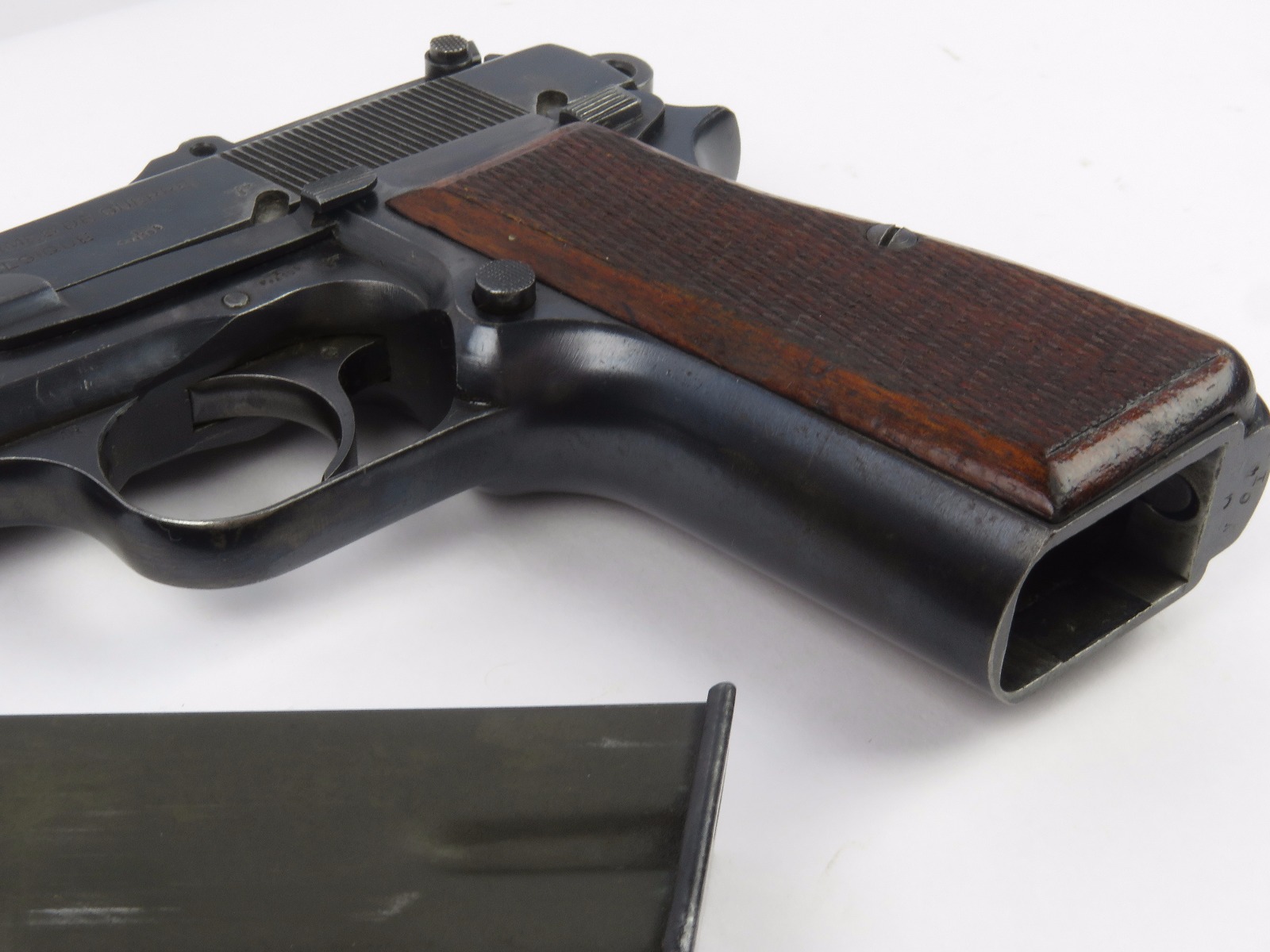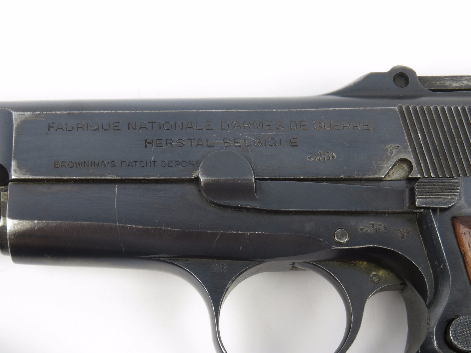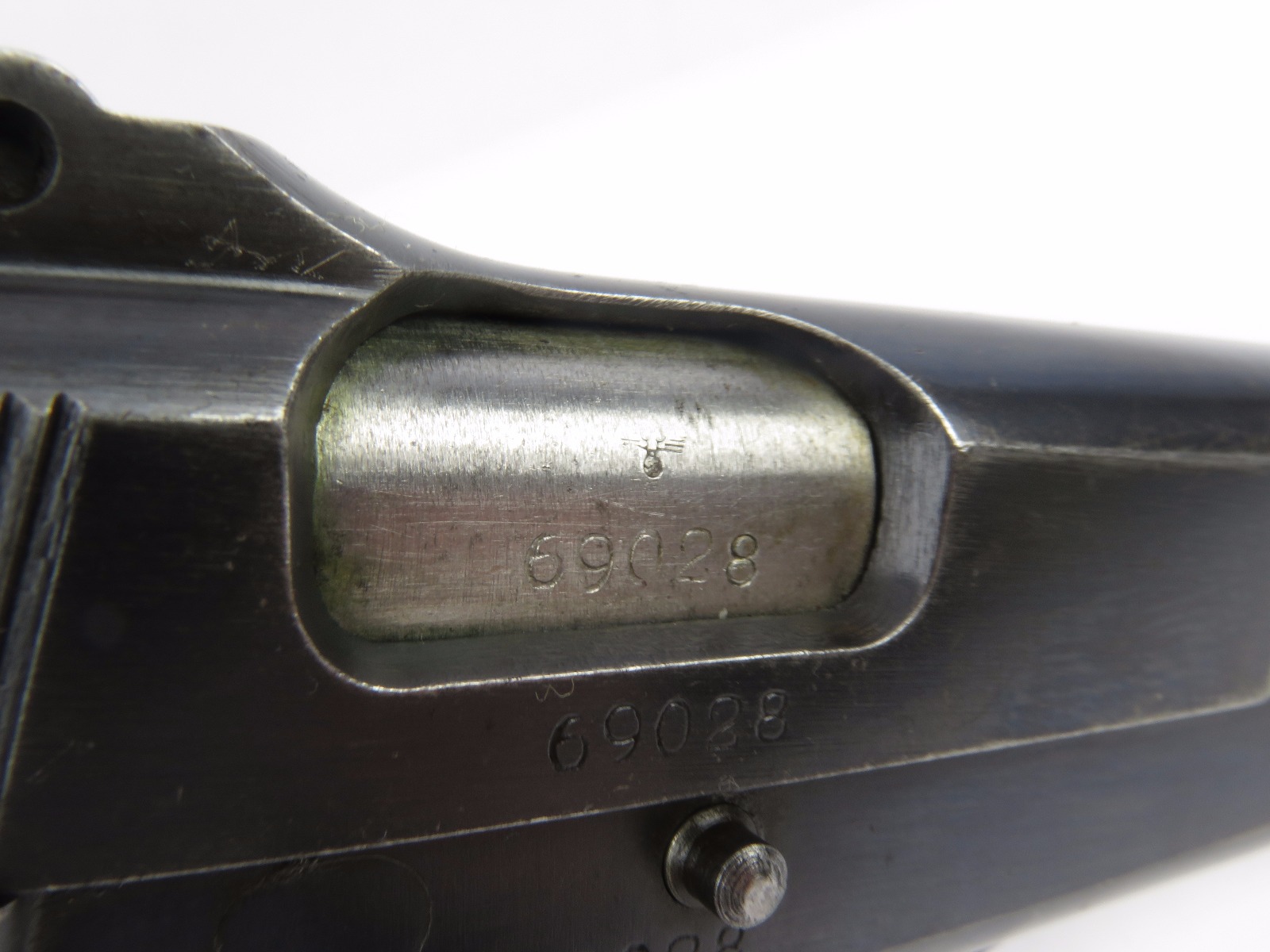 10/24/17 – This is an original FN Browning Hi-Power pistol with early Nazi occupation proof stamps. The frame and slide have waffen eagle WaA103 military proof stamps – this is an early and scarce waffen proof for Hi-Powers. The pistol also has an early tangent rear sight – a feature that was changed to a fix sight as the war went on. The pistol is in excellent condition, and overall we rate about 94% of the original finish remaining. There is edge wear on the slide, and some thinning/browning on the front and back straps. This is nice “honest” wear though and shows that the pistol saw some use during the war. The gun is fully functional with no mechanical issues, and a nice bore. We rate the bore at 7/10 though due to some patina throughout the rifling. The girps are original and excellent, and the magazine is waffen proofed.