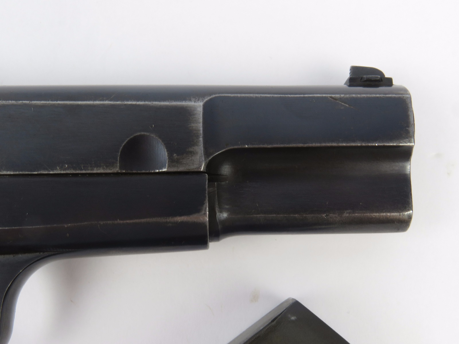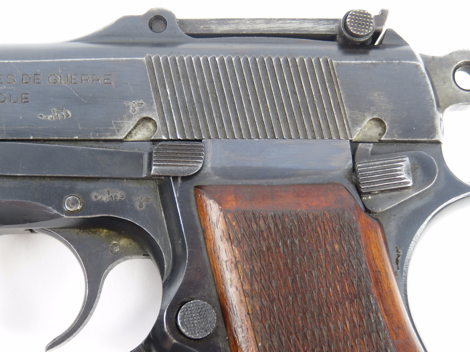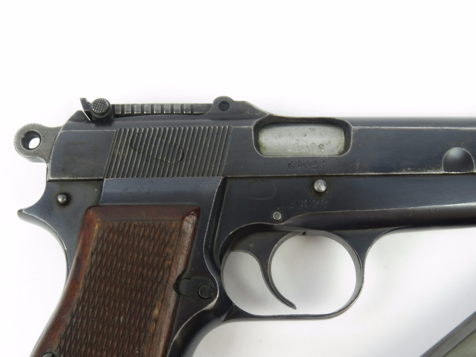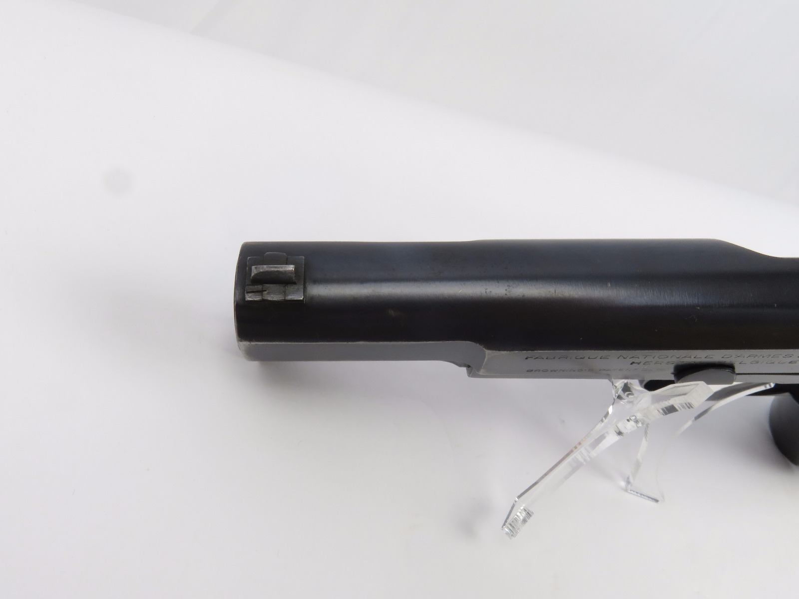 10/24/17 – This is an original FN Browning Hi-Power pistol with early Nazi occupation proof stamps. The frame and slide have waffen eagle WaA103 military proof stamps – this is an early and scarce waffen proof for Hi-Powers. The pistol also has an early tangent rear sight – a feature that was changed to a fix sight as the war went on. The pistol is in excellent condition, and overall we rate about 94% of the original finish remaining. There is edge wear on the slide, and some thinning/browning on the front and back straps. This is nice “honest” wear though and shows that the pistol saw some use during the war. The gun is fully functional with no mechanical issues, and a nice bore. We rate the bore at 7/10 though due to some patina throughout the rifling. The girps are original and excellent, and the magazine is waffen proofed.