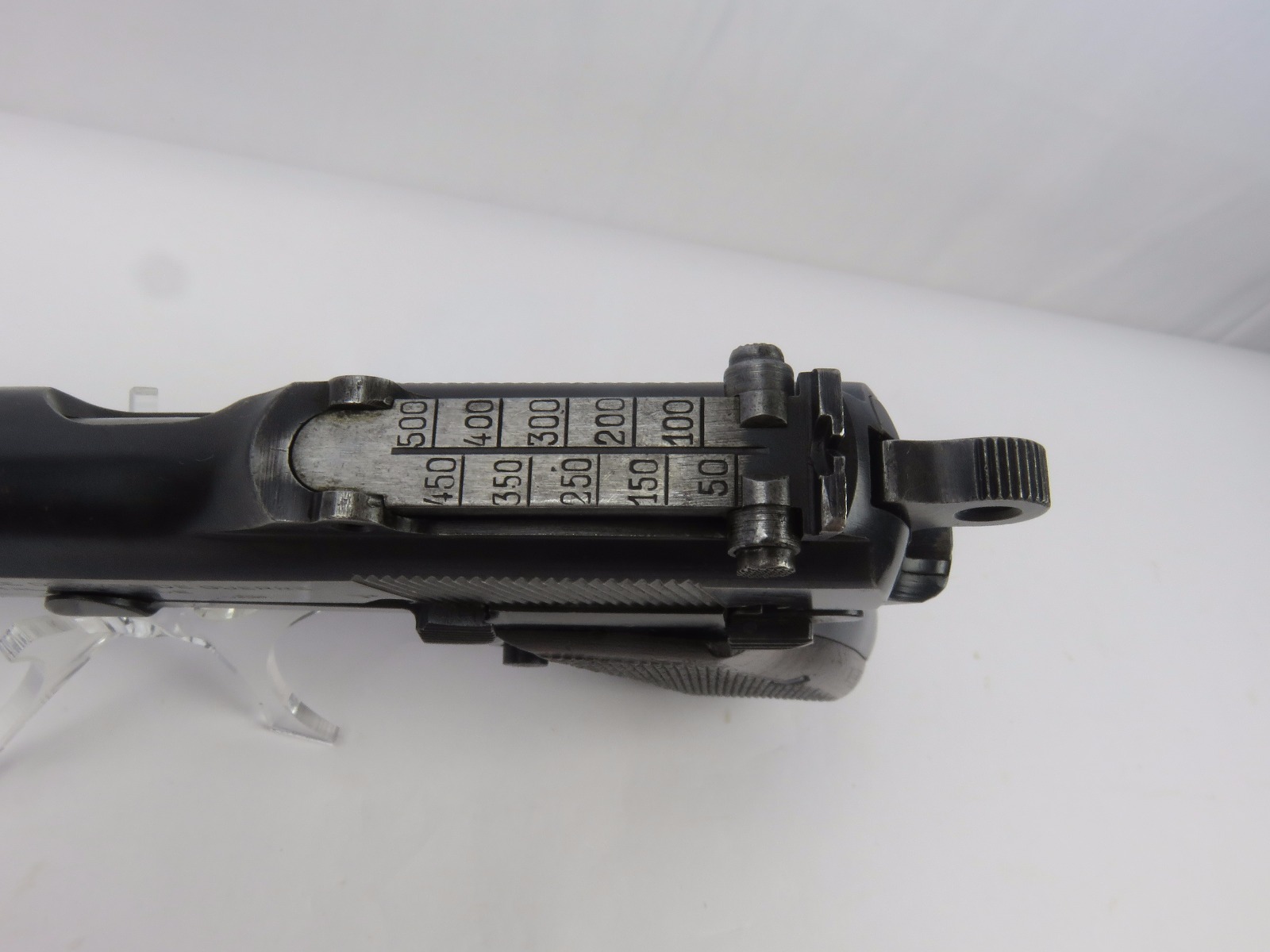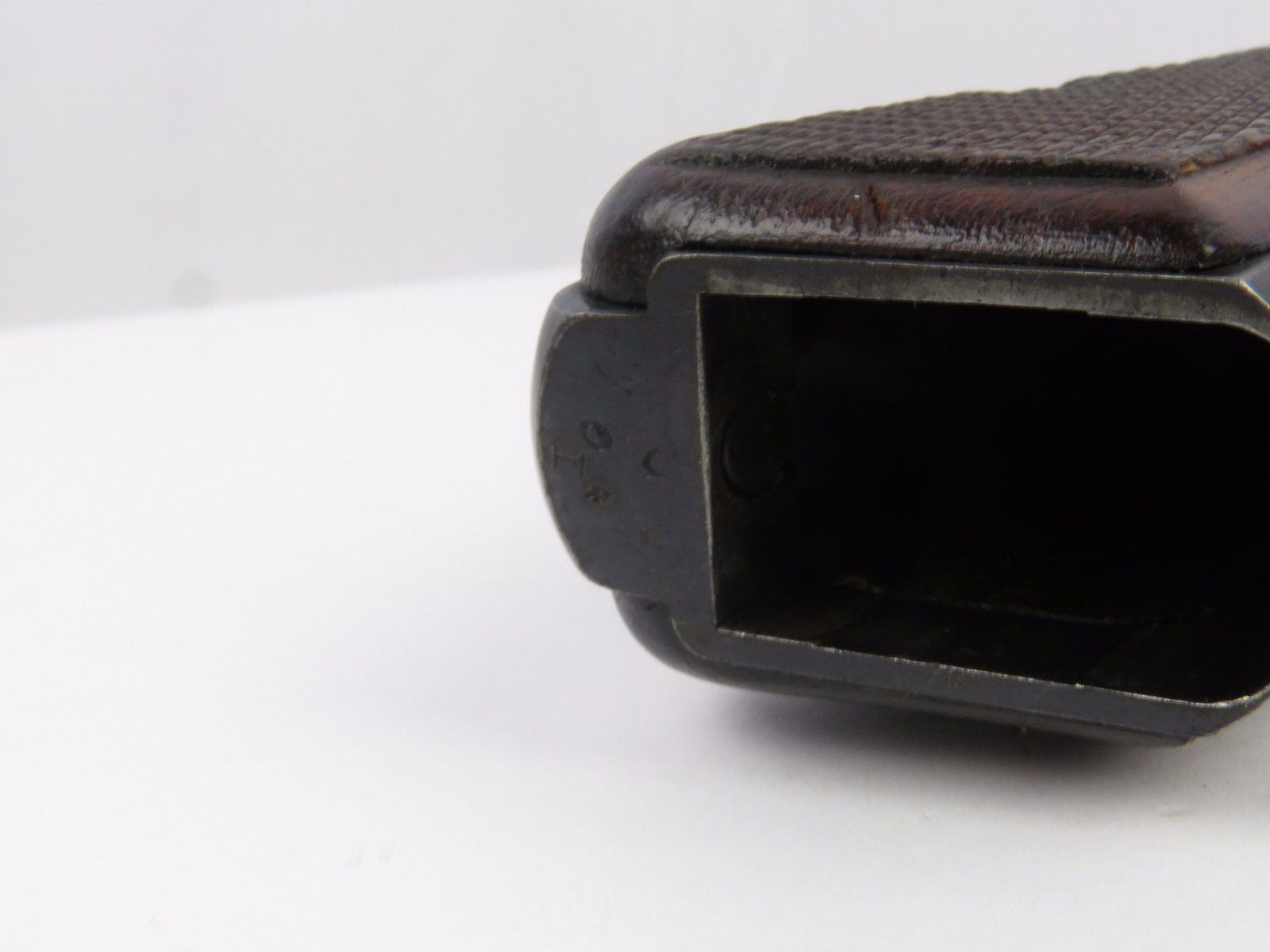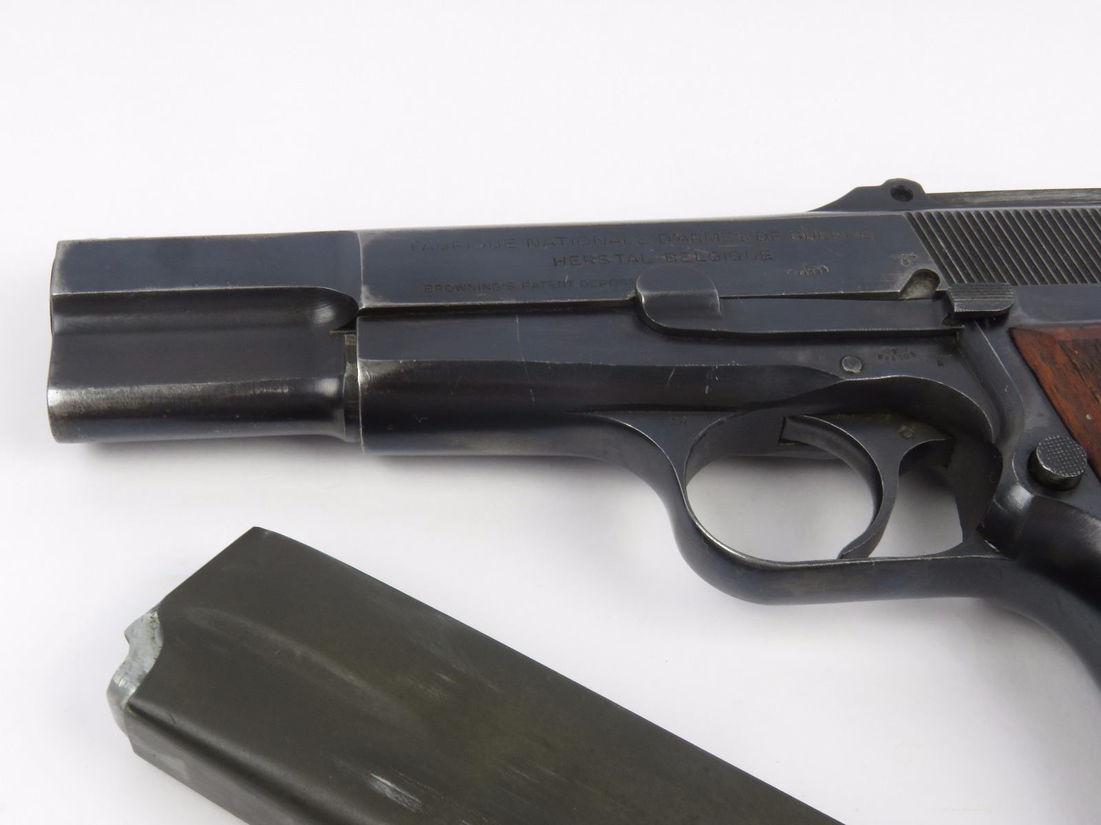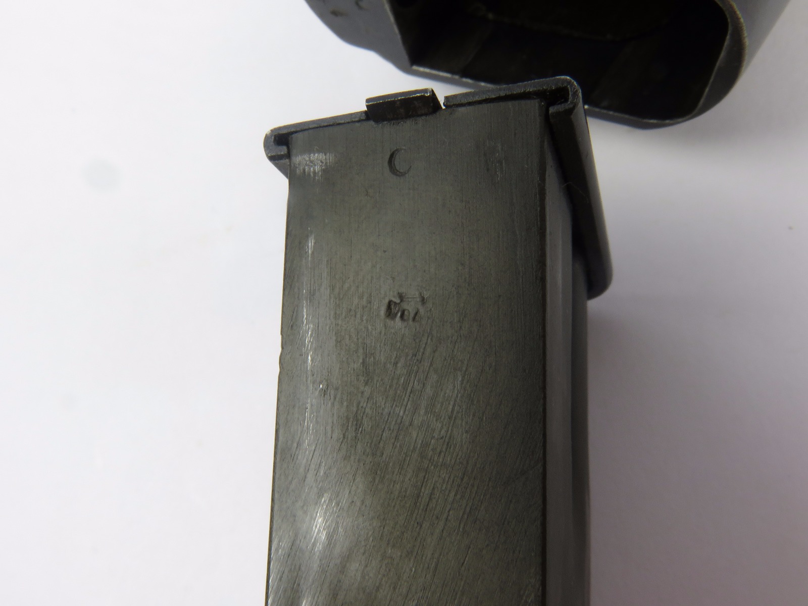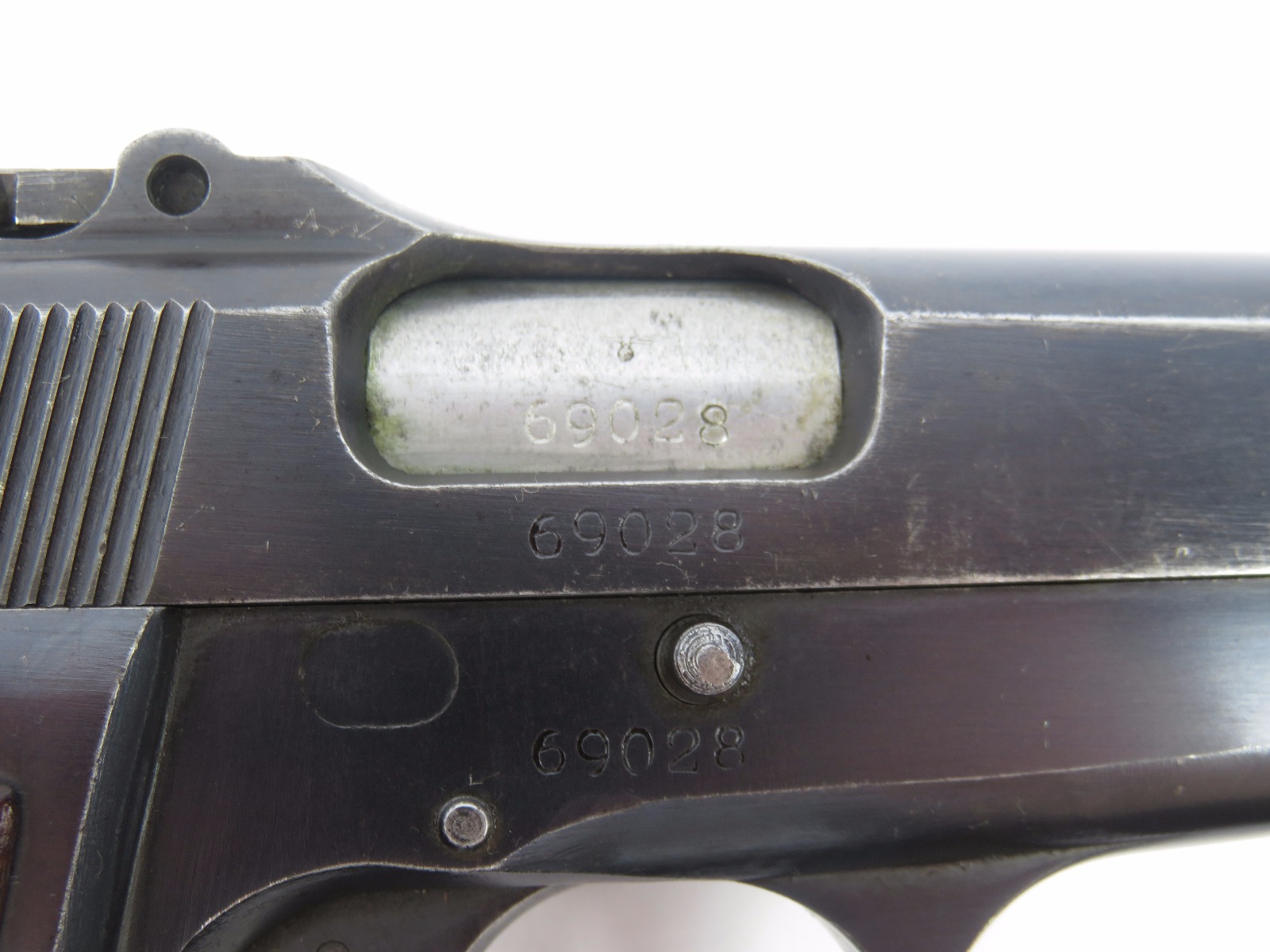 10/24/17 – This is an original FN Browning Hi-Power pistol with early Nazi occupation proof stamps. The frame and slide have waffen eagle WaA103 military proof stamps – this is an early and scarce waffen proof for Hi-Powers. The pistol also has an early tangent rear sight – a feature that was changed to a fix sight as the war went on. The pistol is in excellent condition, and overall we rate about 94% of the original finish remaining. There is edge wear on the slide, and some thinning/browning on the front and back straps. This is nice “honest” wear though and shows that the pistol saw some use during the war. The gun is fully functional with no mechanical issues, and a nice bore. We rate the bore at 7/10 though due to some patina throughout the rifling. The girps are original and excellent, and the magazine is waffen proofed.