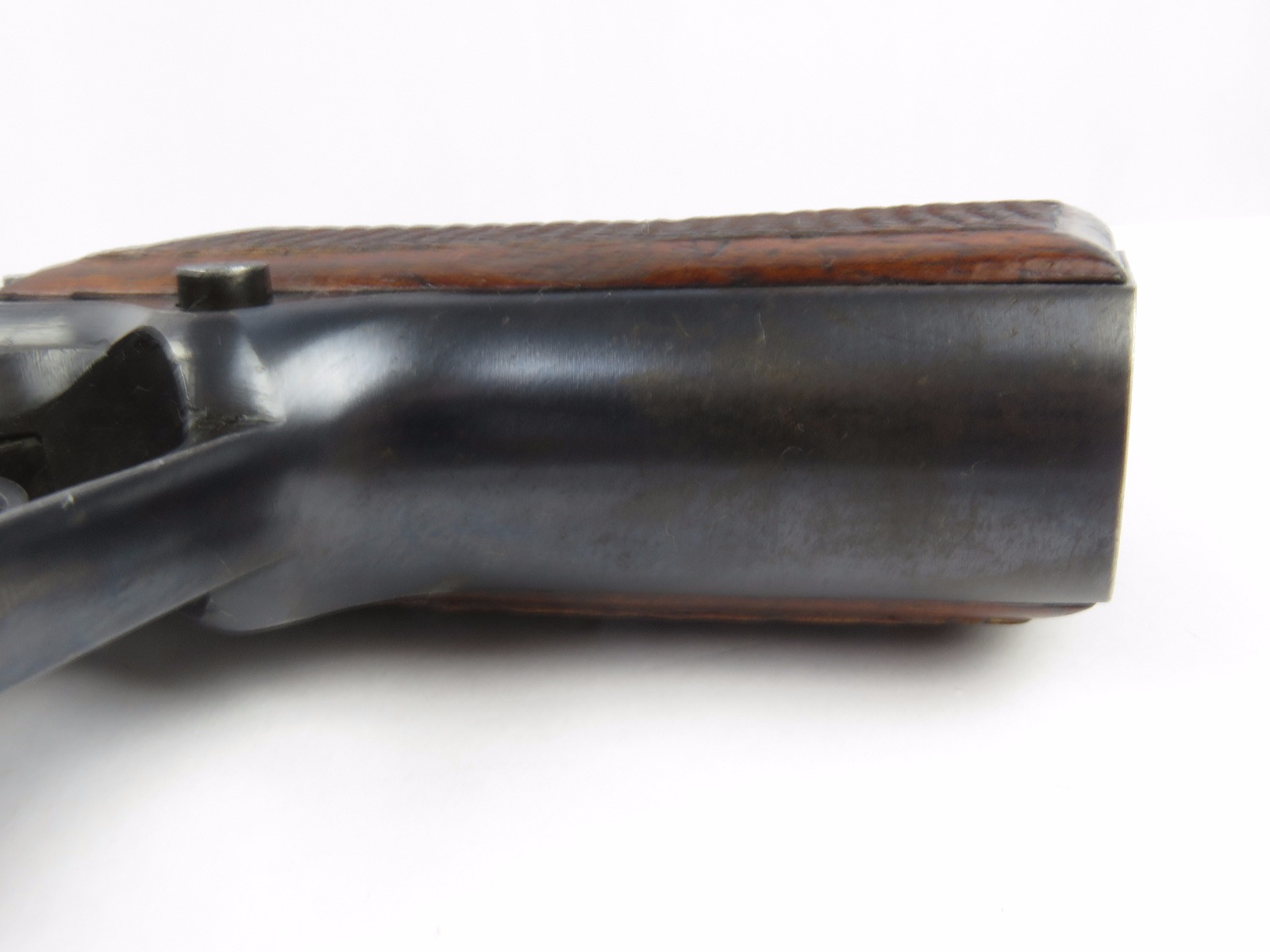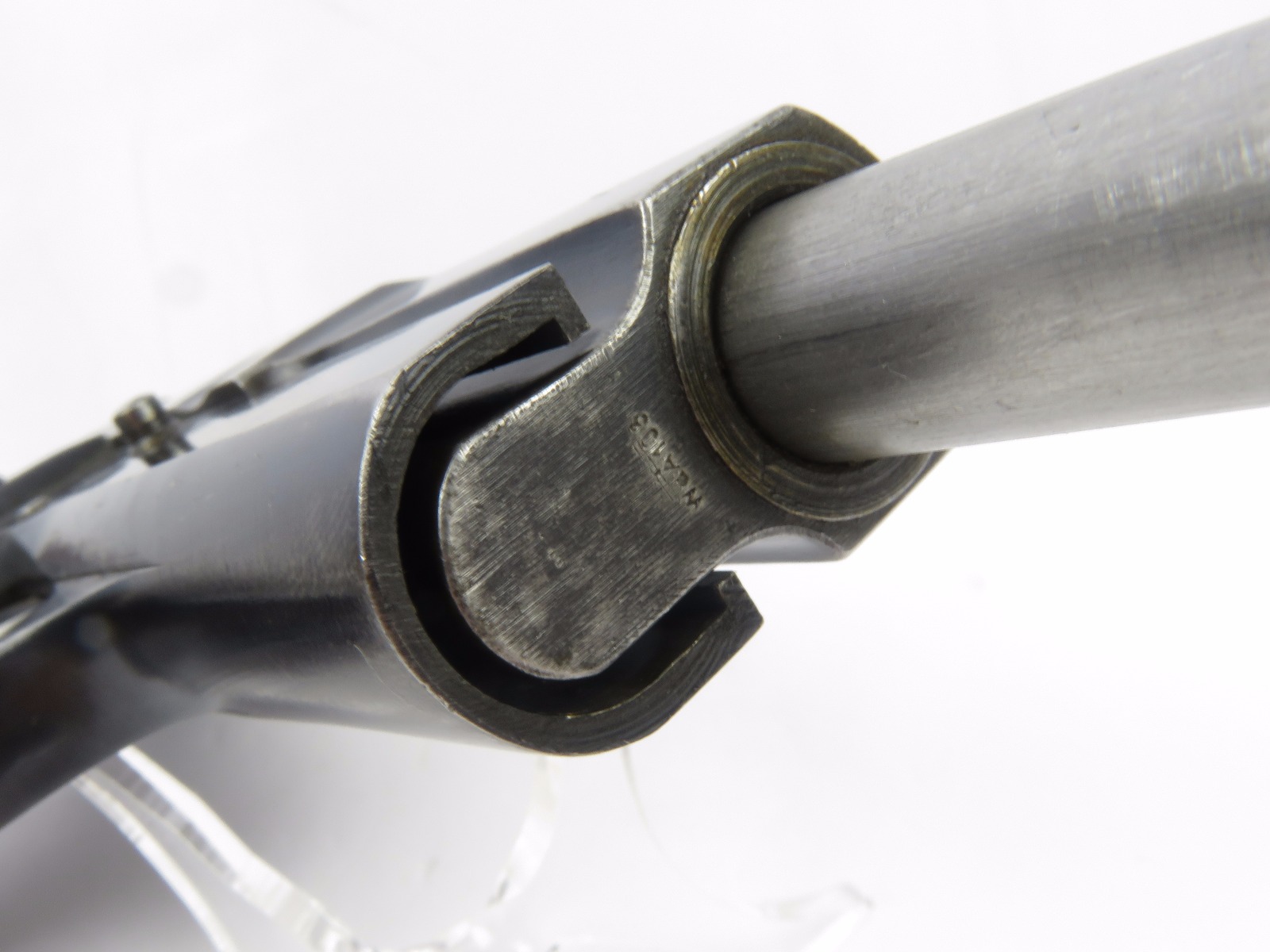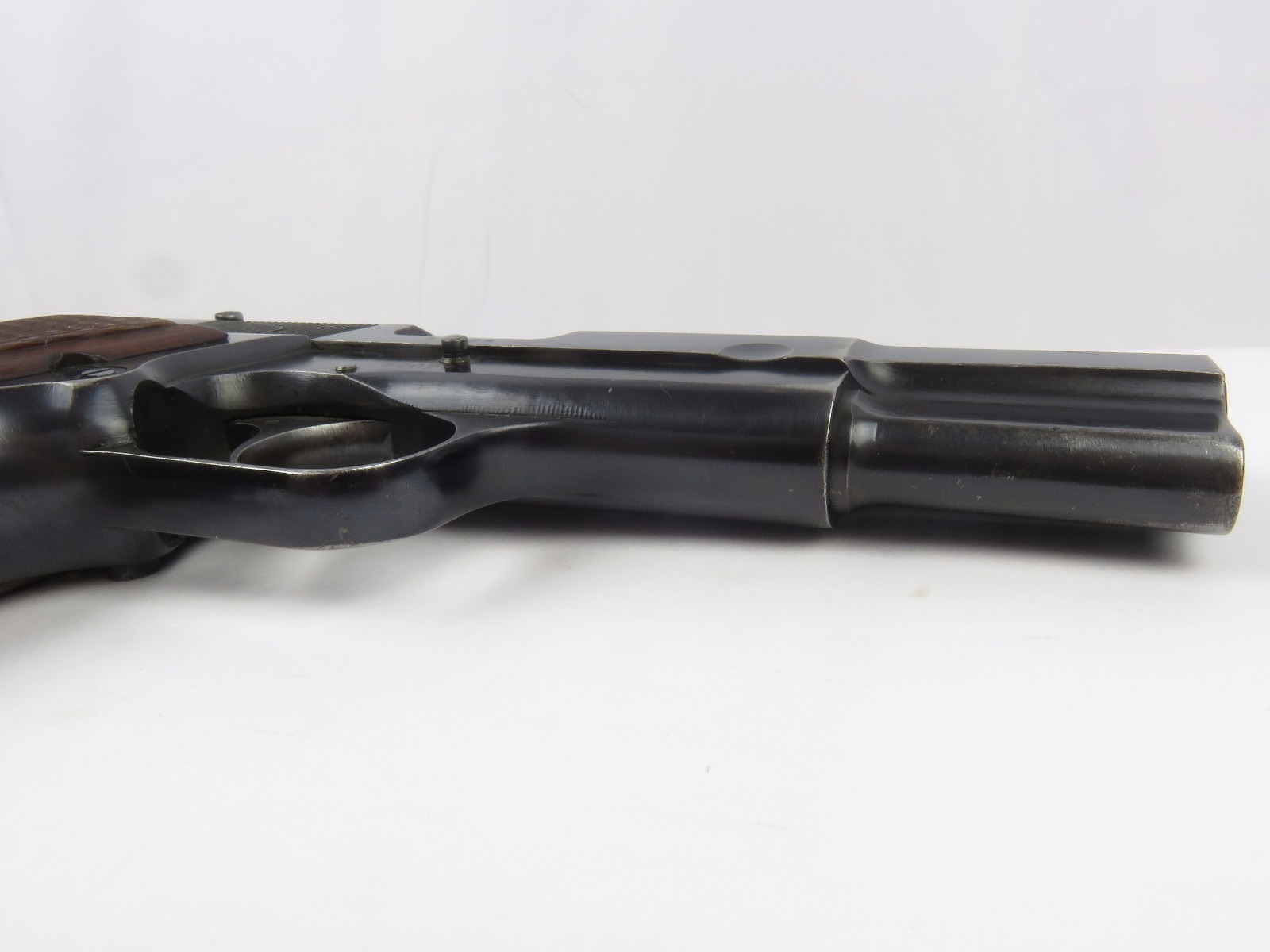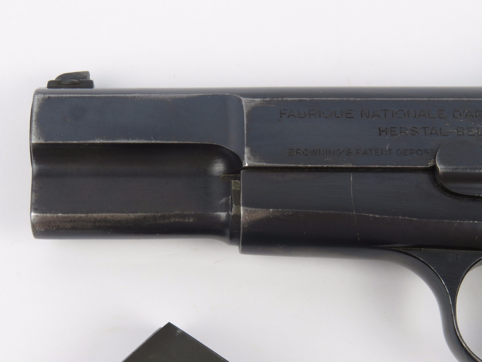 10/24/17 – This is an original FN Browning Hi-Power pistol with early Nazi occupation proof stamps. The frame and slide have waffen eagle WaA103 military proof stamps – this is an early and scarce waffen proof for Hi-Powers. The pistol also has an early tangent rear sight – a feature that was changed to a fix sight as the war went on. The pistol is in excellent condition, and overall we rate about 94% of the original finish remaining. There is edge wear on the slide, and some thinning/browning on the front and back straps. This is nice “honest” wear though and shows that the pistol saw some use during the war. The gun is fully functional with no mechanical issues, and a nice bore. We rate the bore at 7/10 though due to some patina throughout the rifling. The girps are original and excellent, and the magazine is waffen proofed.