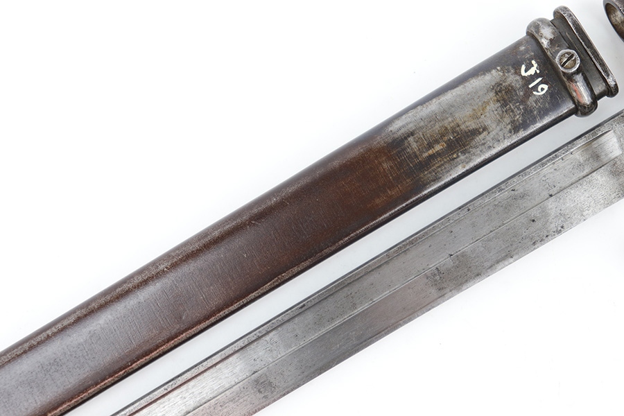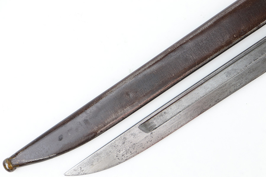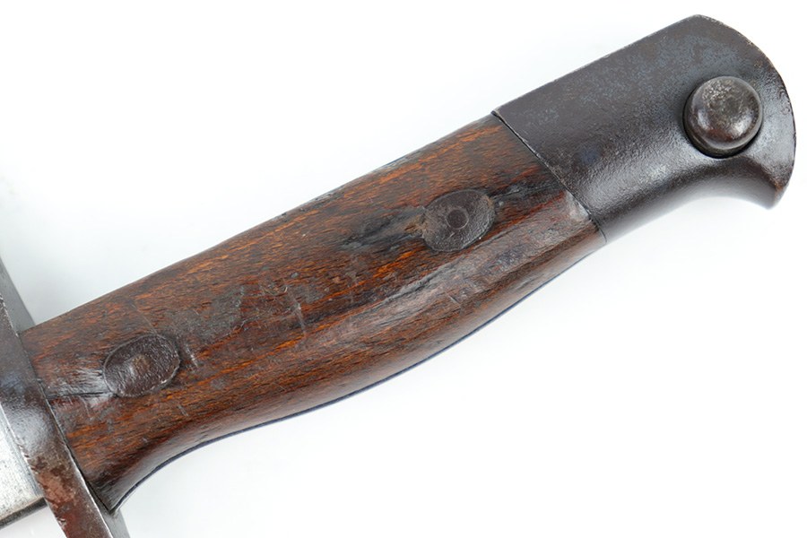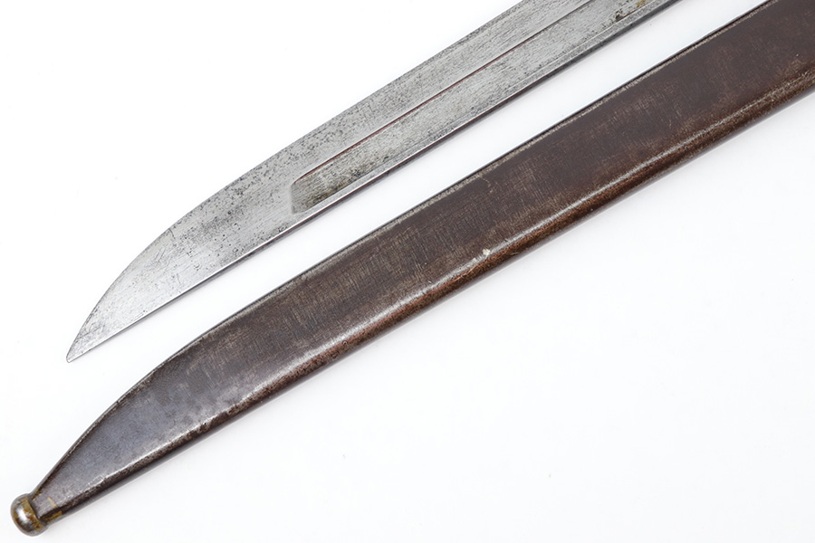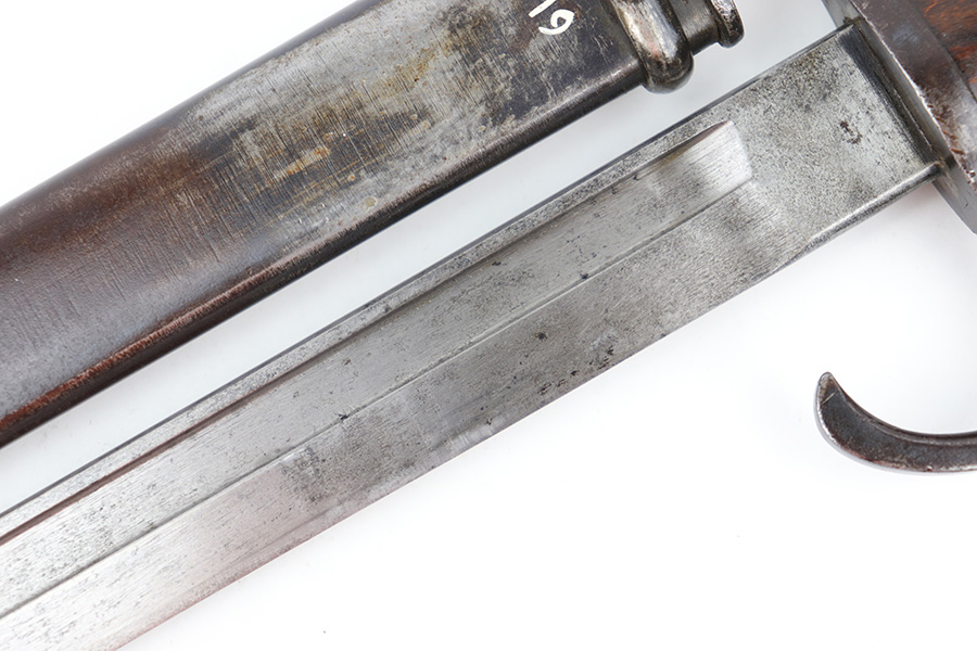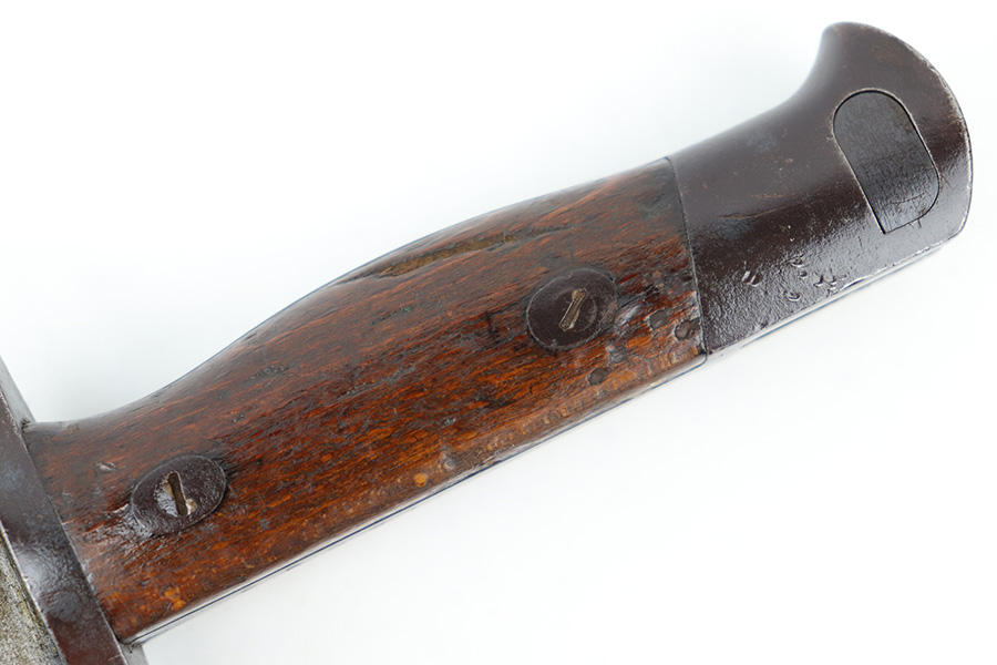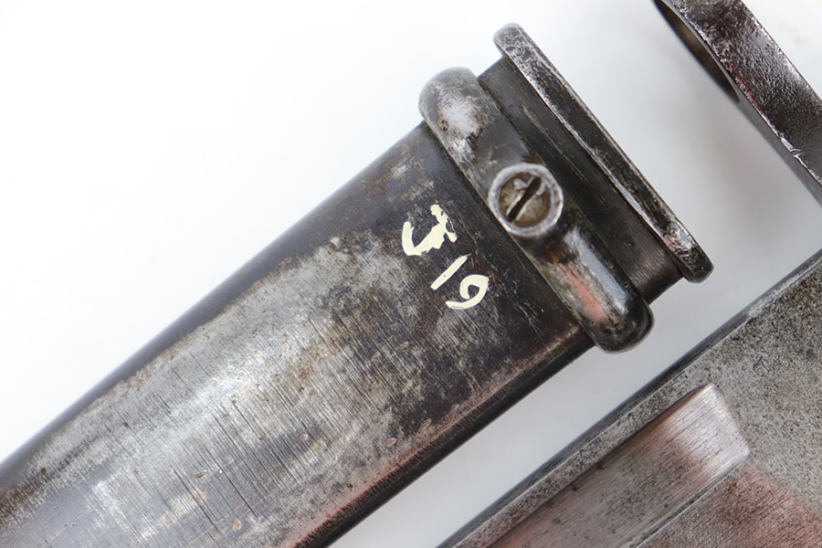 6/21/23 – This is an original Type 30 Japanese Rifle bayonet from WW2. Cited in Labar’s book as a Variation A, LB 73. This is an early production example with no serial number on the pommel. Instead, the serial number is found on the spine of the hilt. There’s also a painted “J19” on the pommel and scabbard, which is congruent with other “prototype” features found on these bayonets. The blade is bright and fullered with some dark surface oxidation in spots throughout the blade. The hooked hand guard and bird’s head pommel show dark surface patina and natural aging wear. The wood grips are contoured with two oval washers and screws, and in great shape. Comes with a ball tipped metal scabbard as well.