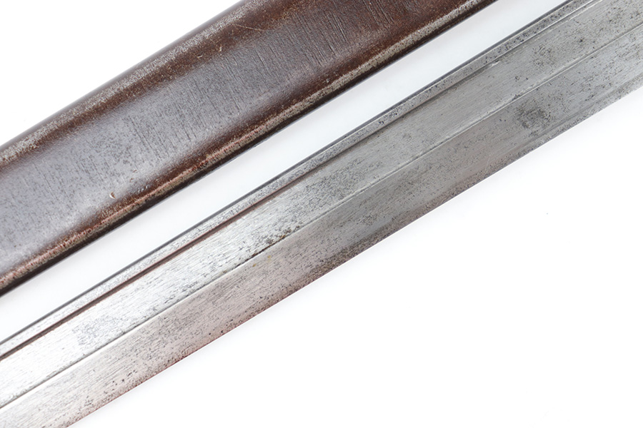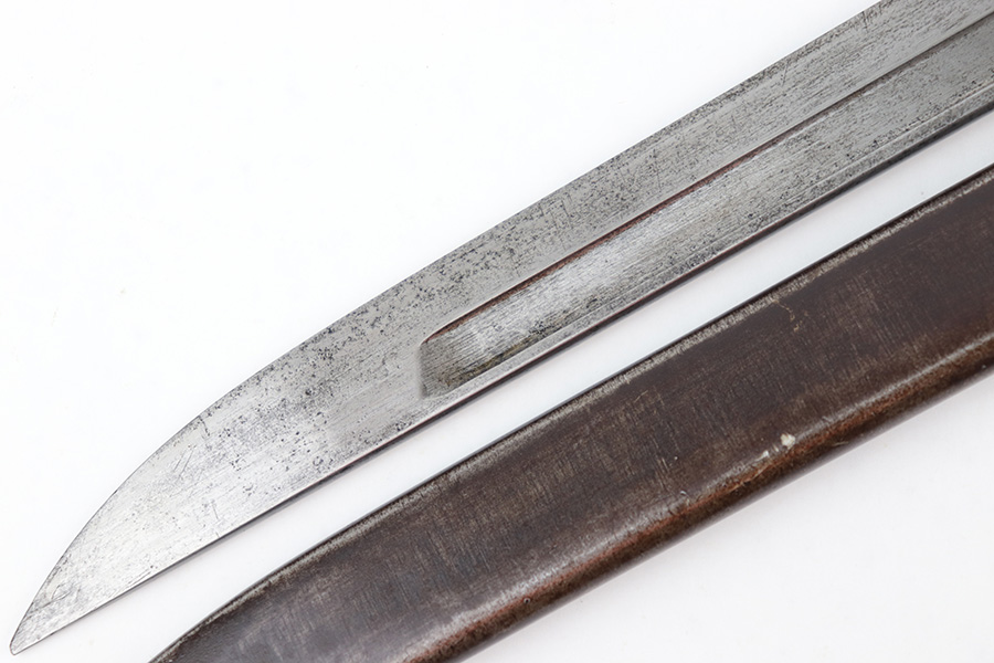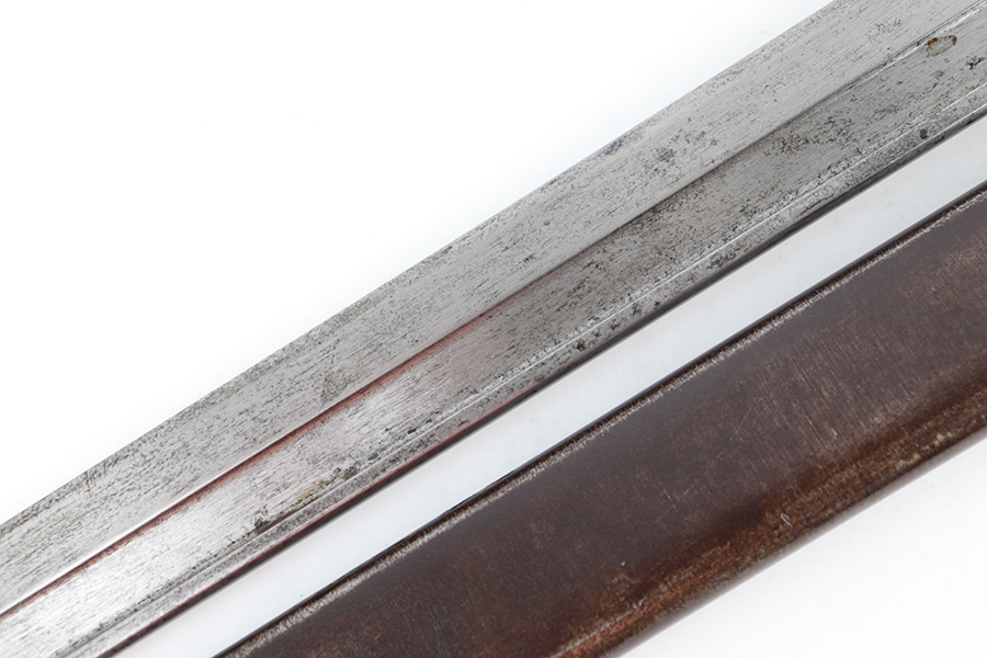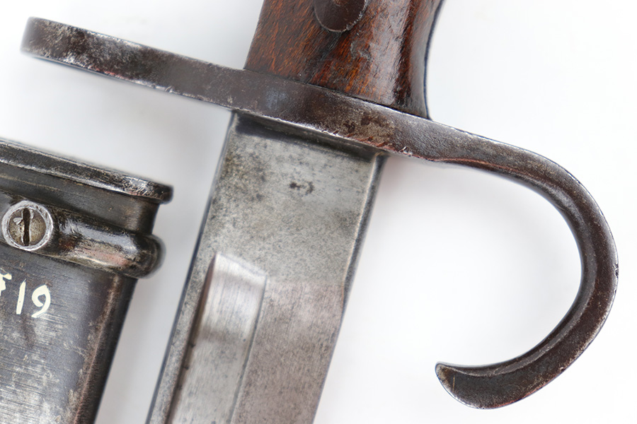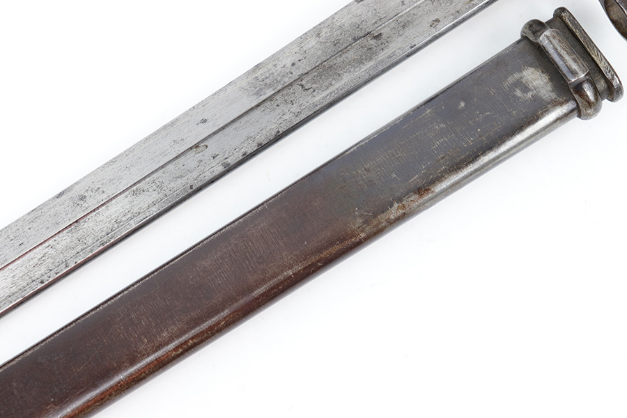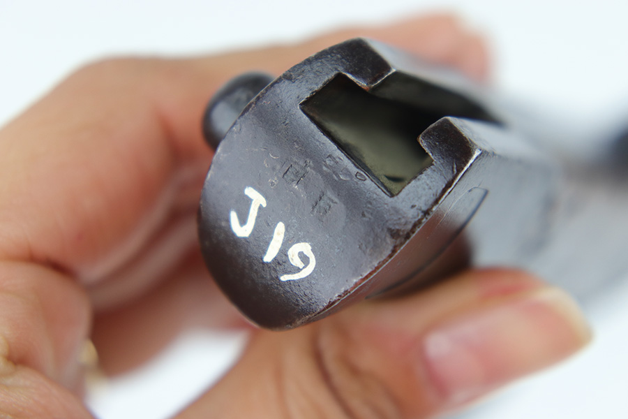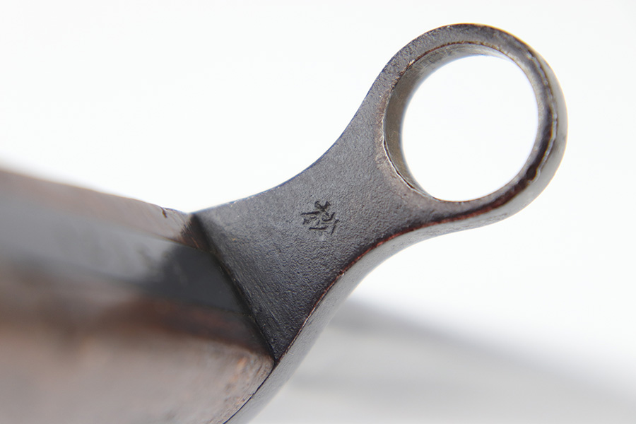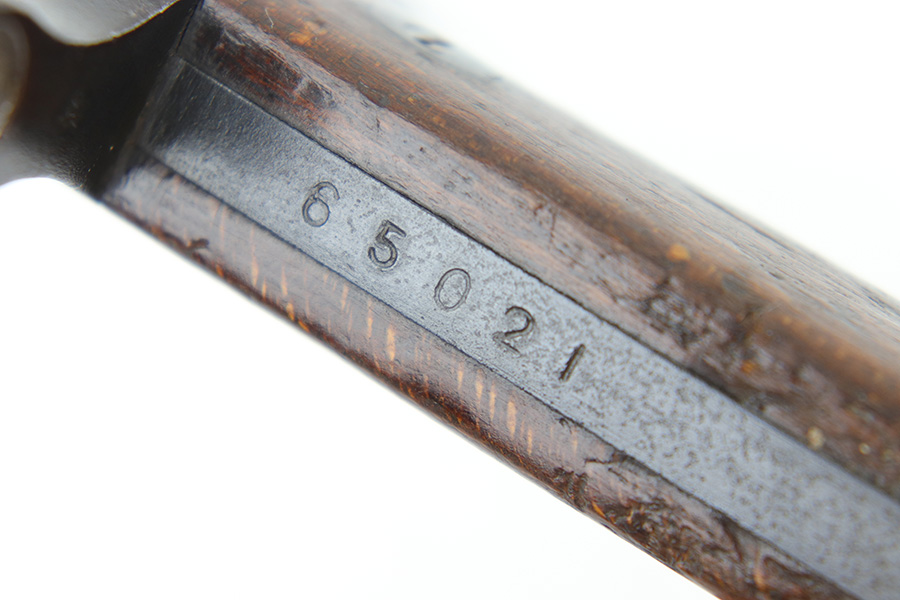 6/21/23 – This is an original Type 30 Japanese Rifle bayonet from WW2. Cited in Labar’s book as a Variation A, LB 73. This is an early production example with no serial number on the pommel. Instead, the serial number is found on the spine of the hilt. There’s also a painted “J19” on the pommel and scabbard, which is congruent with other “prototype” features found on these bayonets. The blade is bright and fullered with some dark surface oxidation in spots throughout the blade. The hooked hand guard and bird’s head pommel show dark surface patina and natural aging wear. The wood grips are contoured with two oval washers and screws, and in great shape. Comes with a ball tipped metal scabbard as well.