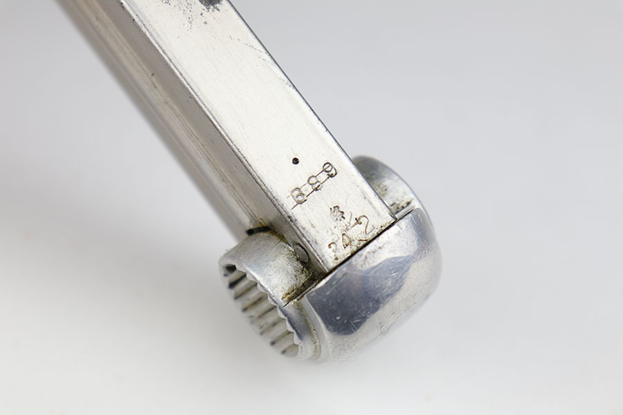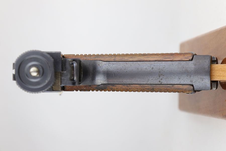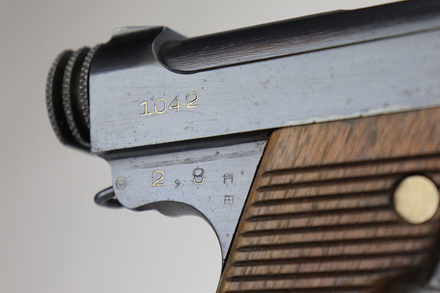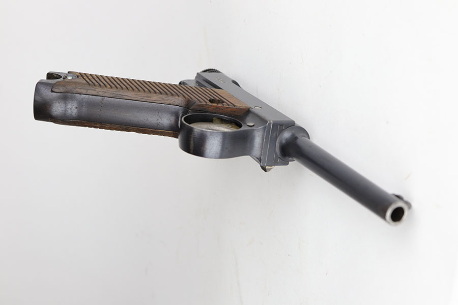 8/19/20 – This is an excellent and super early Type 14 Nambu, made in August of 1927 at the Nagoya arsenal. It has all matching numbers, including the grips and magazine, though the magazine appears to have gone through the armory a second time as the first serial is crossed out. The blue rates at 98% with a bit of high edge wear, and a spot of finish loss on the trigger guard. There’s also some oxidation throughout, especially on the straps.