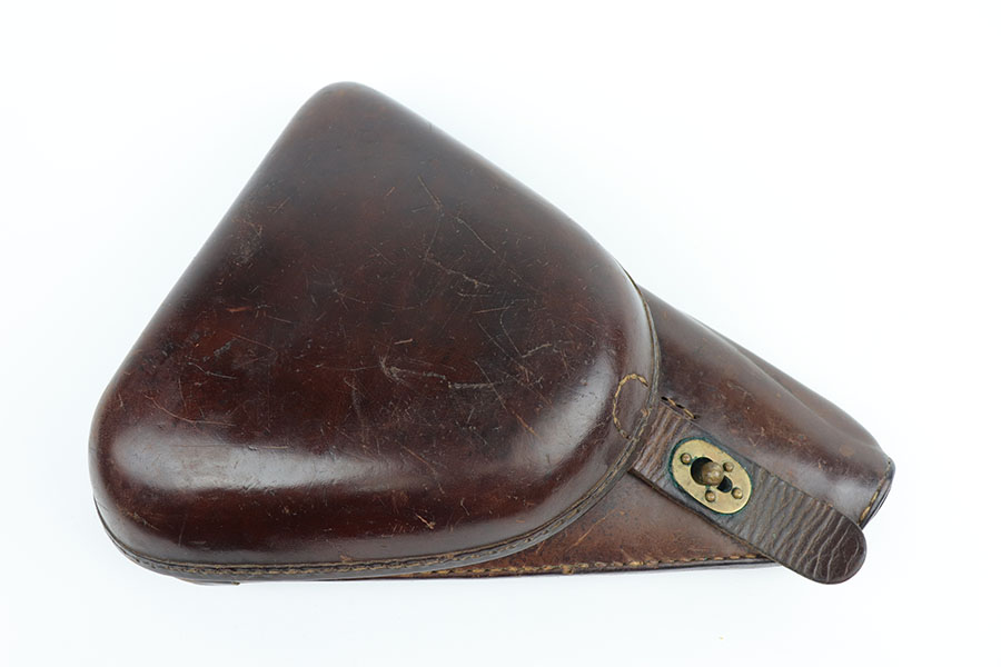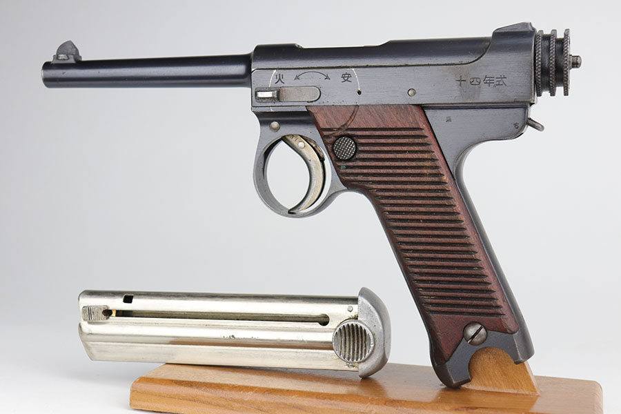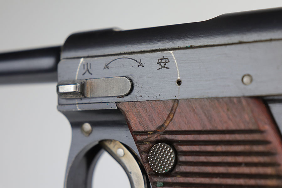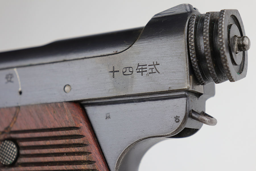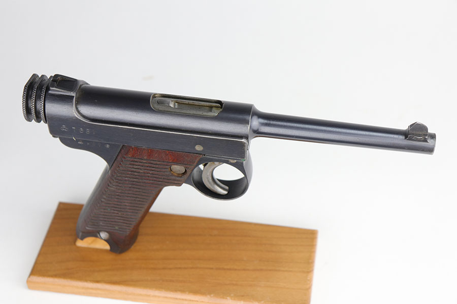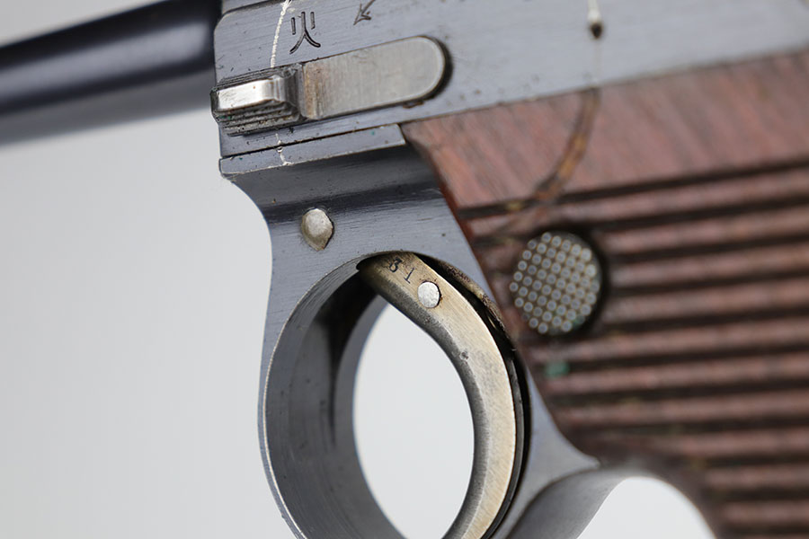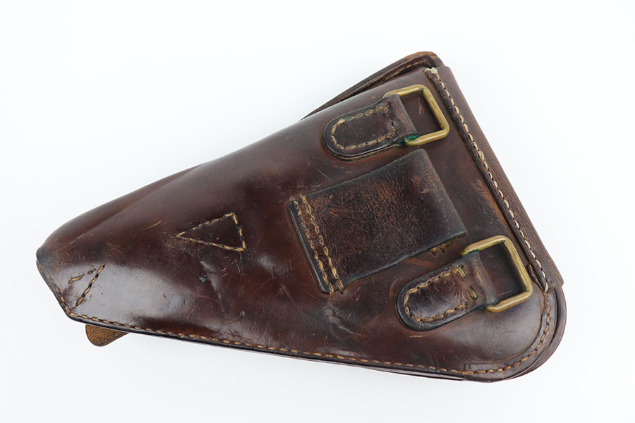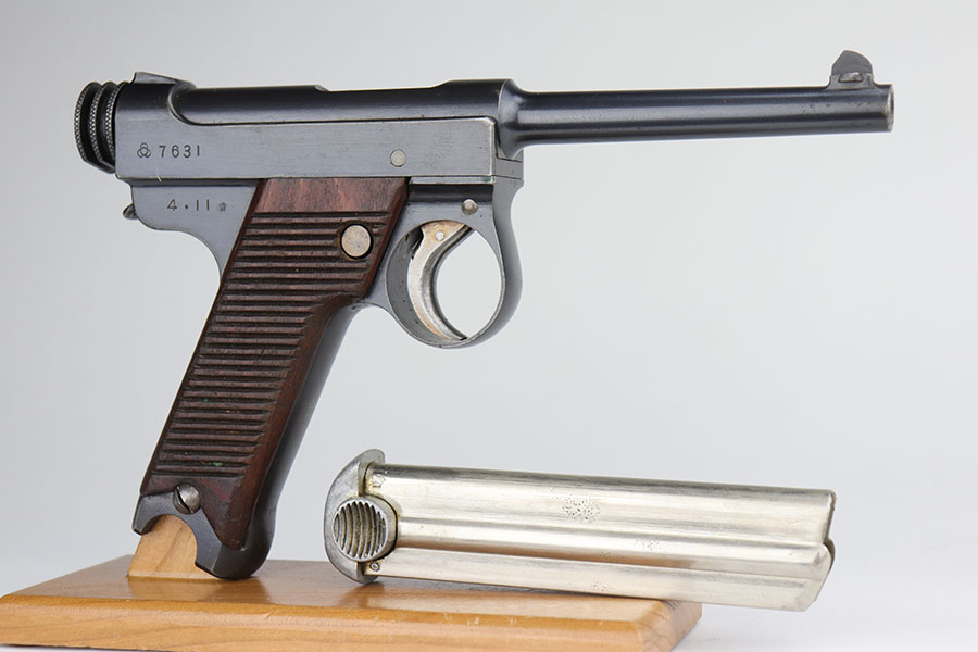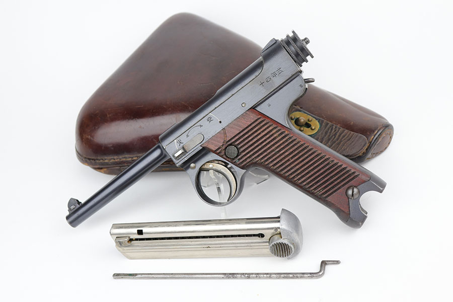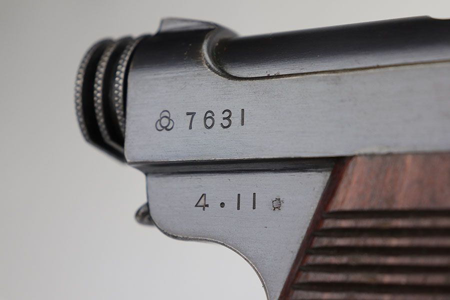 9/2/20 – This is an excellent and early Type 14 Nambu with original holster and cleaning rod. The pistol was made in November of 1929 at the Tokyo Arsenal. It has about 98% of the original blue as there’s hardly any bluing loss, but there is some freckling on the front strap and left side of frame. The grips are in excellent condition and matching to each other but not the pistol. Minty bore. Magazine is numbered to the pistol but it may be an armorer’s replacement as the original serial is crossed through and the matching serial is on the back of the base. The pistol comes in an excellent hardshell leather holster with some Kanji on the inner flap.