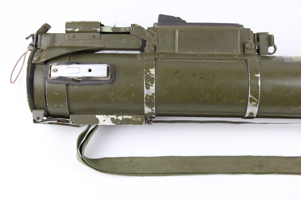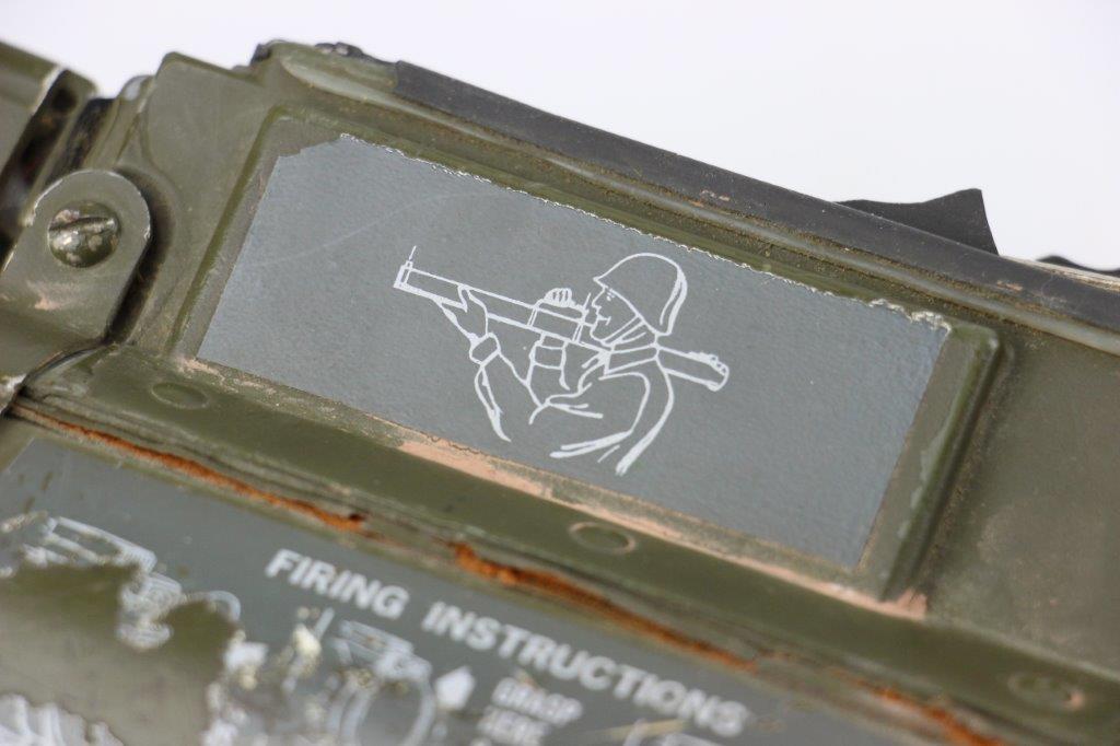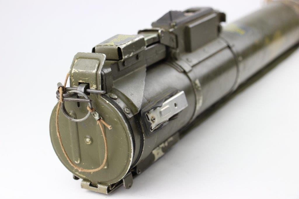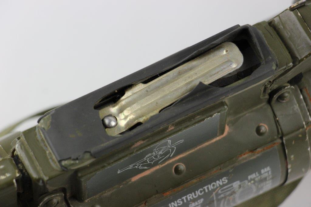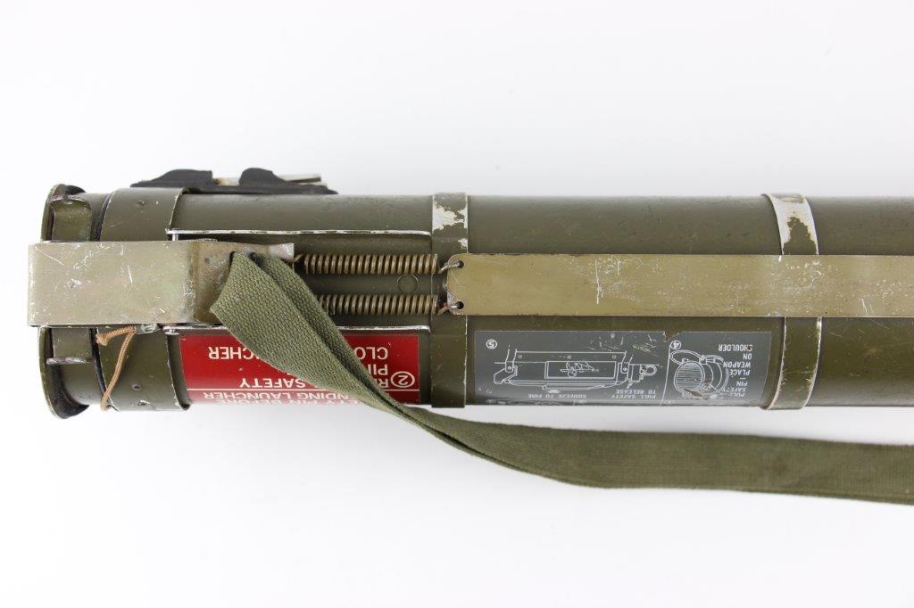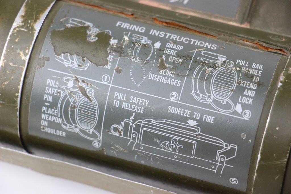 6/20/24 – This is a rare, 1st variation M72 LAW Rocket Launcher from Vietnam. The launcher is dated 4-67, and pre-dates the M72 A1 (more common variation used later during Vietnam). This example is inert (no FFL required and ATF compliant), but complete and includes an original Vietnam era manual. The launcher has been previously opened, but is currently closed and sealed, as shown in photos. The exterior shows light scuffs and scratches, along with paint loss on high edges. The instructions are clear except for the first step which has some missing paint. The forward paper label is worn and tattered, as shown. The front sight has been removed, which is common for these inert examples as the large clear plexiglass sights were brittle. Original carry strap is excellent as well. A cool piece of US military history.