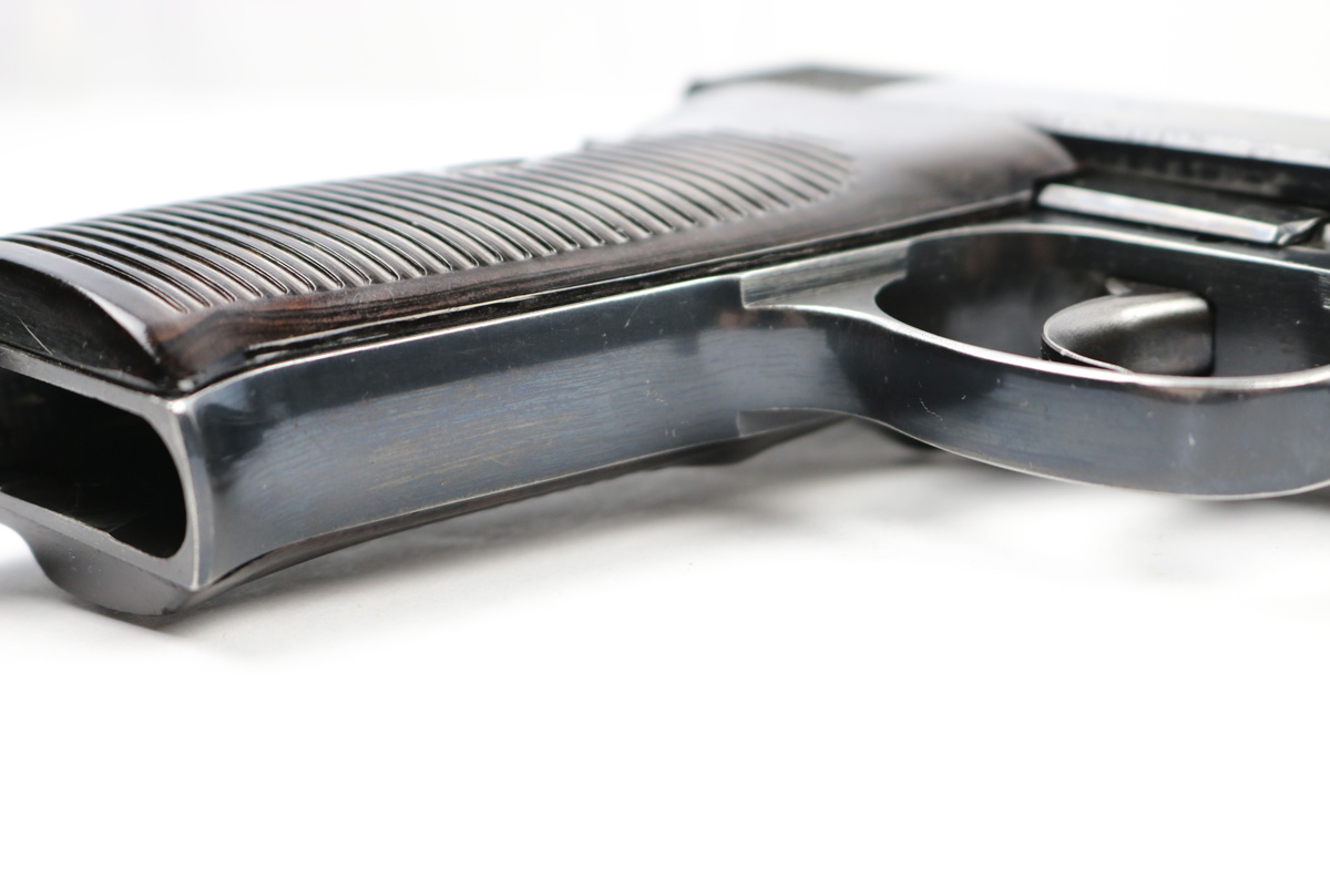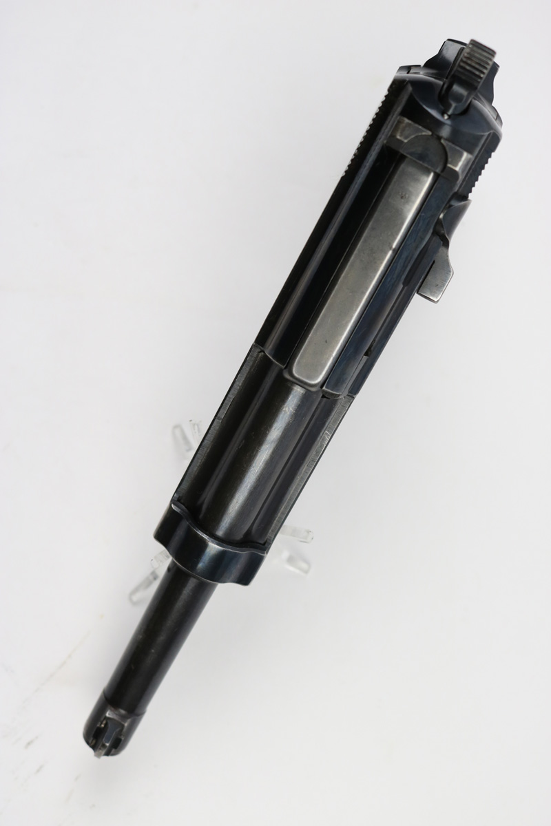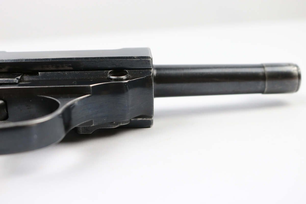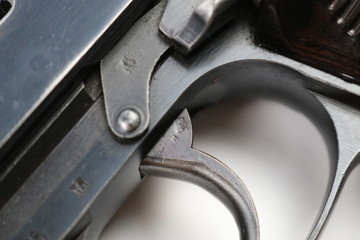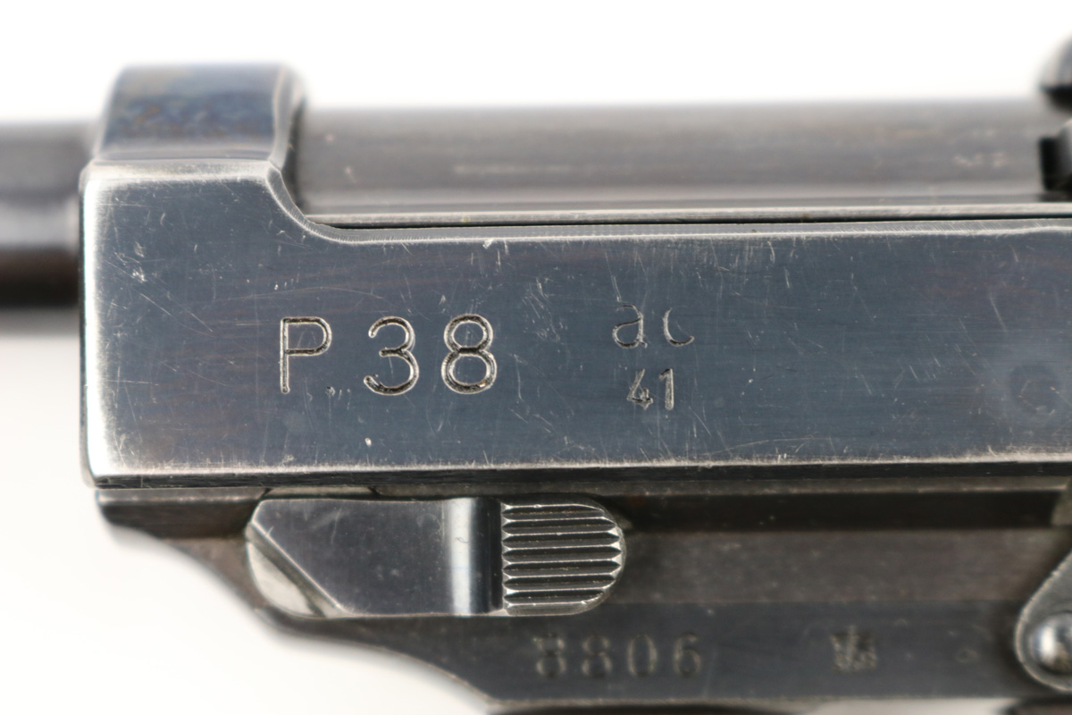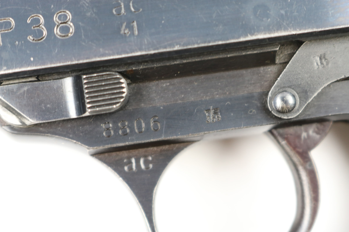 6/21/18 – This is an original early 1941 production Walther P.38. The pistol is all matching and correct with a high polish blued finish and small parts eagle/359 proofed. The pistol has no letter suffix, meaning it was produced in January of 1941. The finish rates at about 94% overall, with most of the wear being on the right side of the slide. There’s some light pitting under the proof stamps near the edge of the slide. The barrel has some bluing loss and muzzle wear. The straps are excellent with very nice bluing in tact. The bore has very minor edge wear on the grooves, and overall is shiny and excellent. Comes with original grips and a serial numbered magazine (in the ‘a’ suffix, so one month after this pistol was produced). The grips are also properly eagle/359 proof stamped. Guaranteed original !