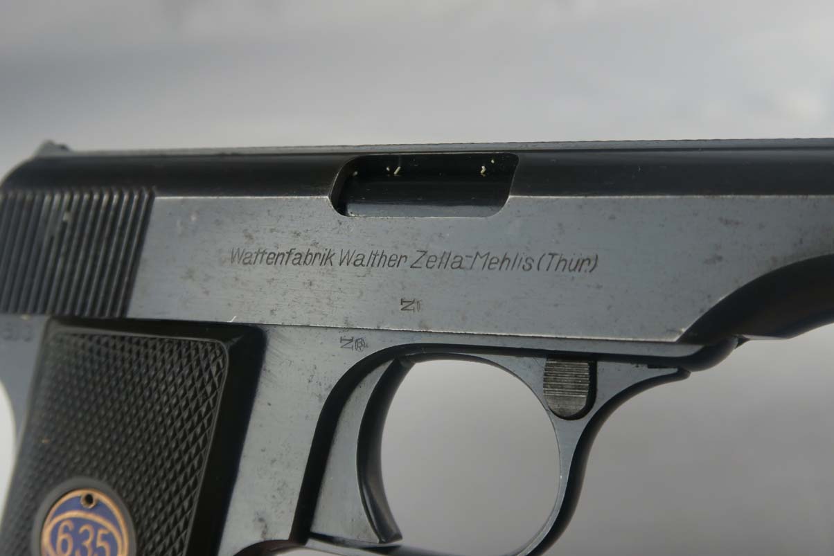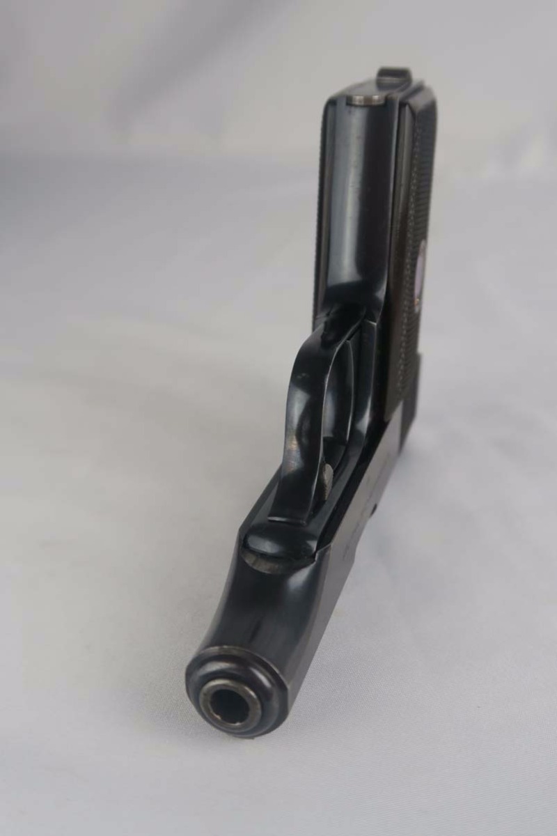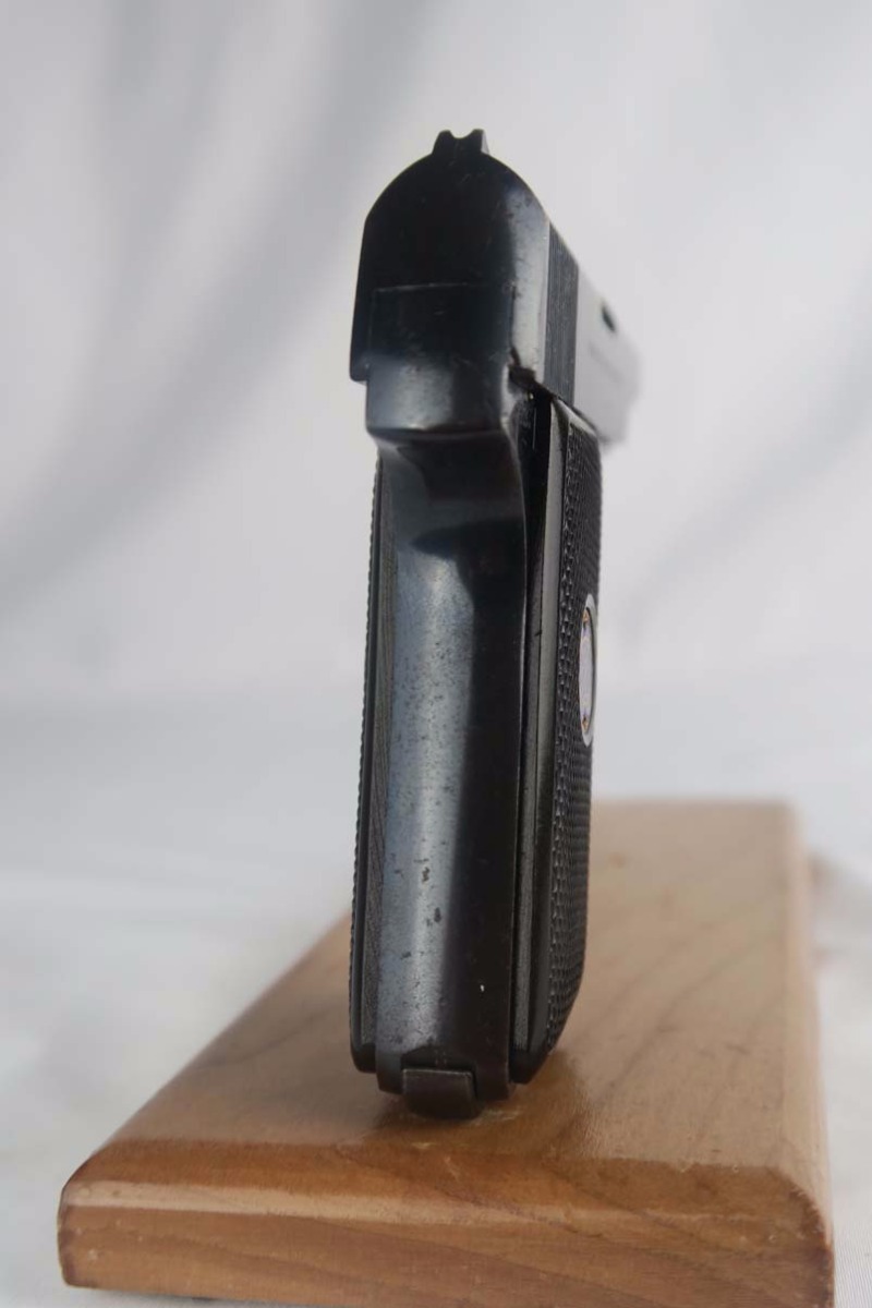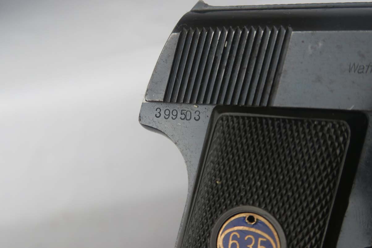 10/3/17 – This is an early, first variation Walther Model 8. The first Model 8’s were manufactured in 1920 and started with serial 390,000, making this one of the first 10,000 made! It is all original and correct, with about 96-97% bluing remaining. There is very little actual finish loss, with minor edge wear, but there are brown spots of patina coming through in various places on the pistol. Chambered in 6.35mm. Left grip panel has a minor crack. Excellent bore.