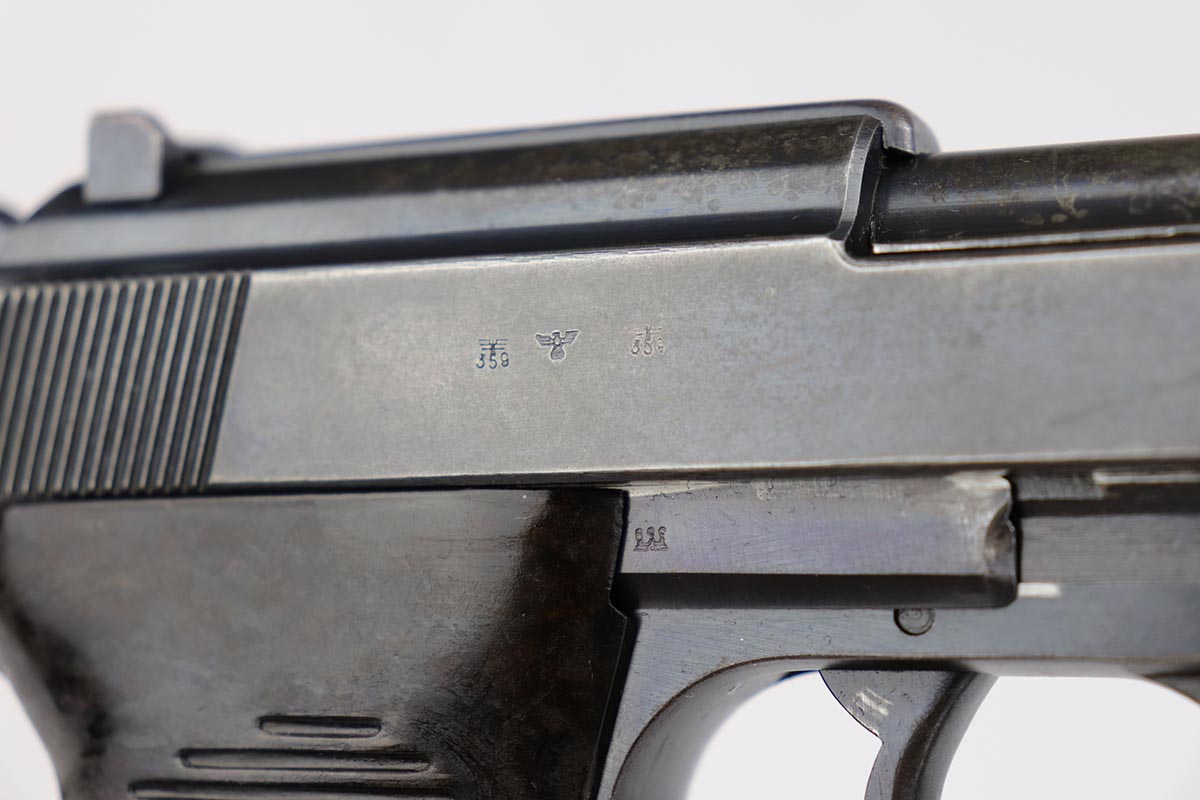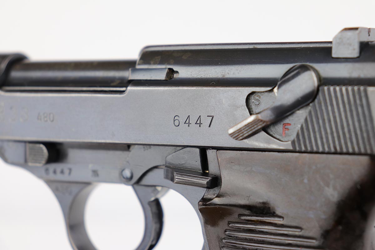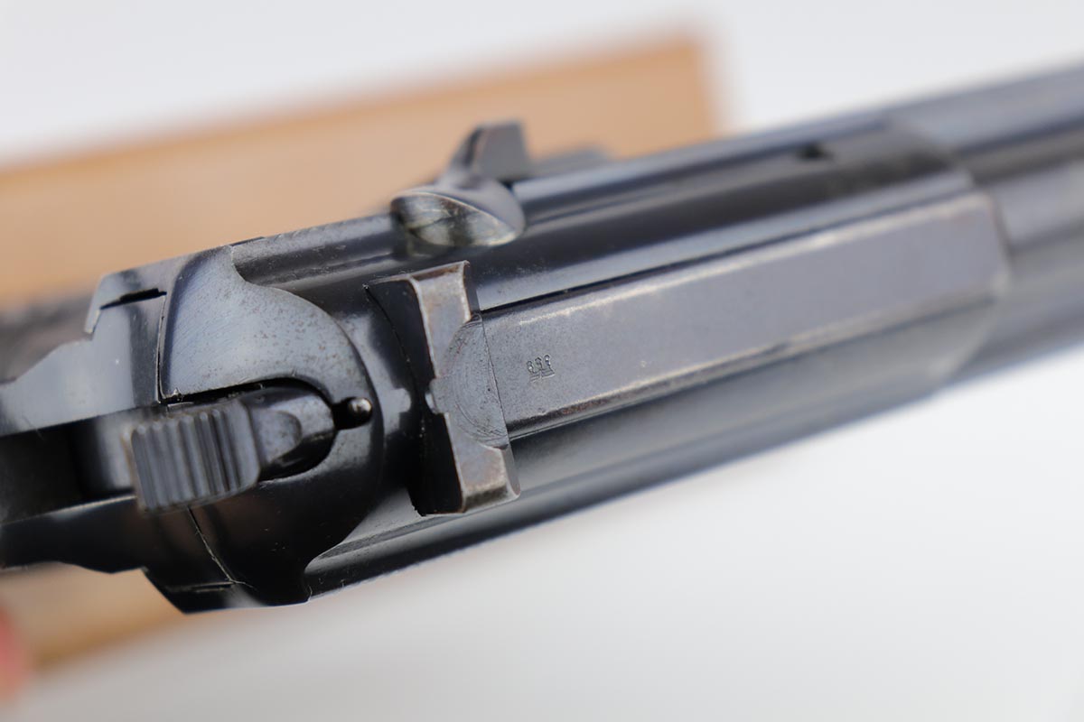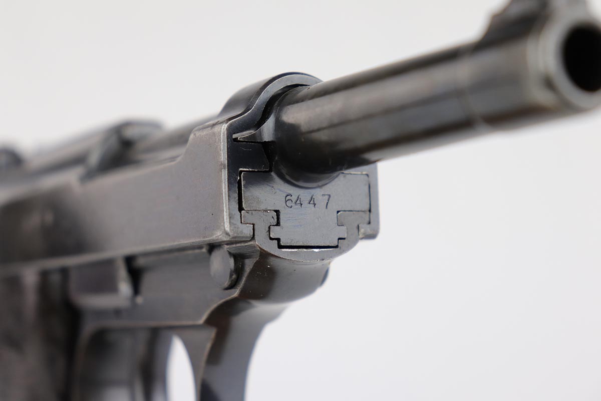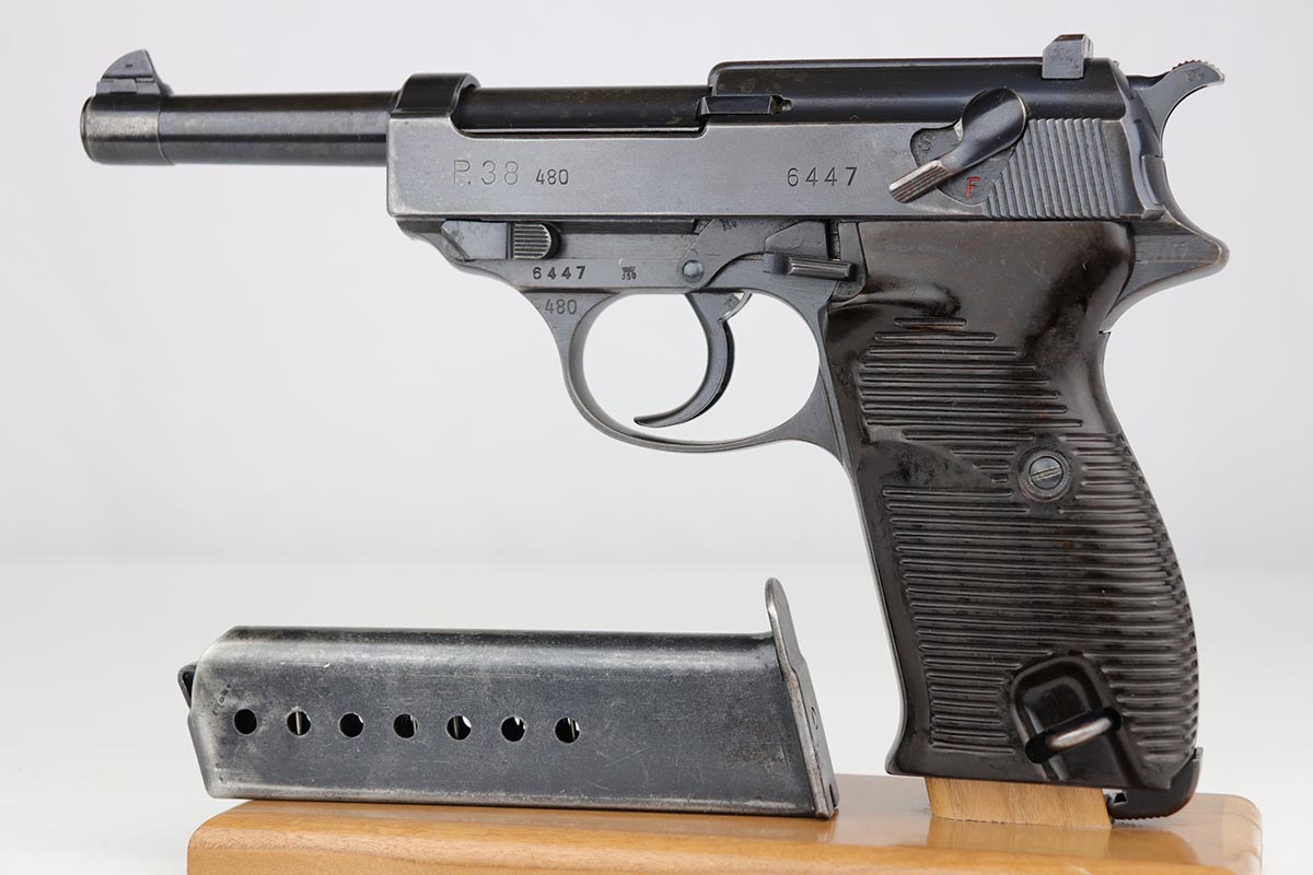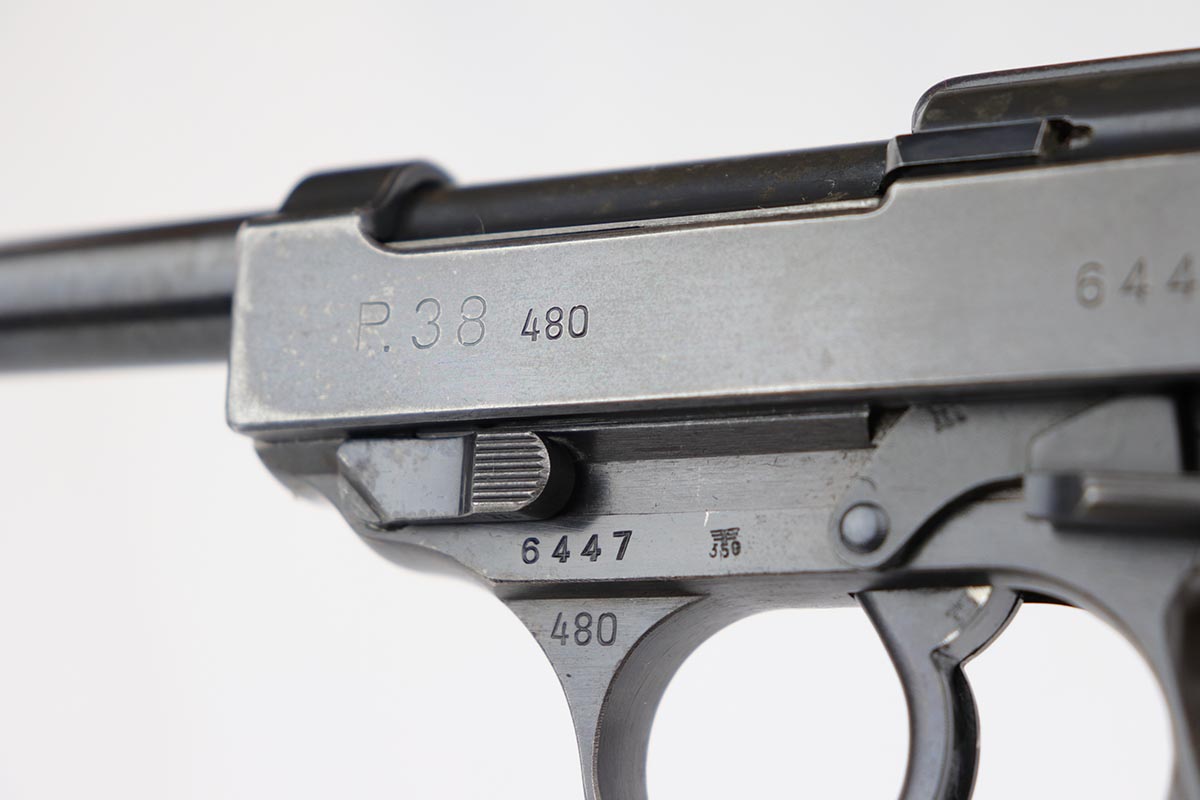 5/30/19 – This is a rare 480 code Walther P.38 from 1940. All numbered parts are matching, including the grips, and the magazine is fewer than 100 digits off! The bluing rates at about 80-85%, with minor thinning along top of barrel and slide, edge wear on all sides, and some finish loss on the front strap. There were only about 7,000 of this variation produced with 480 code on the trigger guard, making it one of the rarest P.38 variations. The magazine is correct and original, with proper double E/359 stamp at base of spine. Like most of the early Walther P.38’s, the small parts are all correctly waffen proofed. Good mechanics, including de-cocker. Bore has strong rifling but some frost throughout.