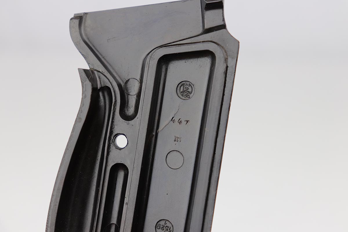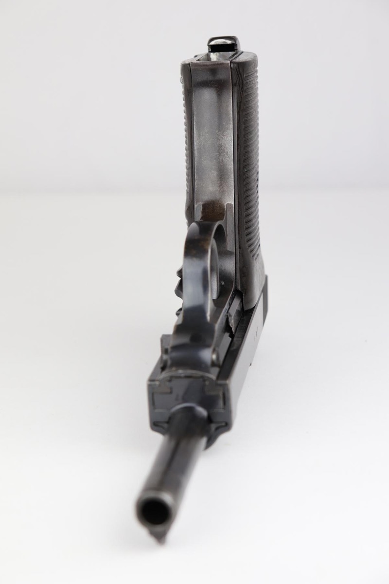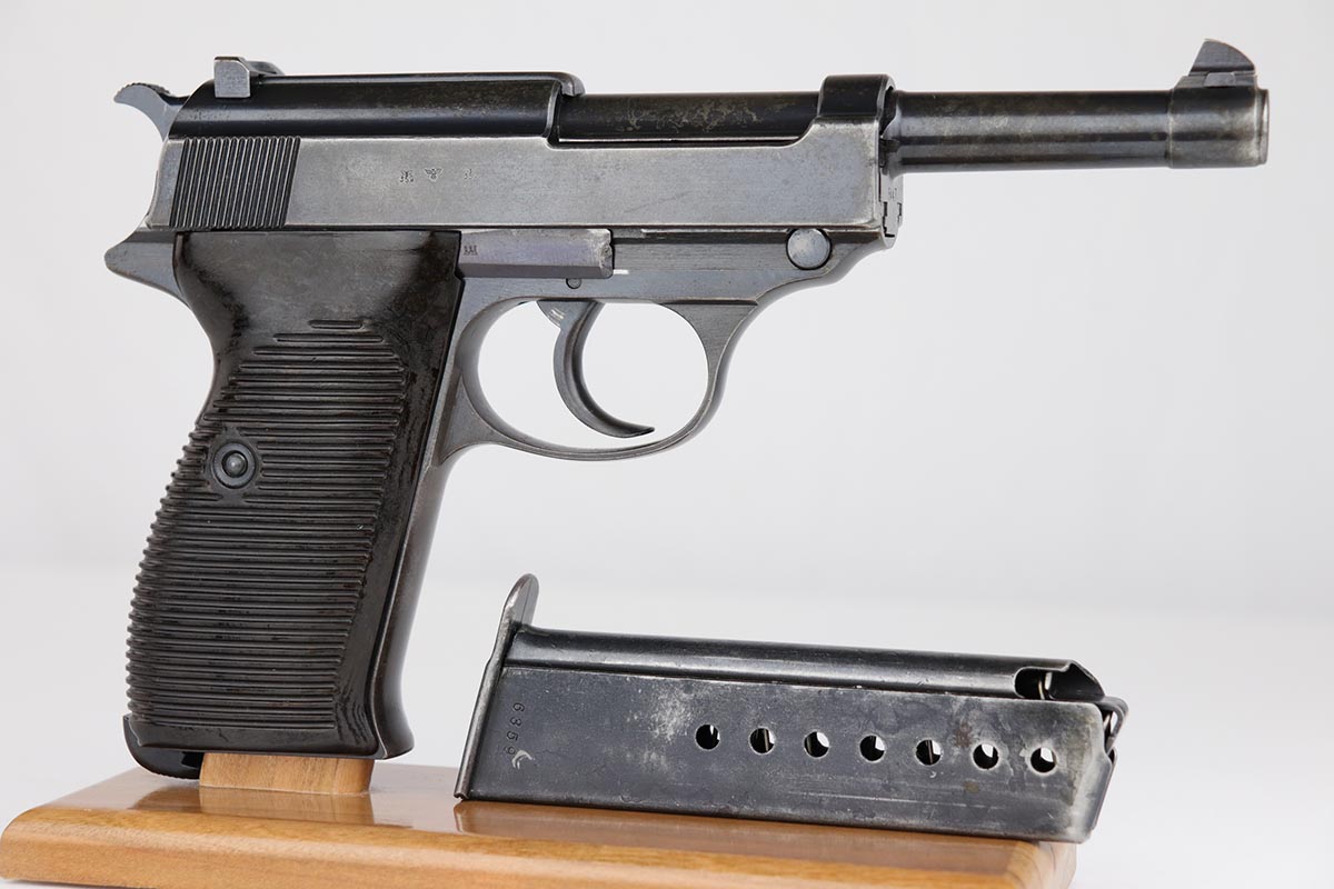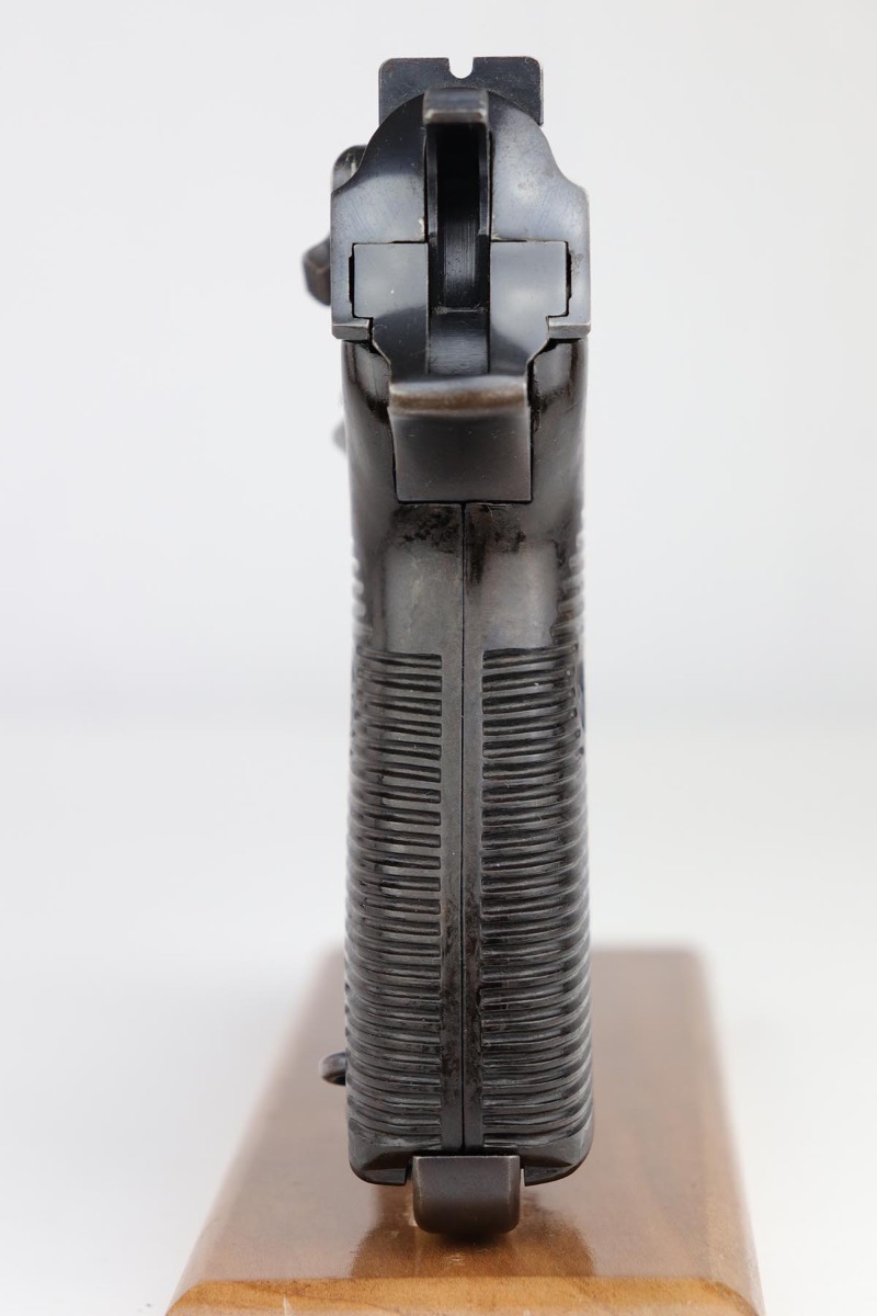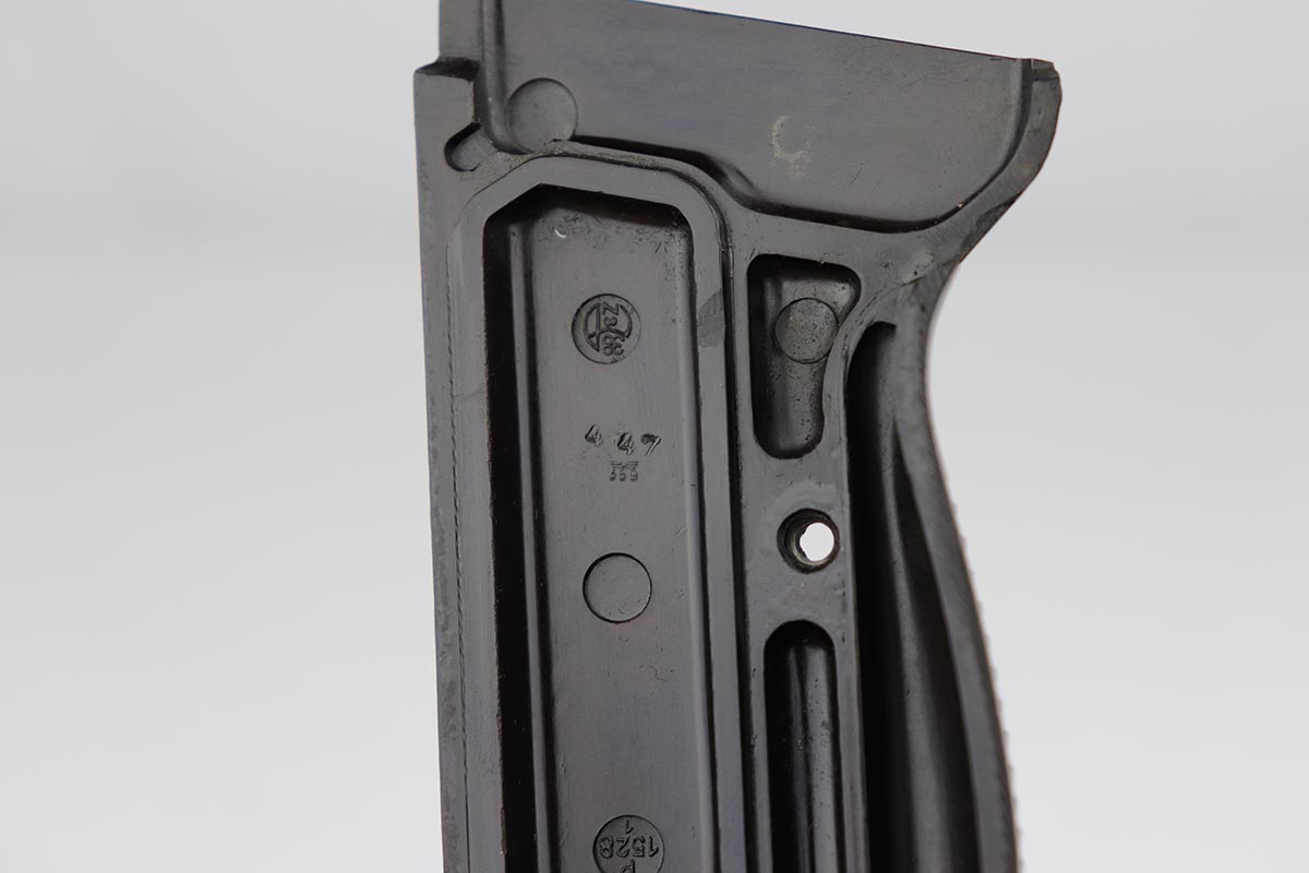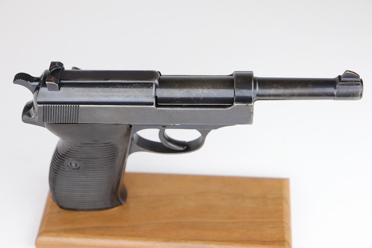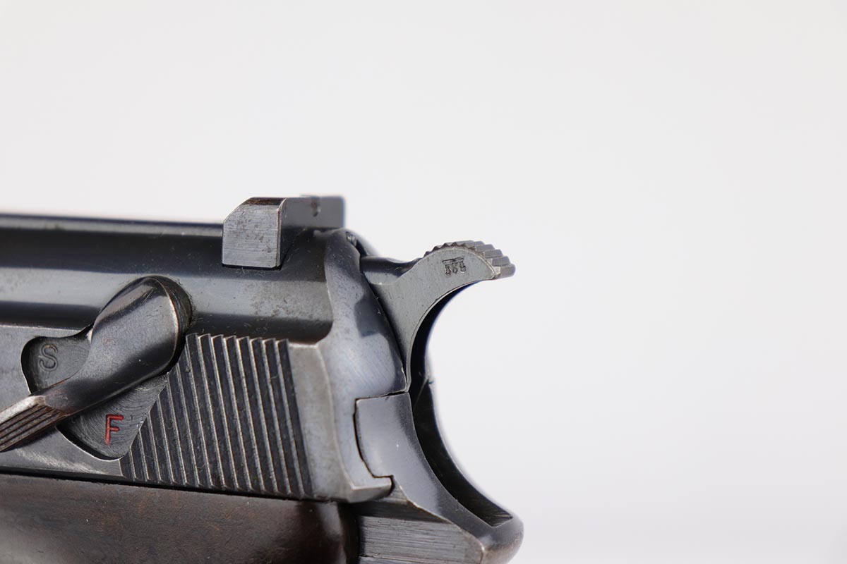 5/30/19 – This is a rare 480 code Walther P.38 from 1940. All numbered parts are matching, including the grips, and the magazine is fewer than 100 digits off! The bluing rates at about 80-85%, with minor thinning along top of barrel and slide, edge wear on all sides, and some finish loss on the front strap. There were only about 7,000 of this variation produced with 480 code on the trigger guard, making it one of the rarest P.38 variations. The magazine is correct and original, with proper double E/359 stamp at base of spine. Like most of the early Walther P.38’s, the small parts are all correctly waffen proofed. Good mechanics, including de-cocker. Bore has strong rifling but some frost throughout.