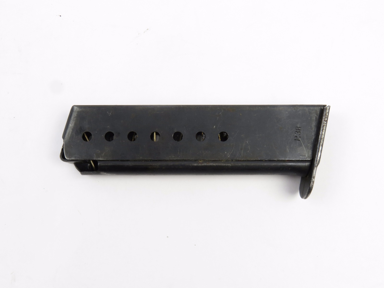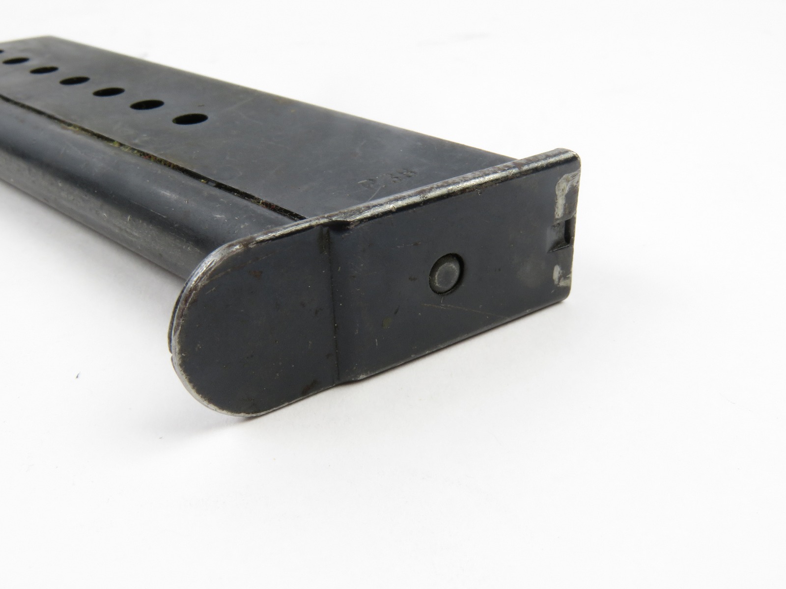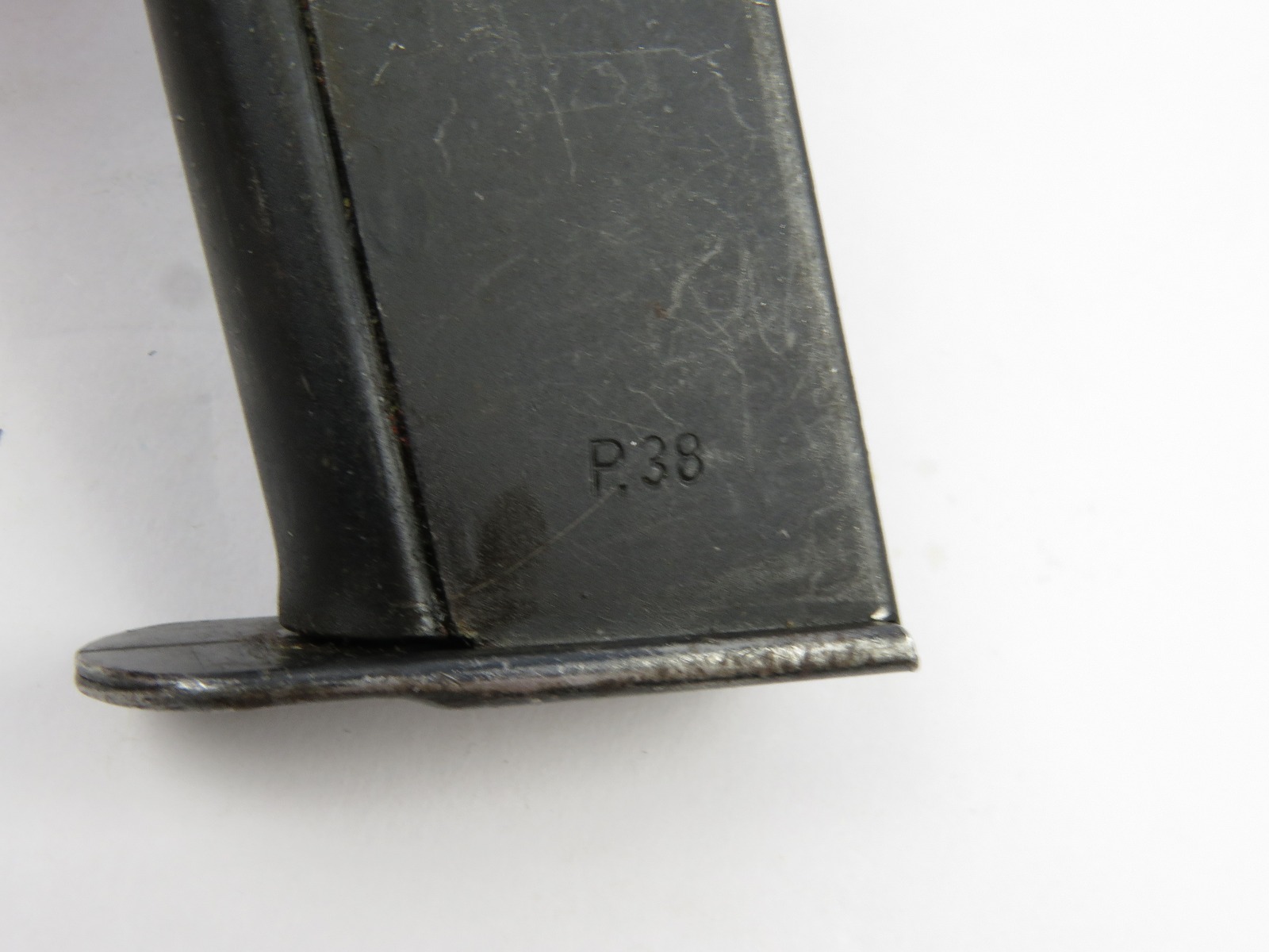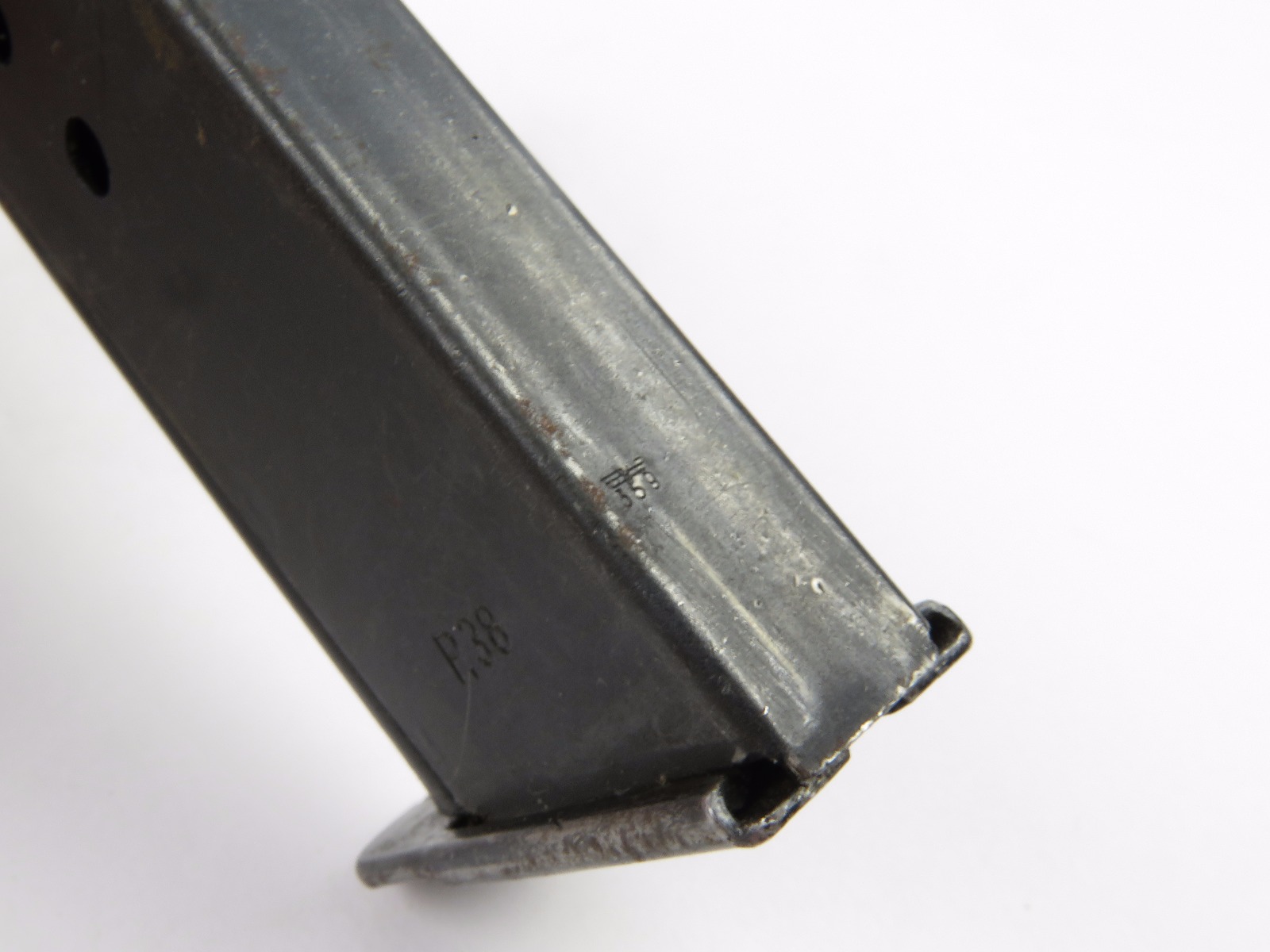 7/26/17 – This is an original early variation Walther P.38 magazine. The spine of the magazine is stamped with two eagle/359 proof stamps. The left side of the frame is “P.38” stamped. The magzine has some minor spots of rust on the spine, but otherwise there are no issues. Mechanically sound and fully functional. Guaranteed original.