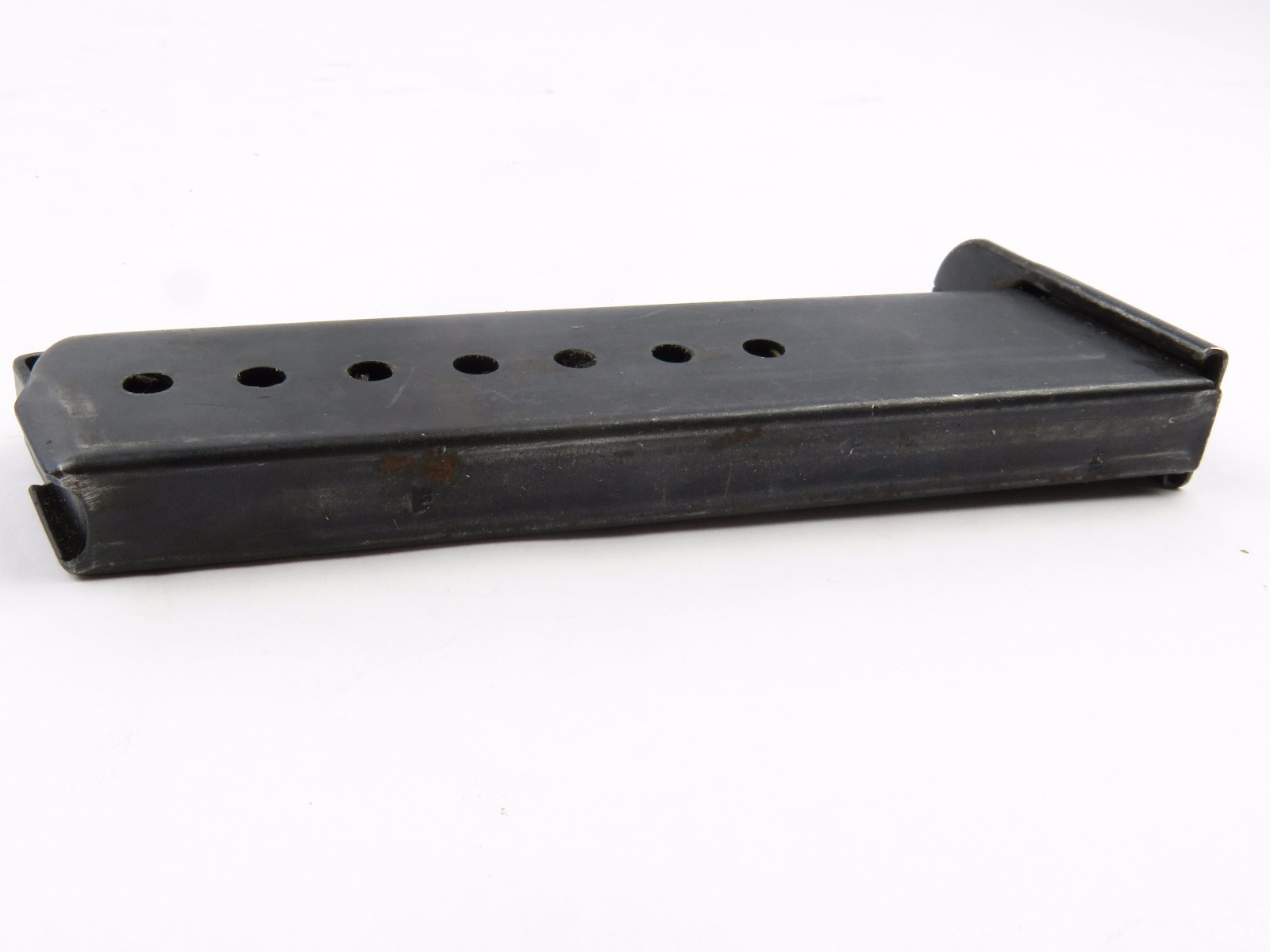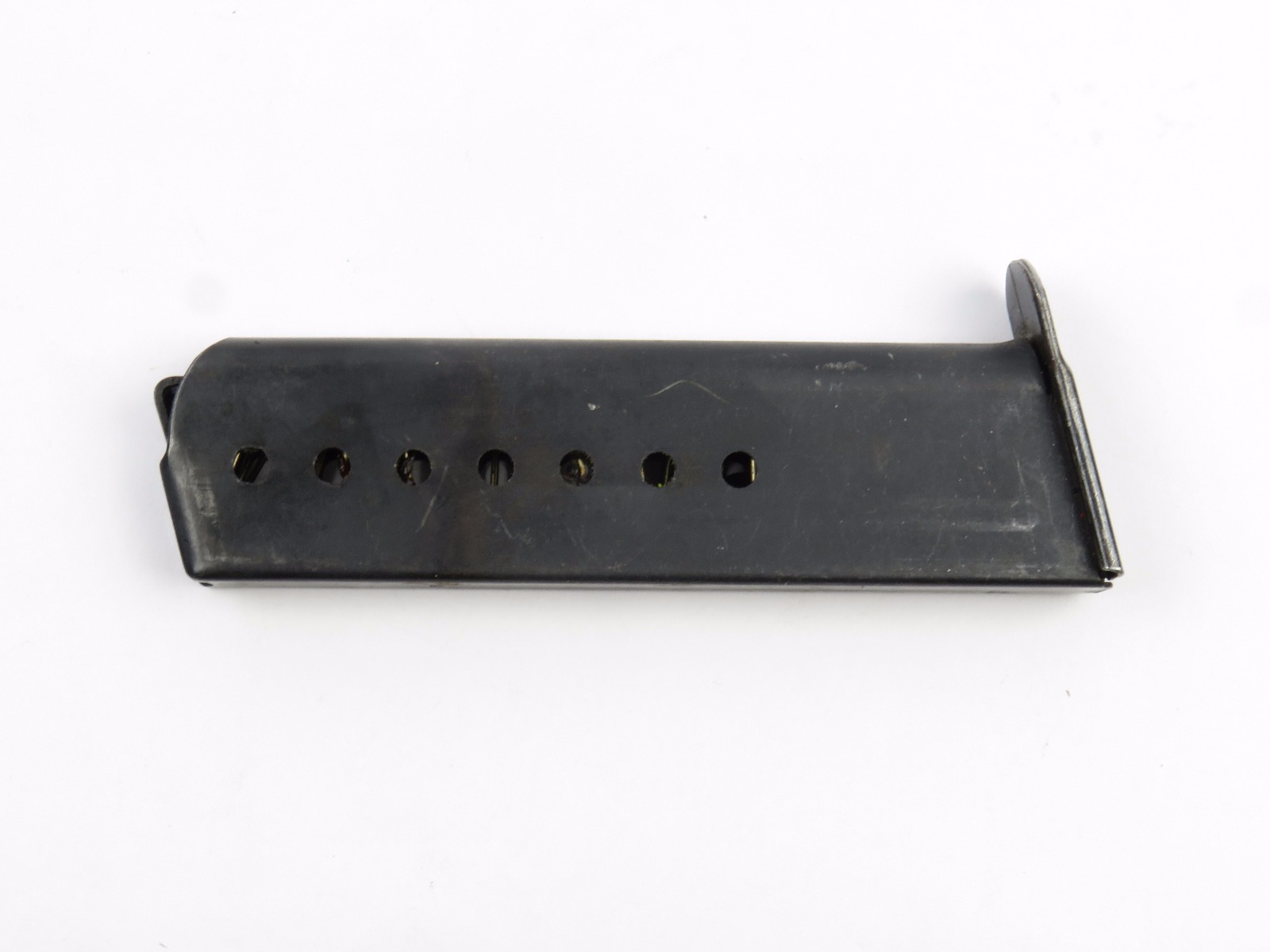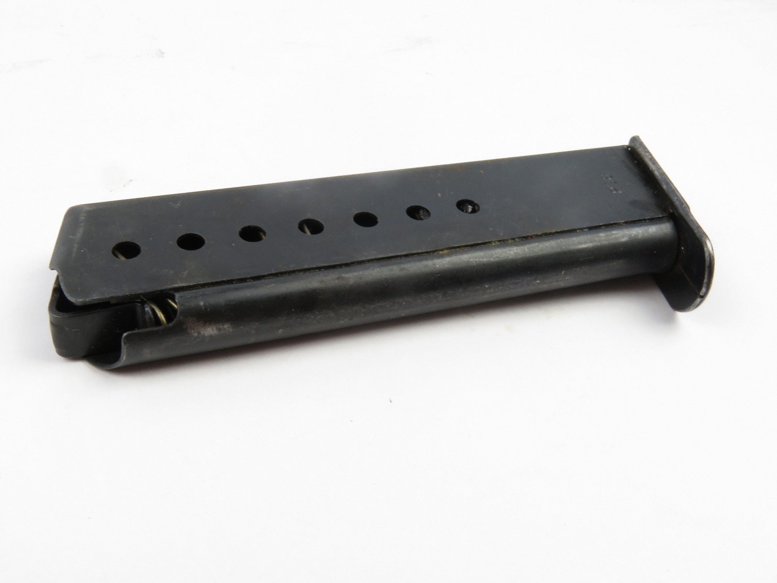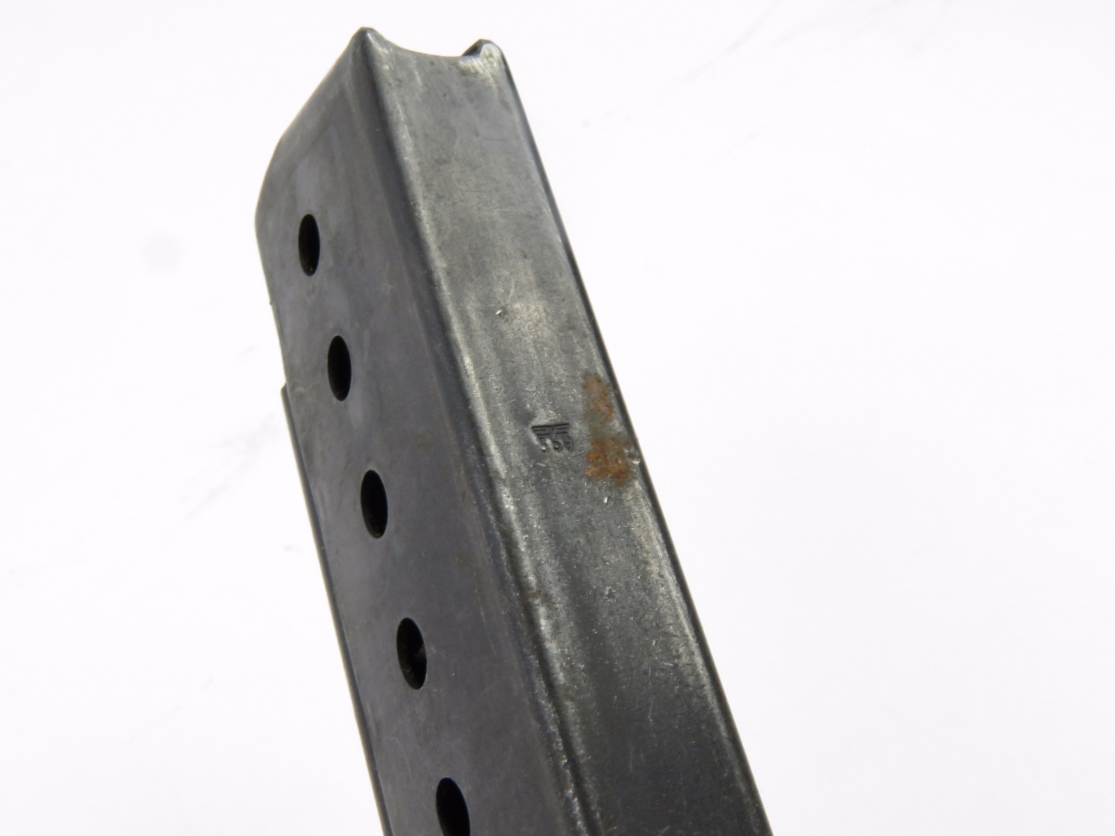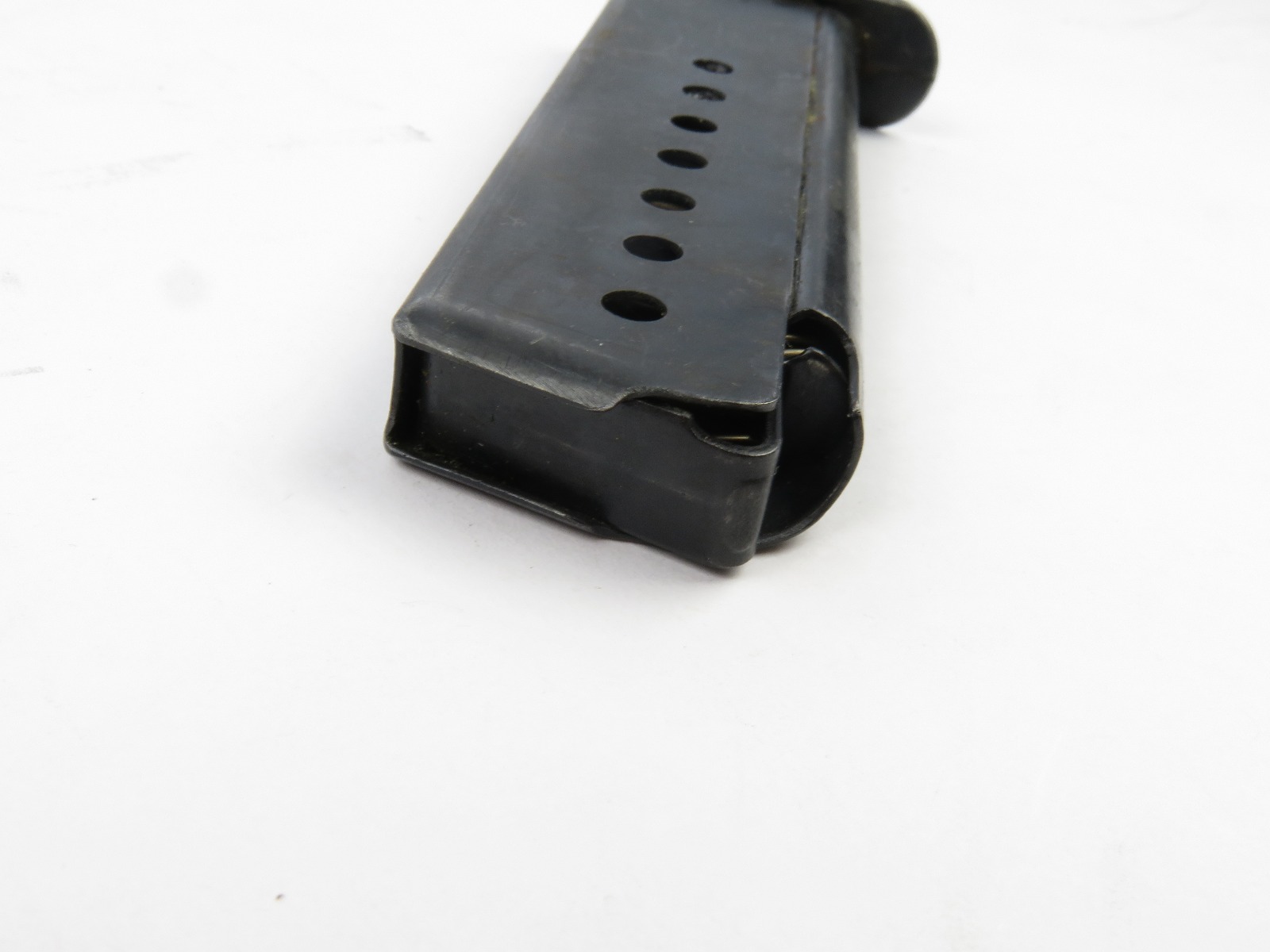7/26/17 – This is an original early variation Walther P.38 magazine. The spine of the magazine is stamped with two eagle/359 proof stamps. The left side of the frame is “P.38” stamped. The magzine has some minor spots of rust on the spine, but otherwise there are no issues. Mechanically sound and fully functional. Guaranteed original.