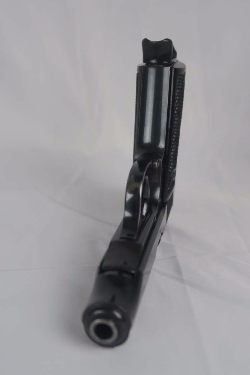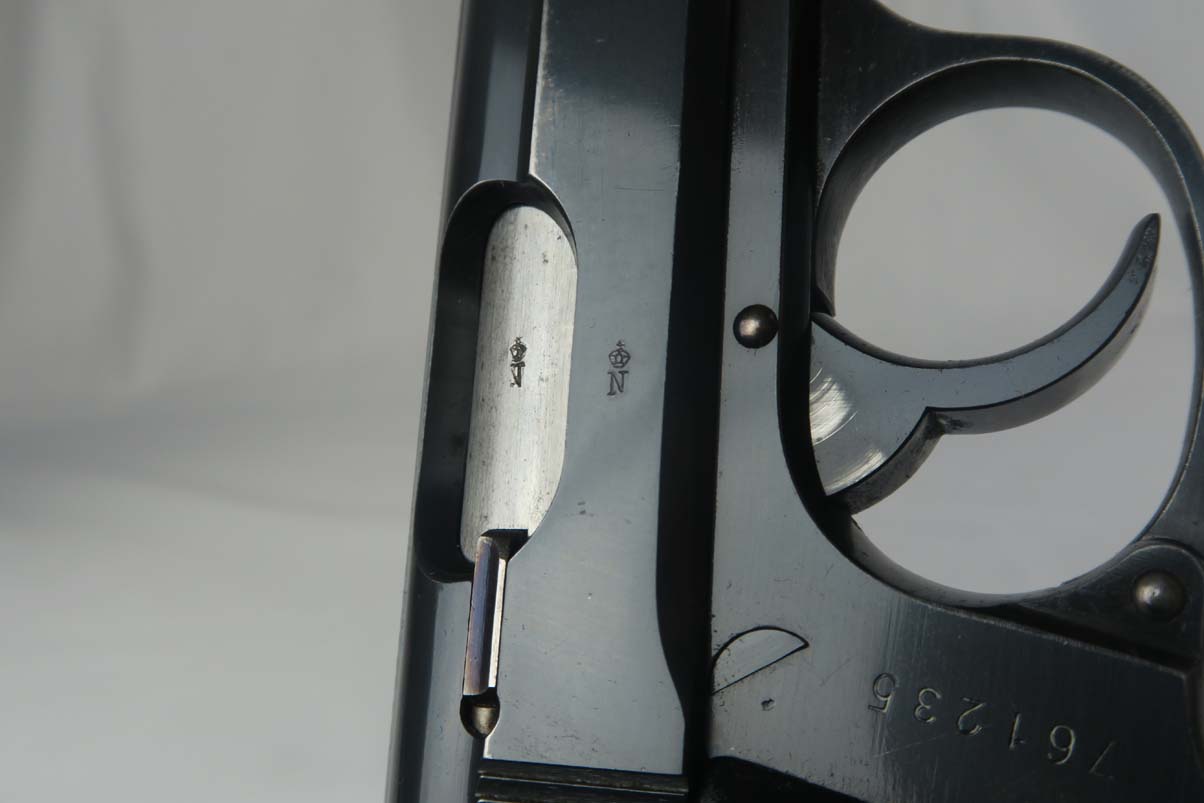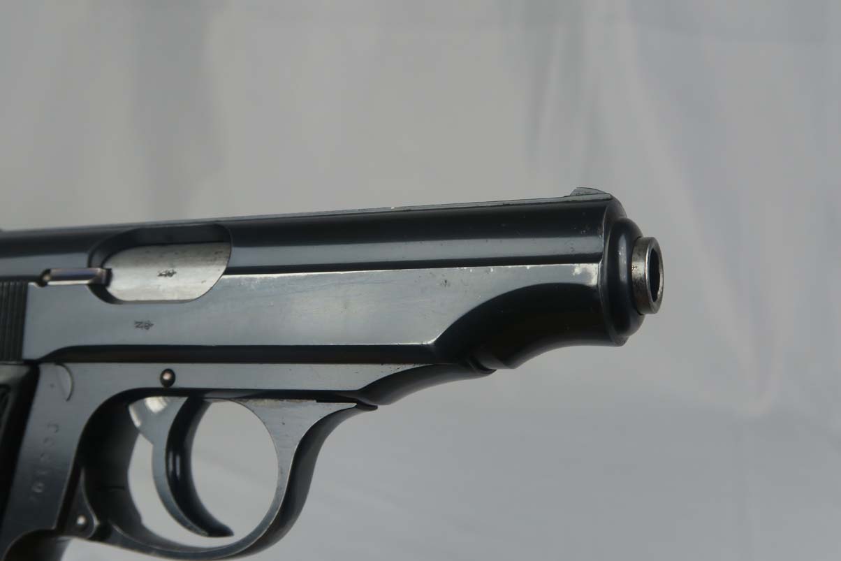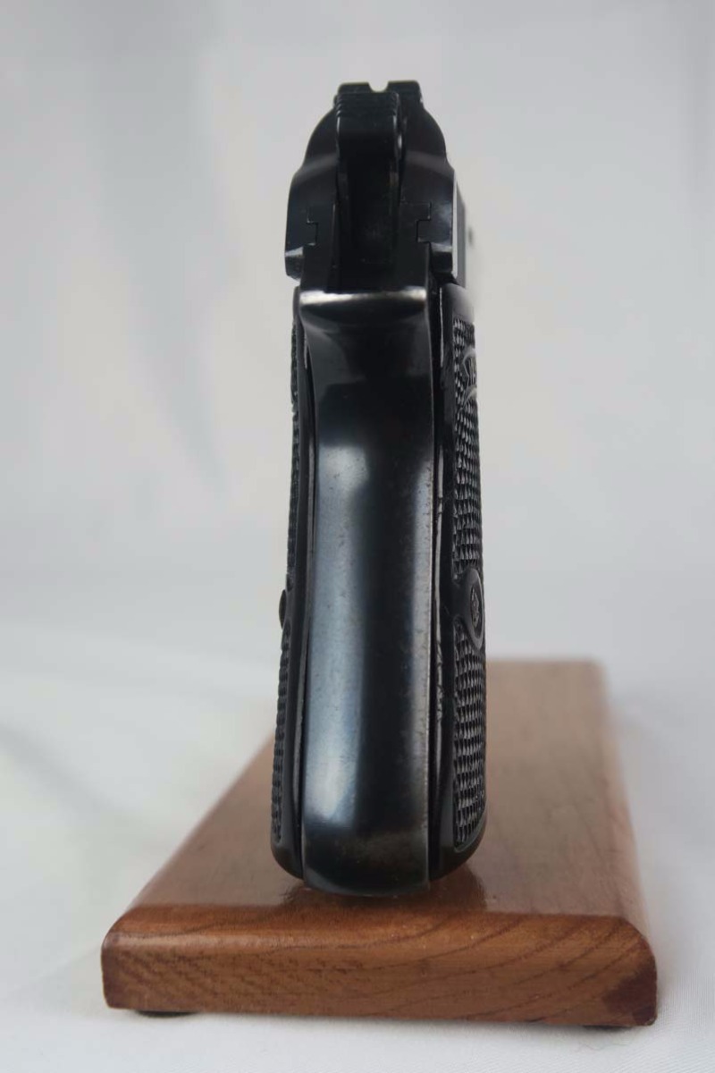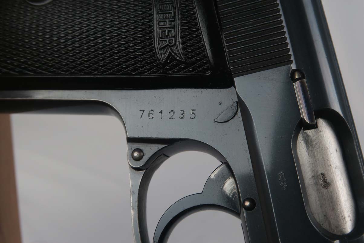 3/6/17 – This is an early serial number production PP. Serials started in 1929 with 750000. So this one was among the first 11,000 made and most likely 1929 or 1930. Early features include the enclosed firing pin, the extended barrel, and the reversed serial numbering on the frame. The original finish is about 95-96%. The bore is excellent and shiny – like new. It comes with the early weighted grips and an early banner only, and “no lip” finger extension magazine. Unfortunately, the safety, which was originally a 90 degree was swapped for a 60 degree. This was fairly common for the early guns as the early safeties had enough design flaws that the factory went to the 60 degree and subsequently many of the early safties were replaced. Nonetheless this gun functions properly and is mechanically sound.