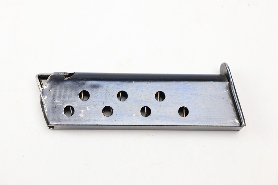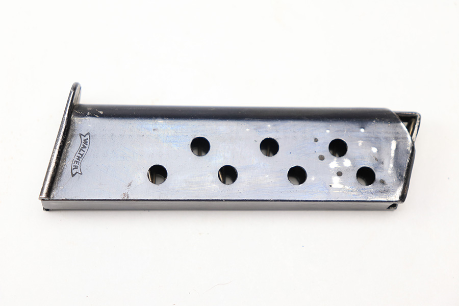 1/7/22 – This is an original early / pre WW2 production Walther PP magazine. The magazine has a high polish finish and Walther banner stamped on the tube. There is some mild surface wear and finish loss but no rust or pitting. The spring is strong and fully functional.