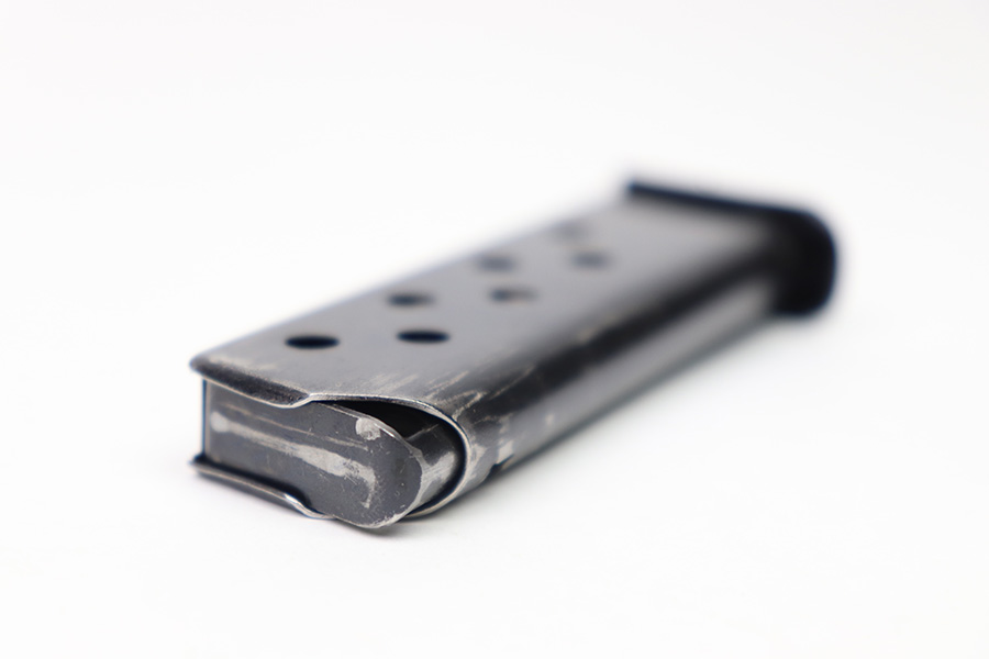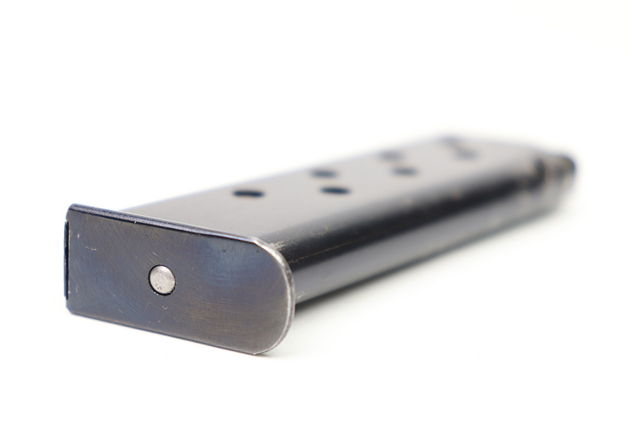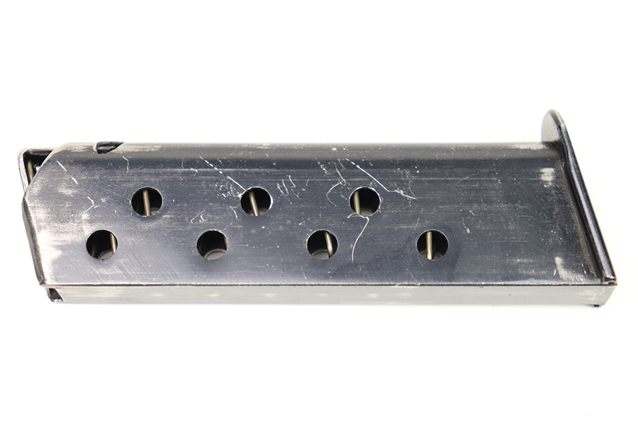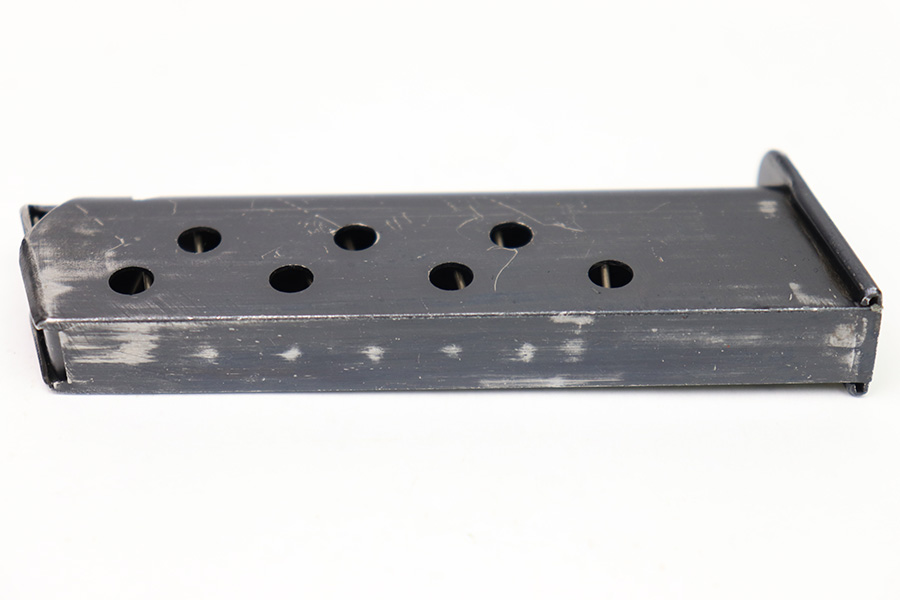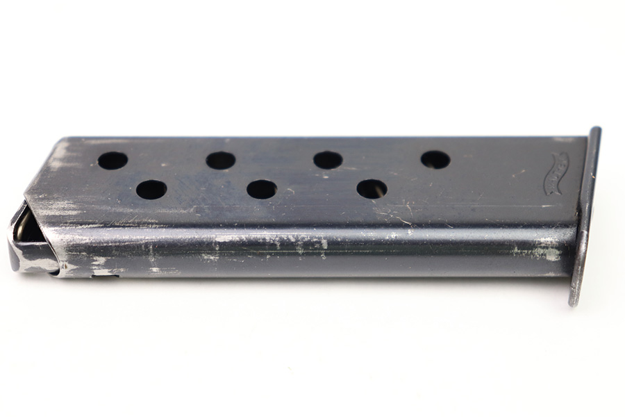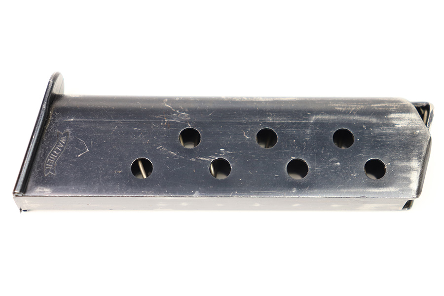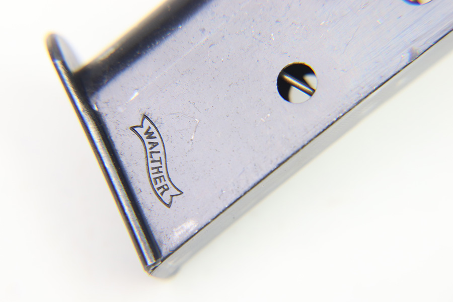 10/6/22 – This is an early / pre WW2 production Walther PP magazine. The magazine features a Walther banner stamped on the base of the frame, and a high polish finish. There’s some mild finish loss on the frame, but no rust or pitting. The spring is strong and fully functional. Clean, blank base.