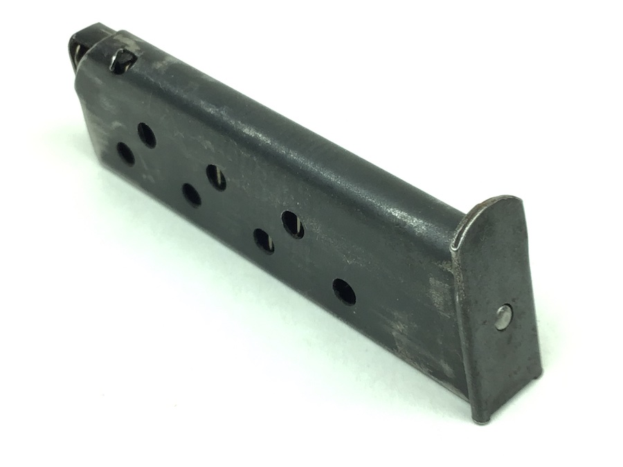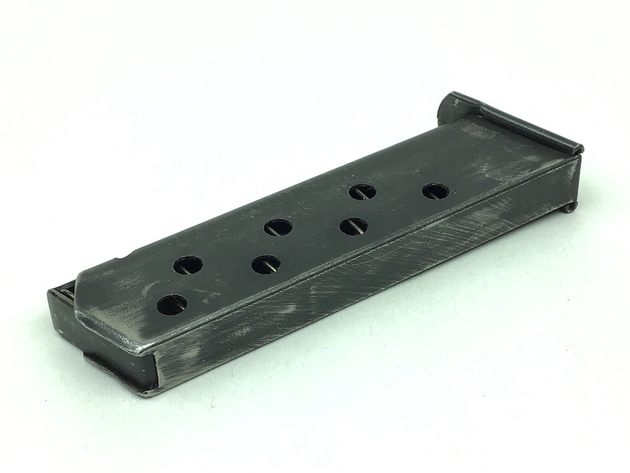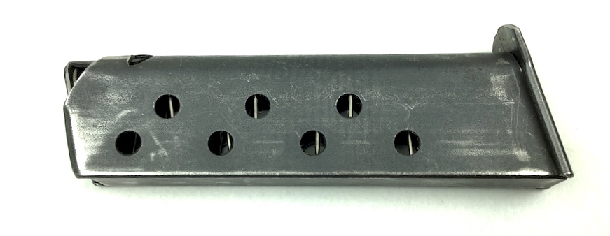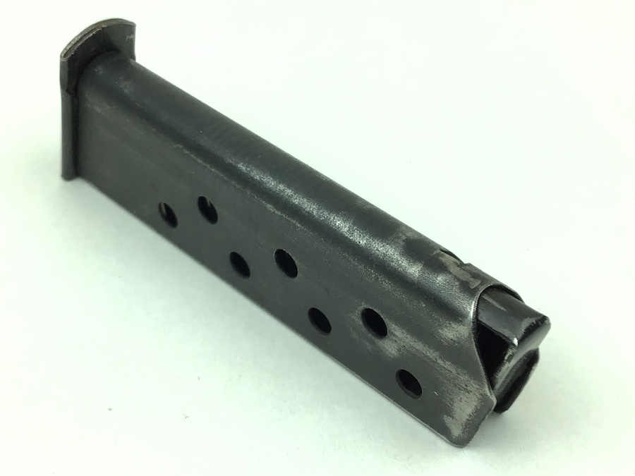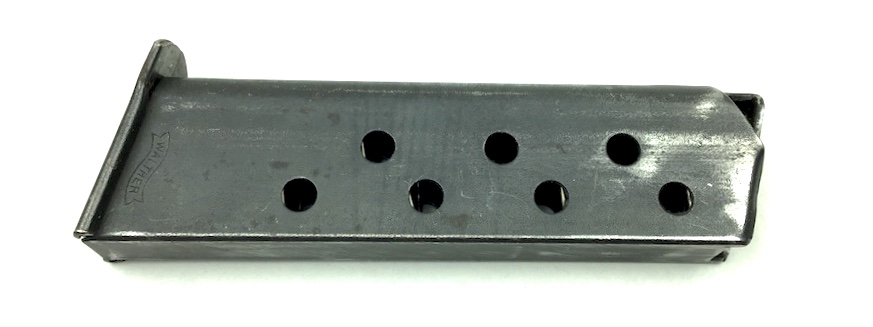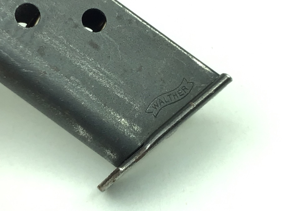 5/6/20 – This is an original, early variation Walther PP magazine. The magazine is stamped on the left side with a Walther banner only. The magazine might be transitional, because it should have a high polish finish if it is truly an early magazine. Instead, the bluing is dull, and looks wartime. The finish is definitely original though, and in great shape with no major rust or pitting. The spring is excellent and fully functional.