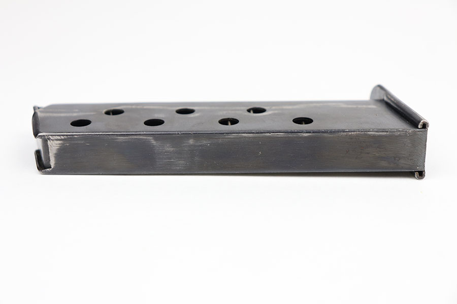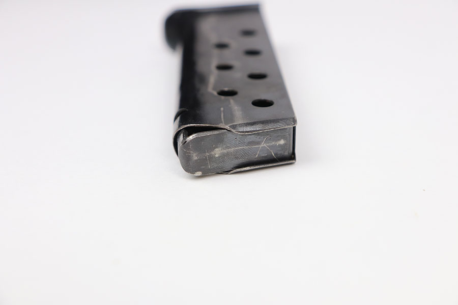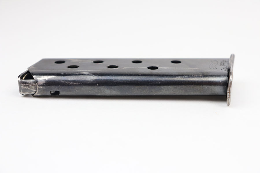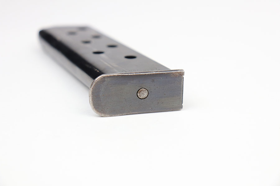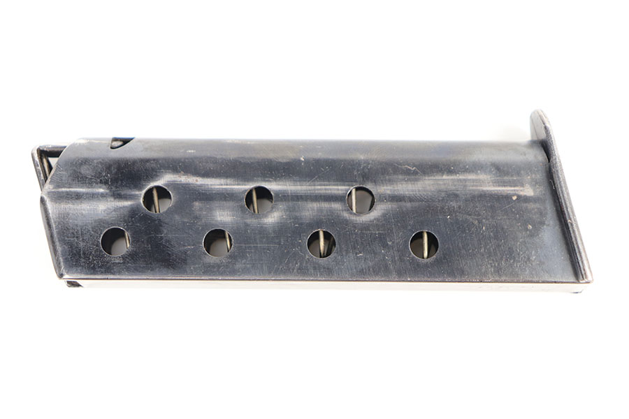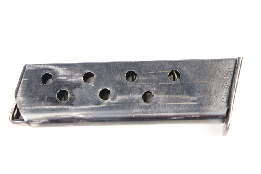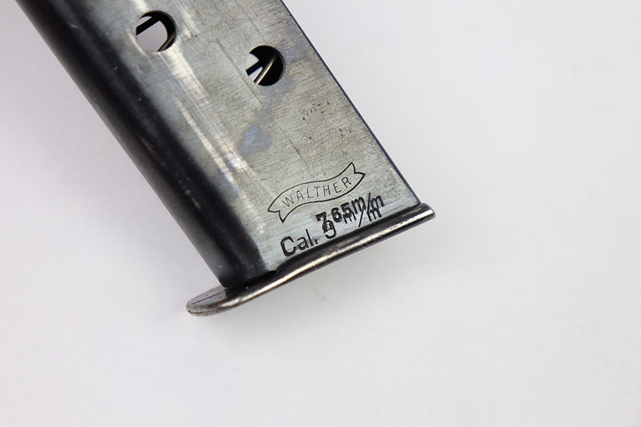 3/25/21 – This is an original, early style Walther PP magazine. The magazine has an excellent high polish blued finish and is stamped with a Walther banner on one side of the frame. The spring is strong and fully functional.