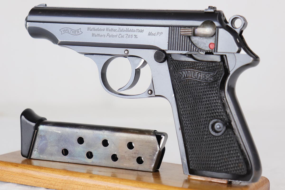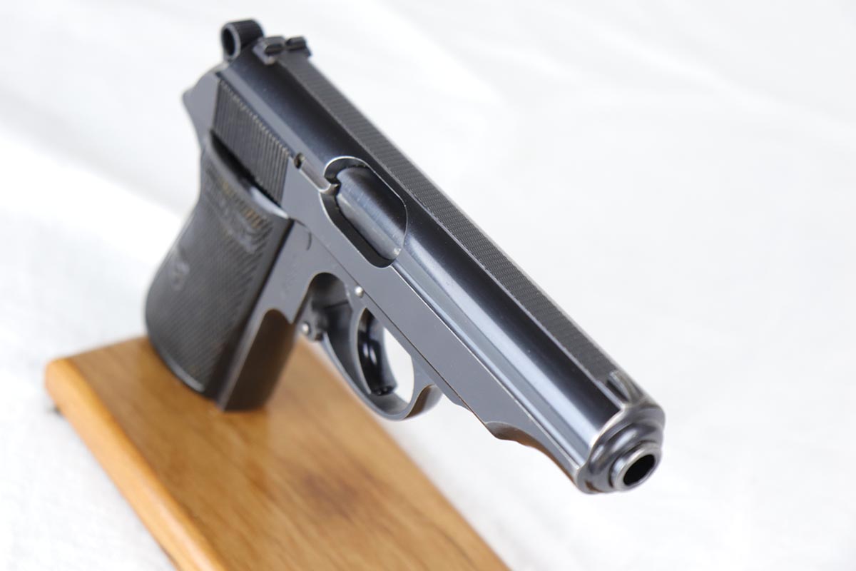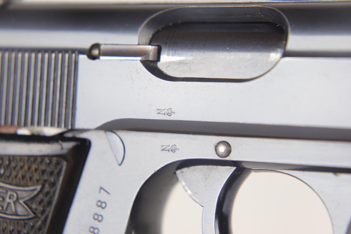 7/31/18 – This is a very early Walther PP with rare but desirable features that are unique to the early 30s Walther PP. This pistol has the earliest variation grips with X-shaped reinforcement. They quickly made the change to the weighted variation in late 1933. It has the early 90 degree safety, and the distinct large ring hammer that was only used for a very short period of time. Also notice that the serial number is reversed on the frame, and the barrel is slightly extended. Internally, it has the early two-piece firing pin and the firing pin assembly is also covered. Slide is internally matching to the frame. The ejection chamber is blued and not proofed, which is correct for this early PP. Finally, it has the early Walther banner magazine with RARE slab side finger extension. These early magazines and grips can sell for $400+ each. Minty bore.