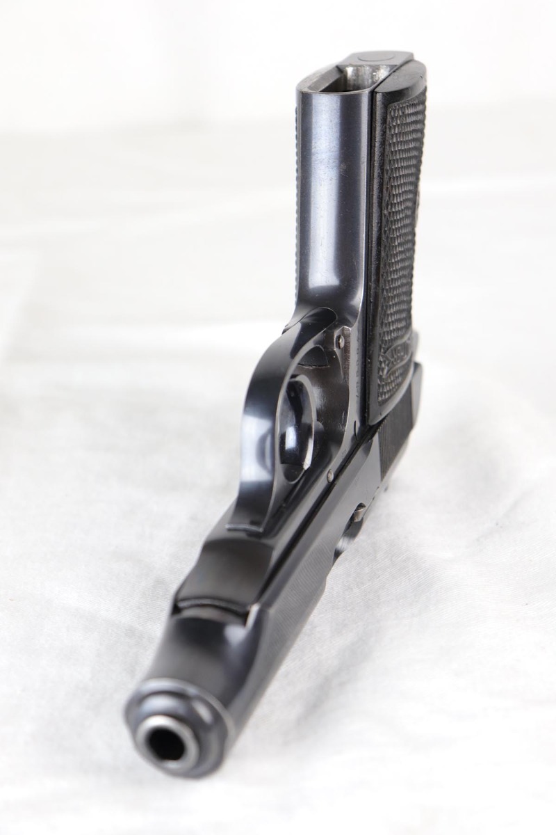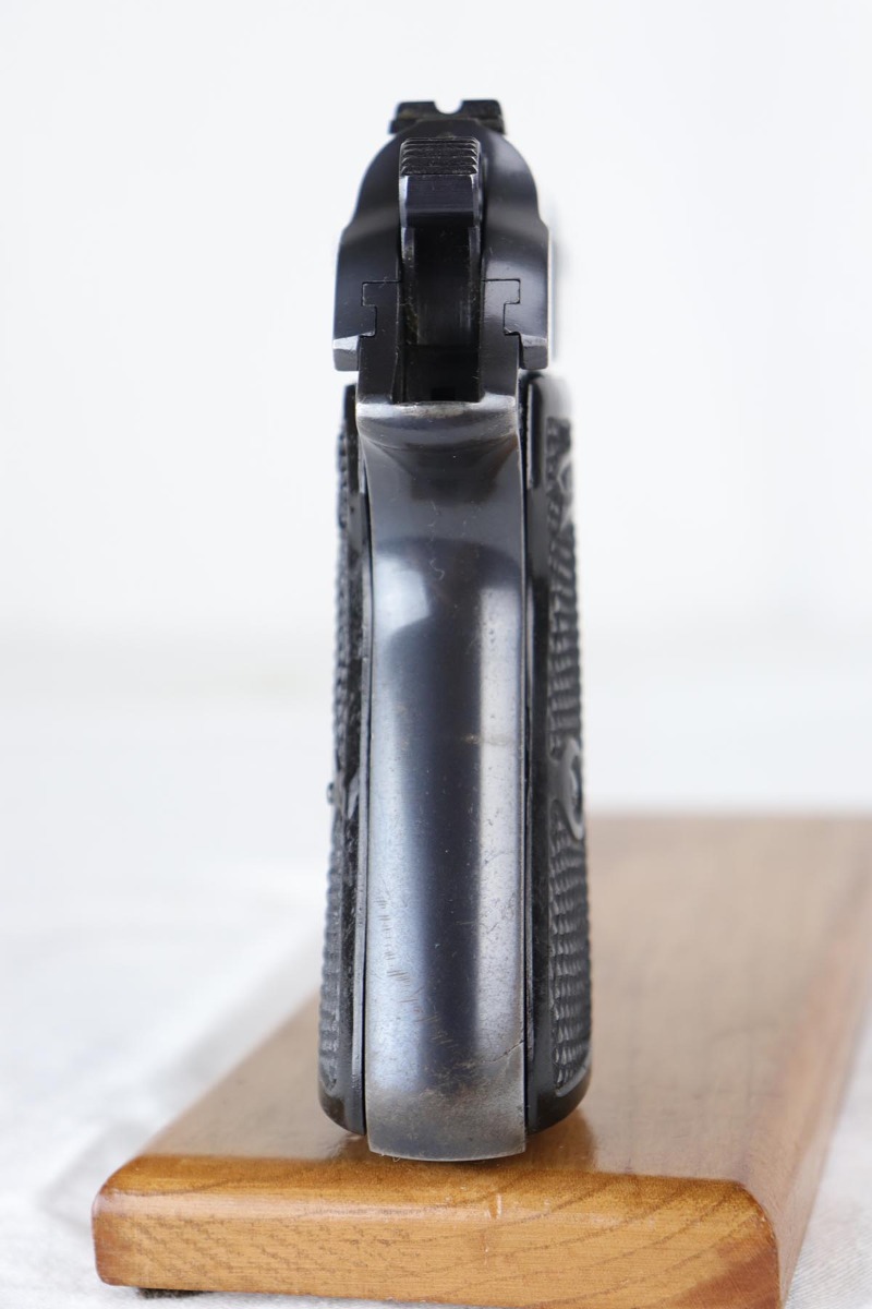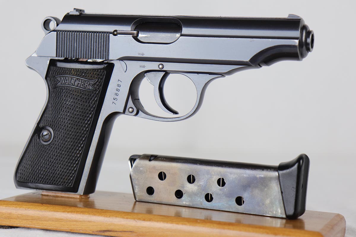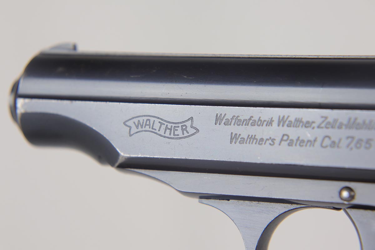 7/31/18 – This is a very early Walther PP with rare but desirable features that are unique to the early 30s Walther PP. This pistol has the earliest variation grips with X-shaped reinforcement. They quickly made the change to the weighted variation in late 1933. It has the early 90 degree safety, and the distinct large ring hammer that was only used for a very short period of time. Also notice that the serial number is reversed on the frame, and the barrel is slightly extended. Internally, it has the early two-piece firing pin and the firing pin assembly is also covered. Slide is internally matching to the frame. The ejection chamber is blued and not proofed, which is correct for this early PP. Finally, it has the early Walther banner magazine with RARE slab side finger extension. These early magazines and grips can sell for $400+ each. Minty bore.