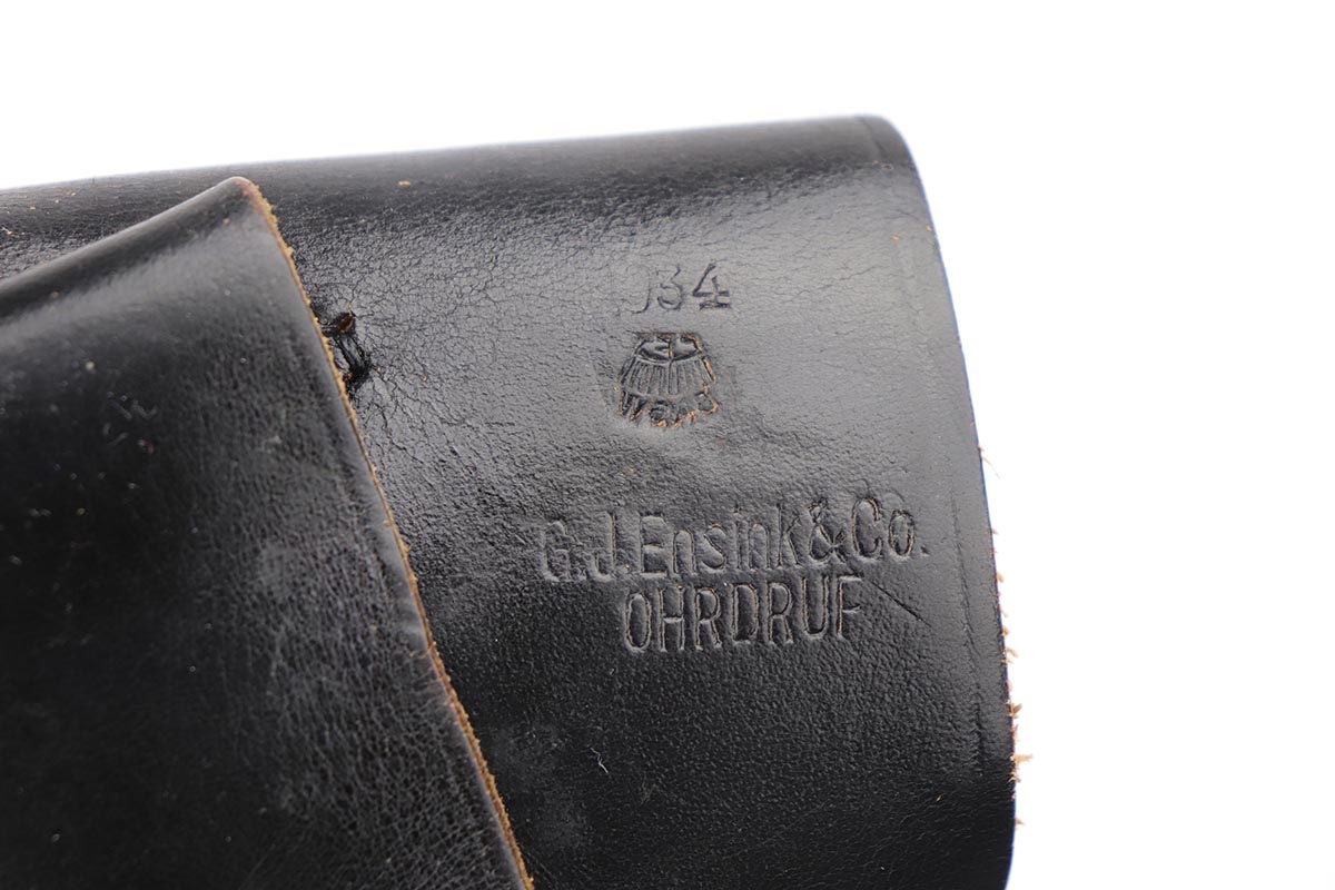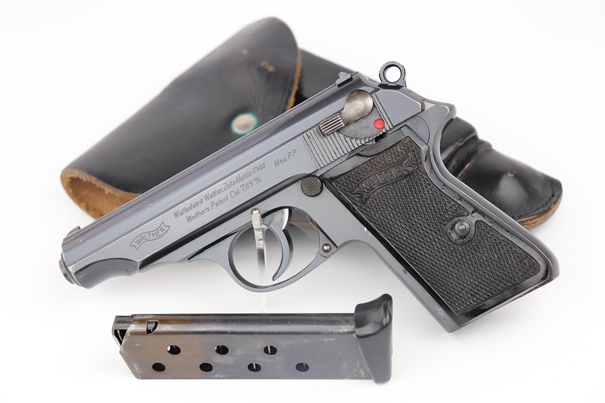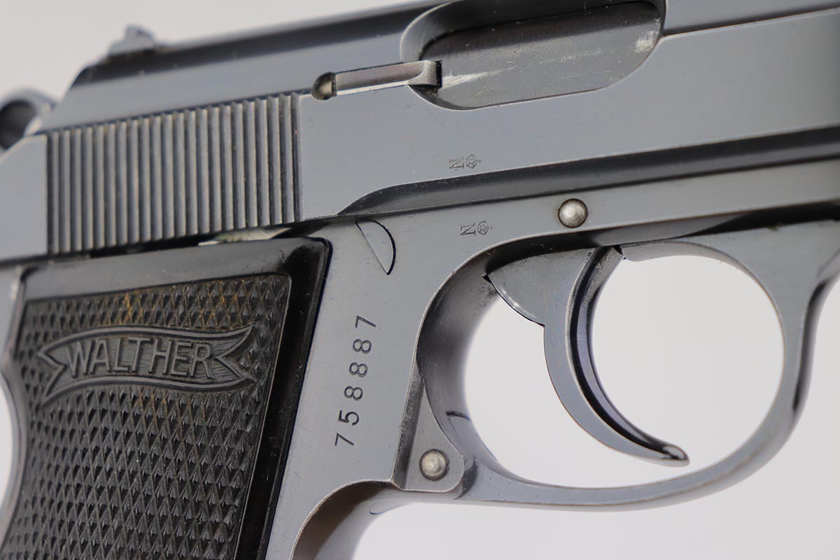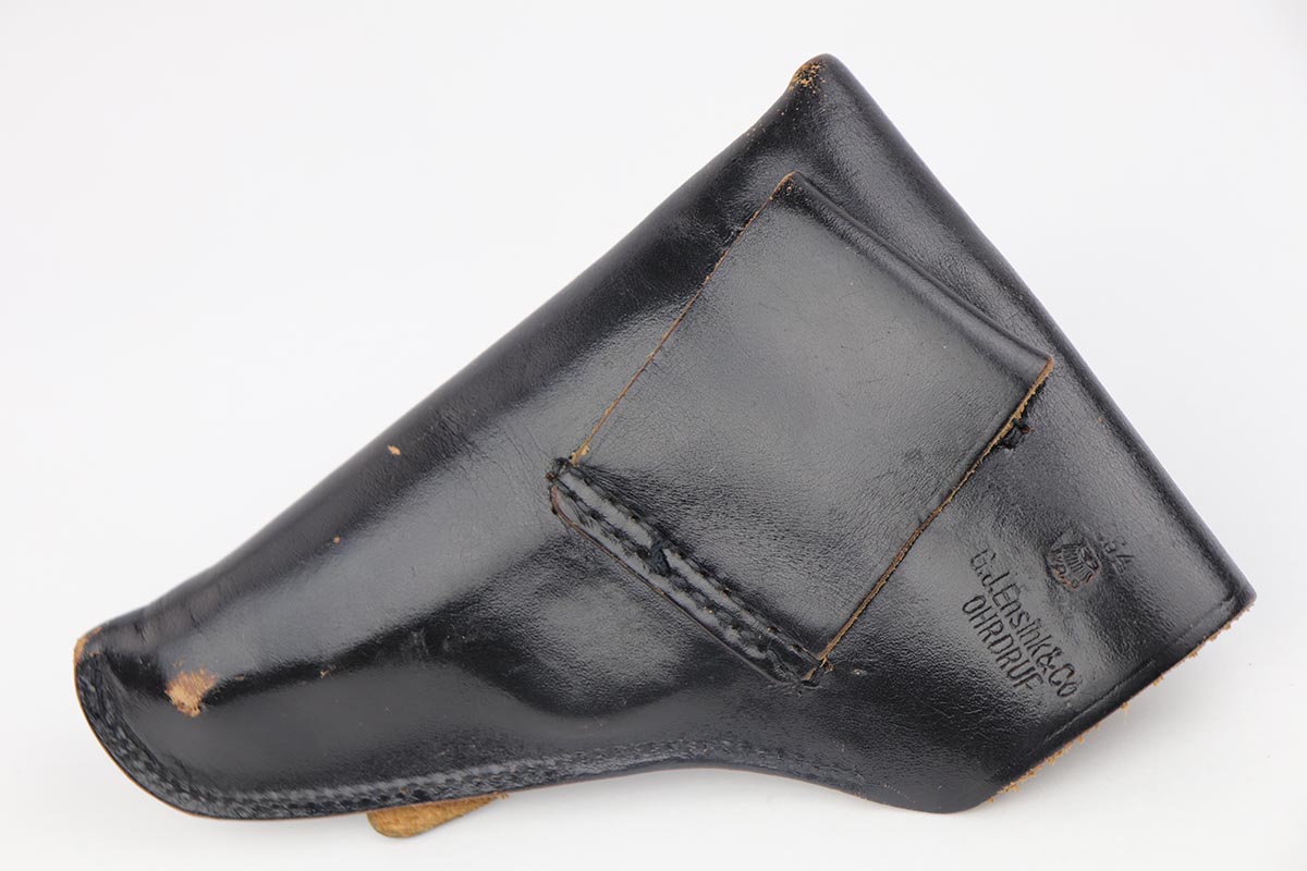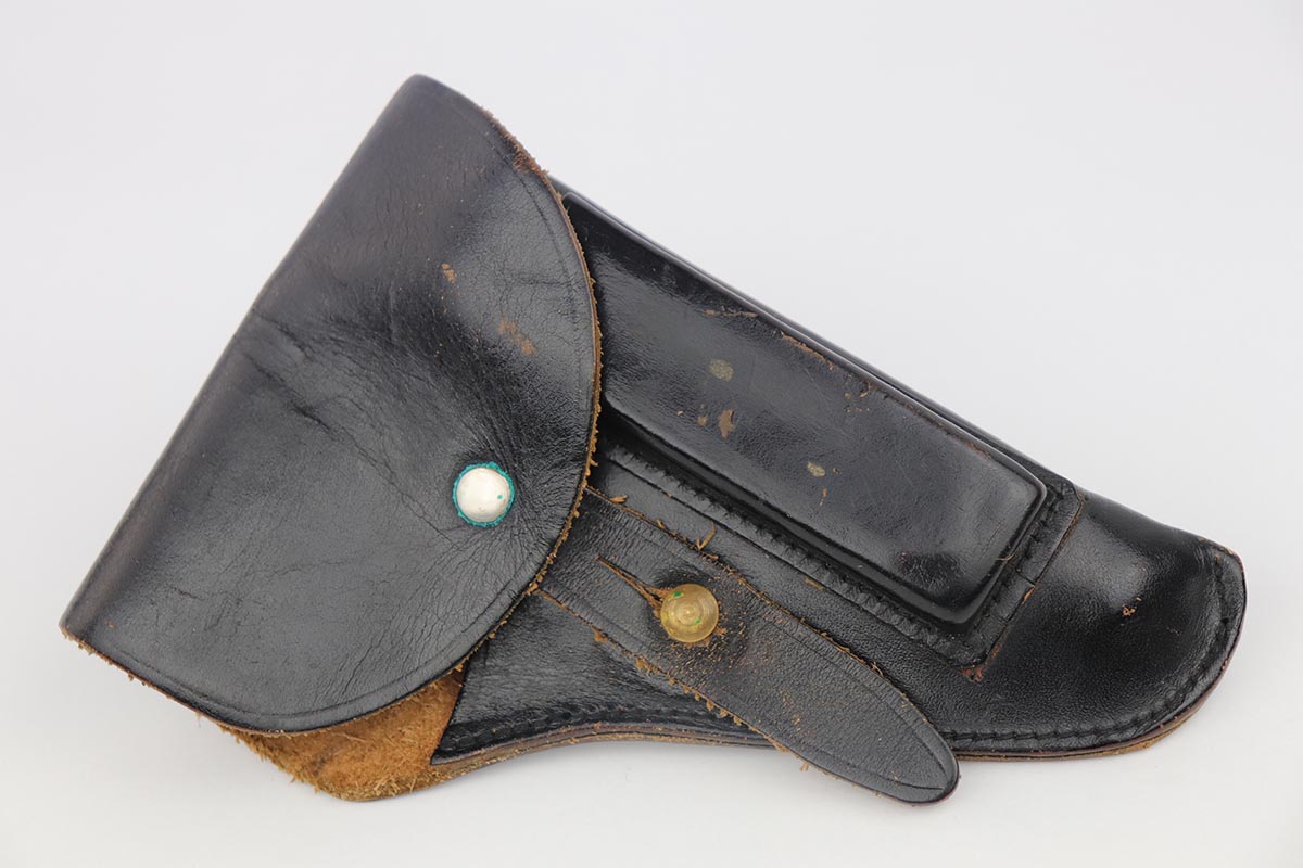 7/23/19 – This is a very early Walther PP with many of the unique, desirable features only found on some of the first PP’s produced. The gun has basic early features like the upside-down serial and 90 degree safety, but also has the large ring hammer, slab style magazine and X-backed grips. The pistol is all original and correct with 94-95% of the high-polished blue remaining. It has a very nice profile view with only minor edge wear, but a notable area of finish loss on the back strap. Mint bore and excellent finger extension on the rare magazine. The grips show some age and handling wear but no cracks. Serial dates this pistol to 1930-31, so second or third year of production and one of the first 9,000 ever made. The pistol comes with a 1934 dated holster with sharp waffenamt and G.J. Ensink & Co maker mark.