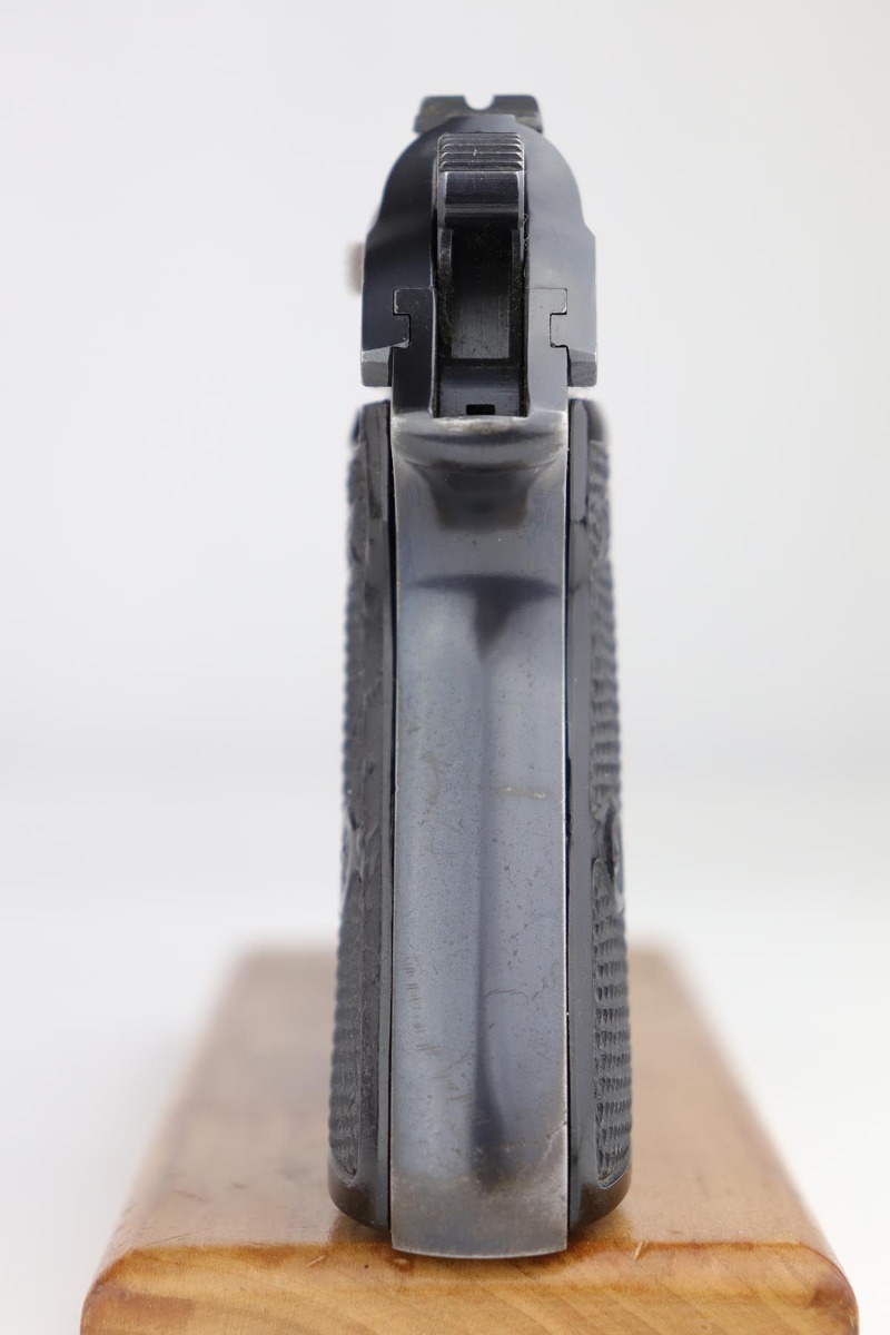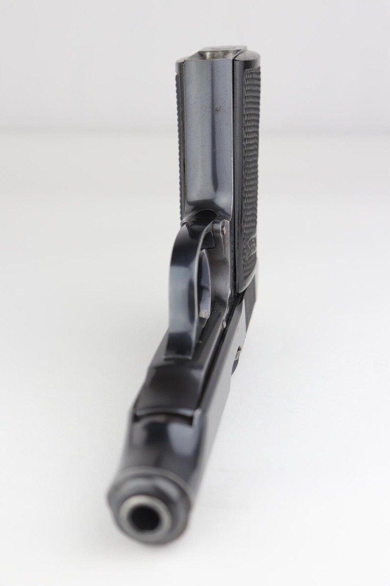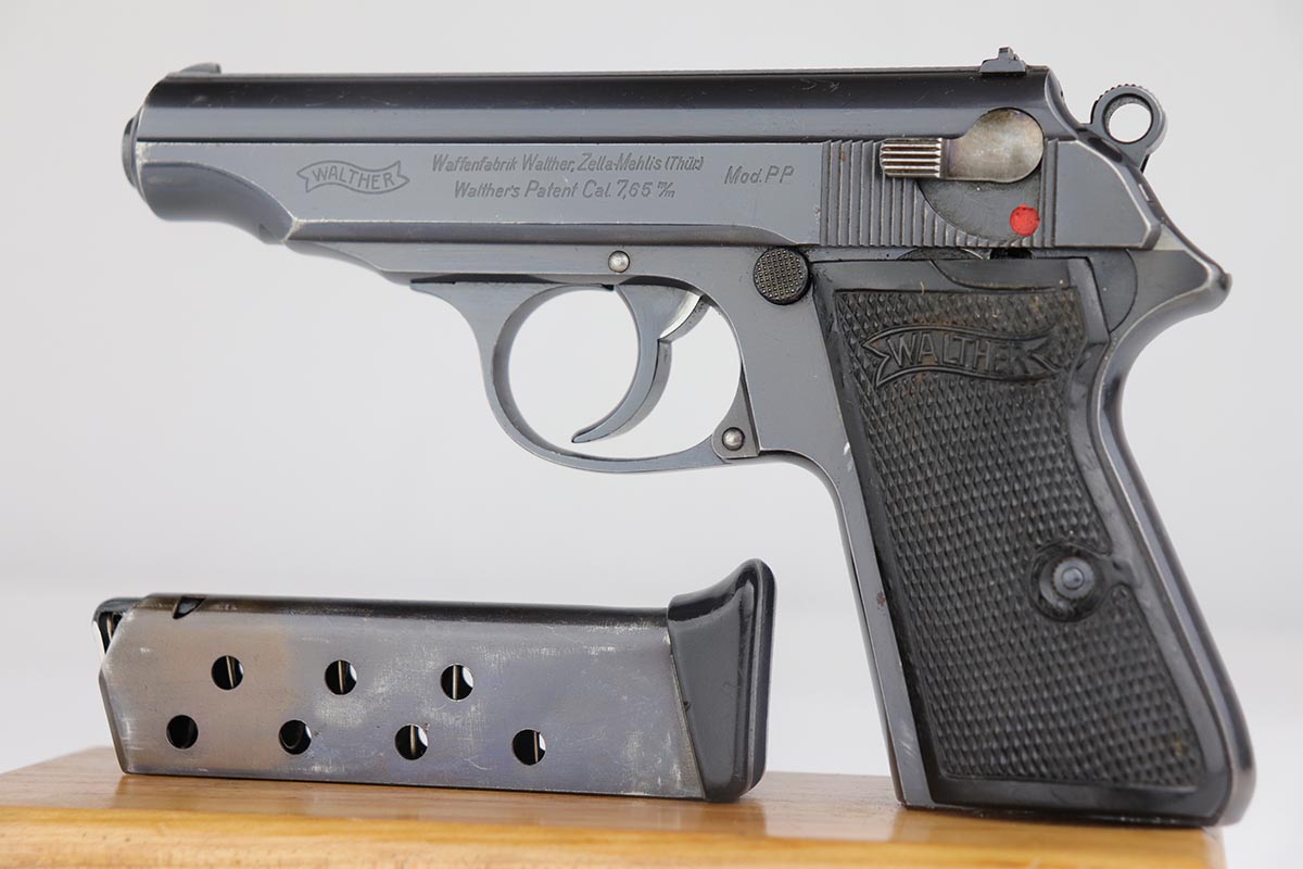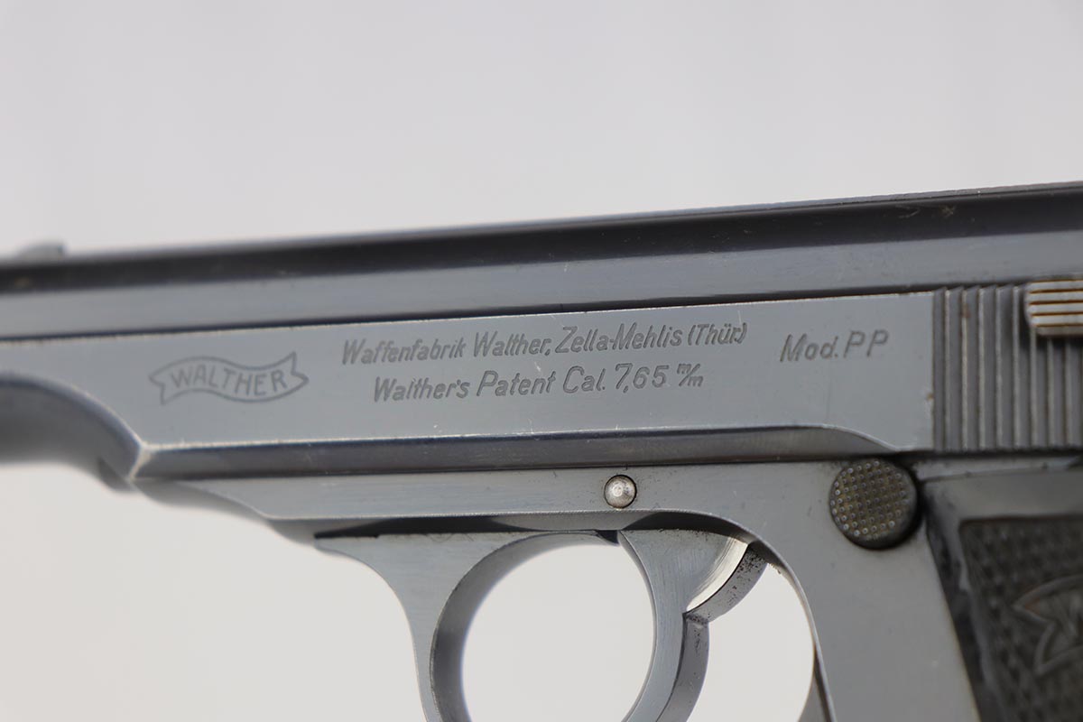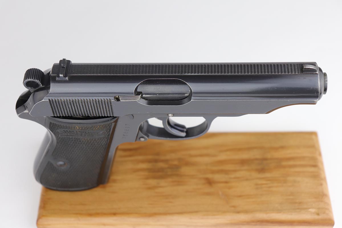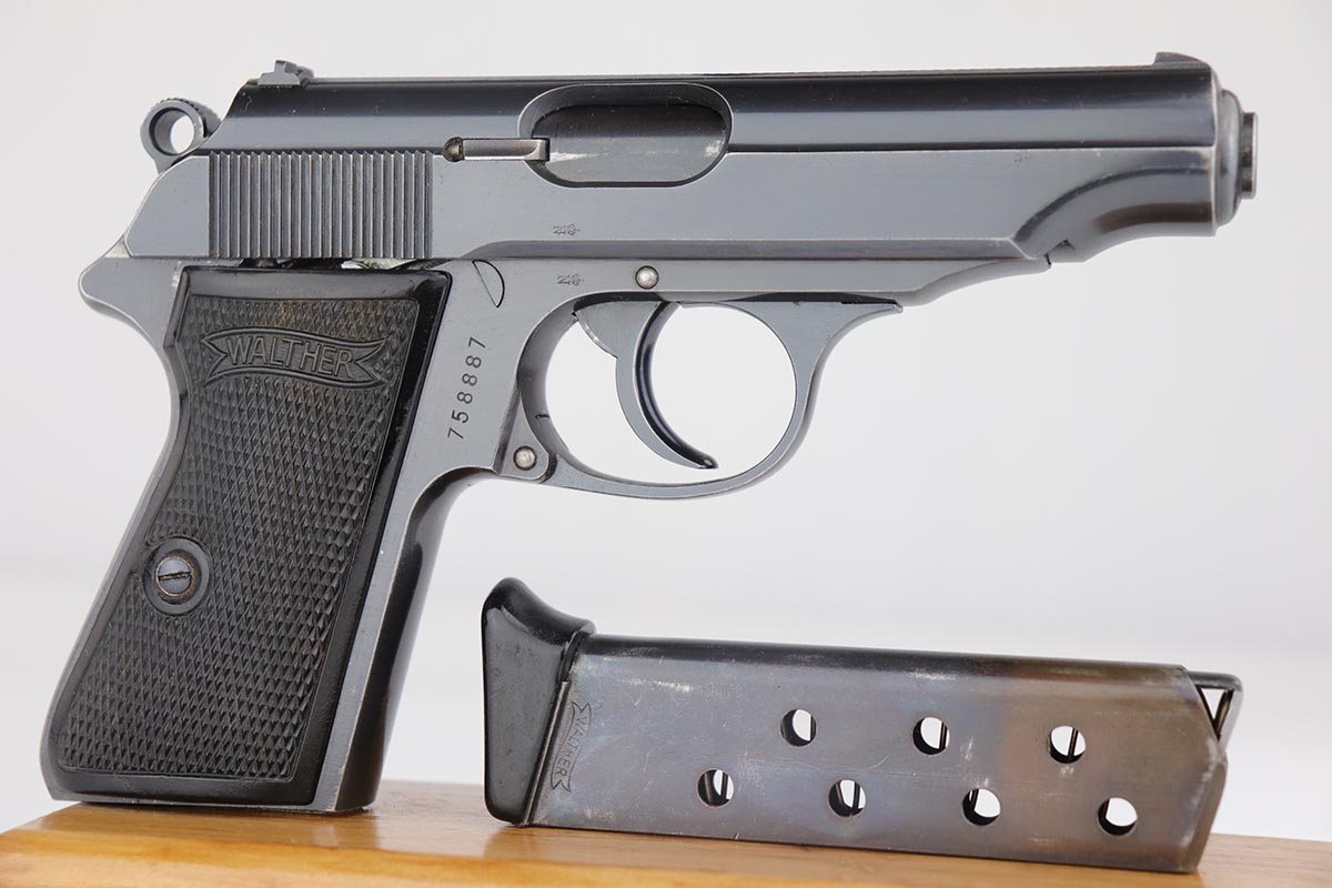 7/23/19 – This is a very early Walther PP with many of the unique, desirable features only found on some of the first PP’s produced. The gun has basic early features like the upside-down serial and 90 degree safety, but also has the large ring hammer, slab style magazine and X-backed grips. The pistol is all original and correct with 94-95% of the high-polished blue remaining. It has a very nice profile view with only minor edge wear, but a notable area of finish loss on the back strap. Mint bore and excellent finger extension on the rare magazine. The grips show some age and handling wear but no cracks. Serial dates this pistol to 1930-31, so second or third year of production and one of the first 9,000 ever made. The pistol comes with a 1934 dated holster with sharp waffenamt and G.J. Ensink & Co maker mark.