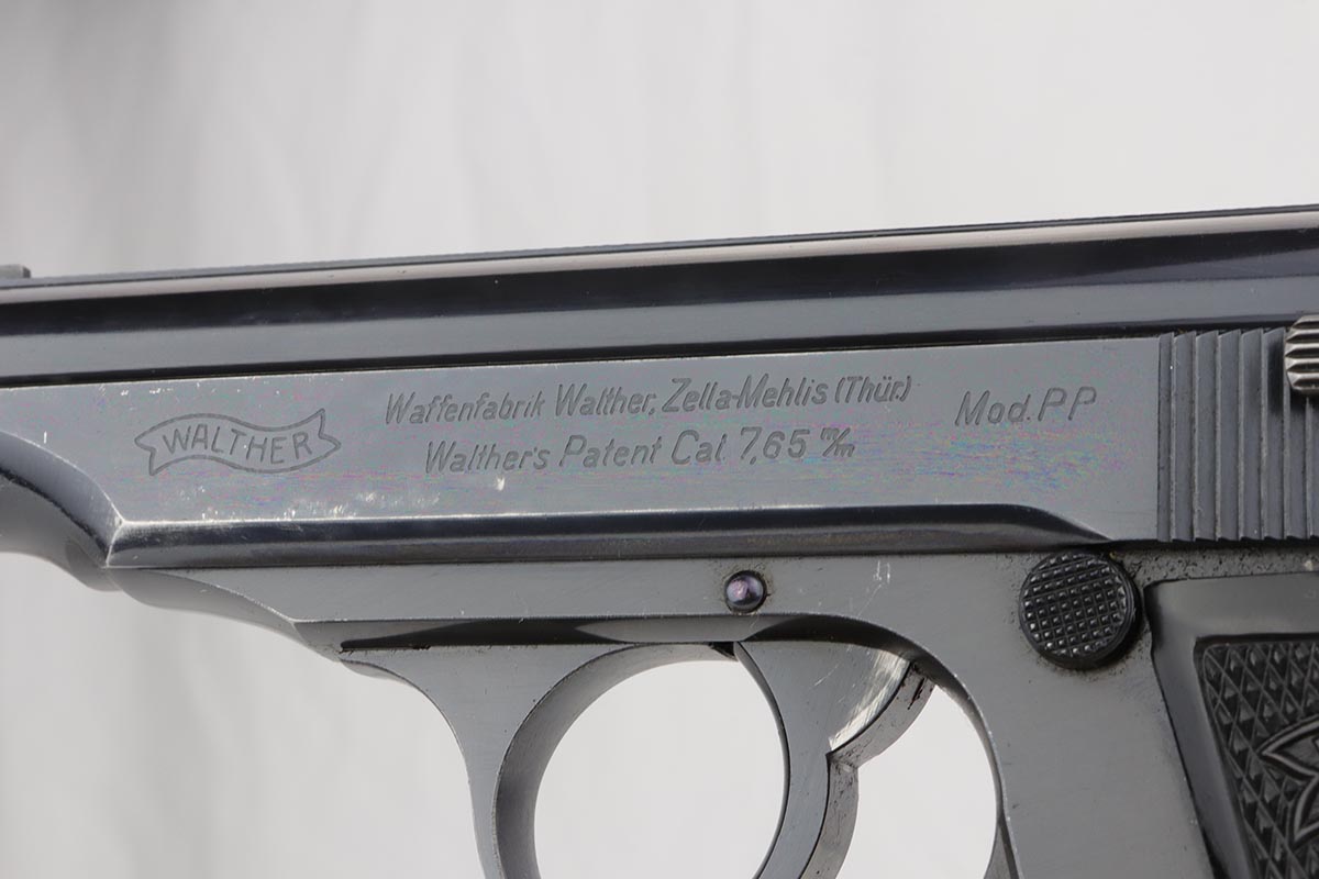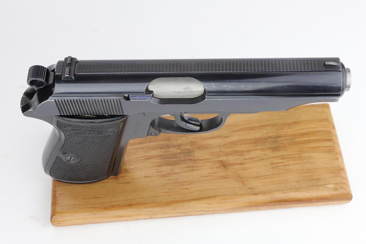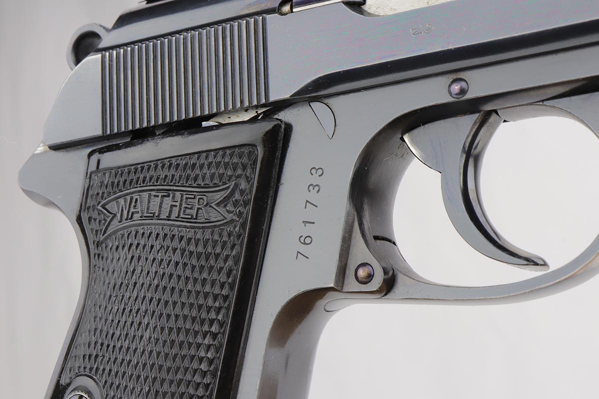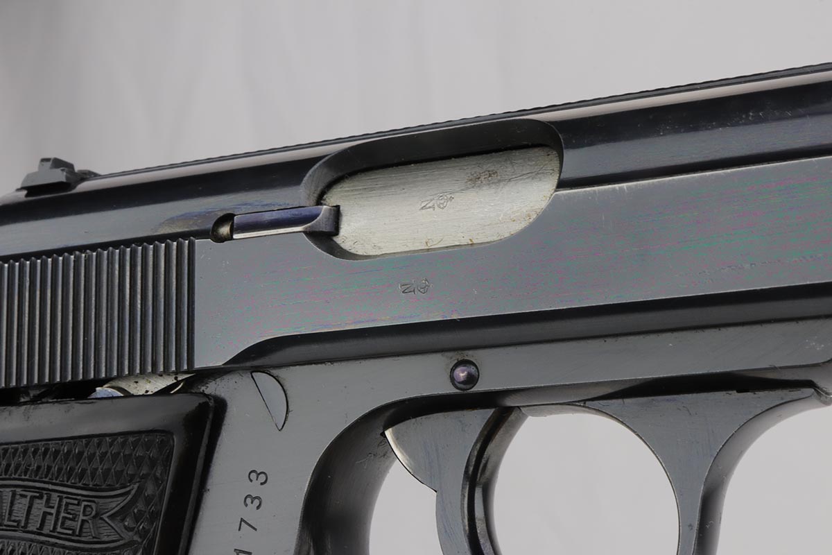 9/18/19 – This is a very early production Walther PP with some unique early features.  First, the grips are the early “X” reinforced grips.   The hammer is “large ring”.   The serial number is reversed, as they are in all 1st year production guns.   90 degree safely.   Rectangular (2 piece) firing pin and extended barrel.  Original finish is about 95-96%, with wear on the trigger guard and bottom of the back strap. Correct banner only magazine.  Excellent bore.