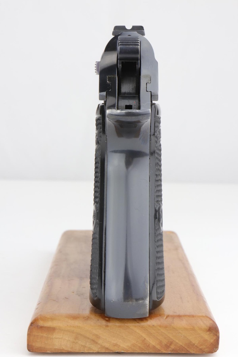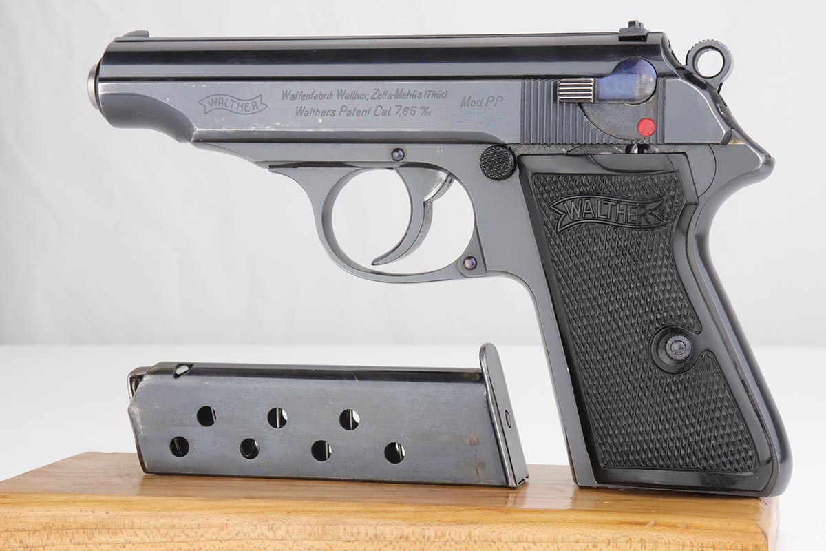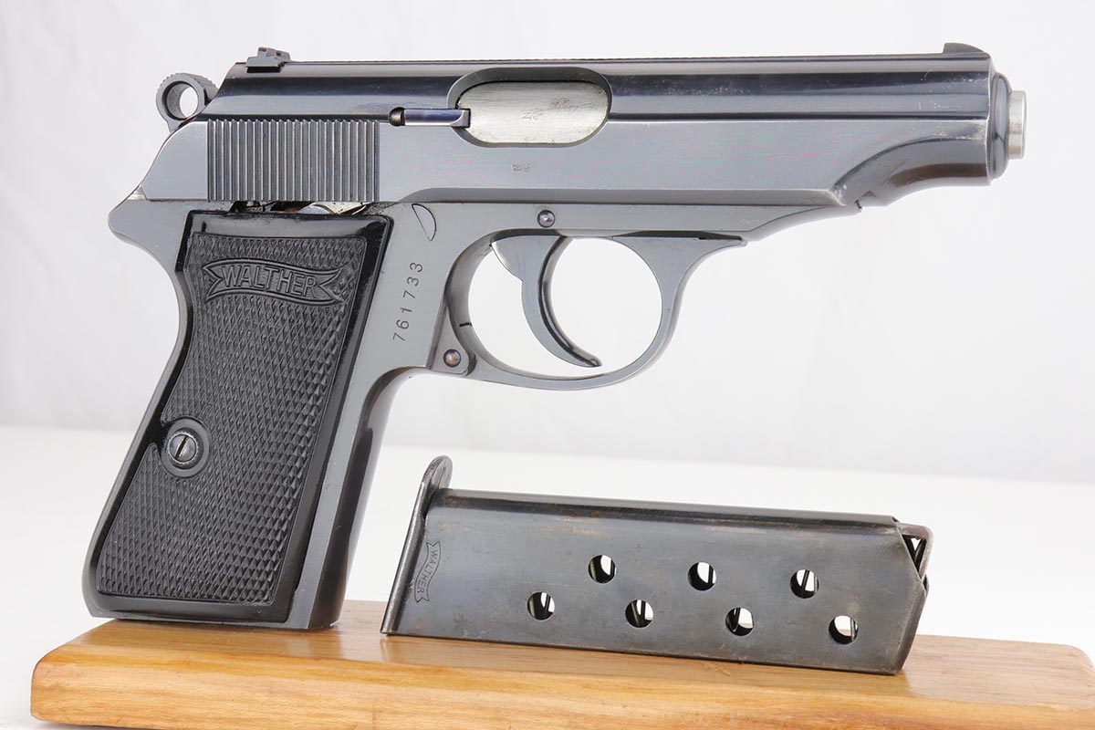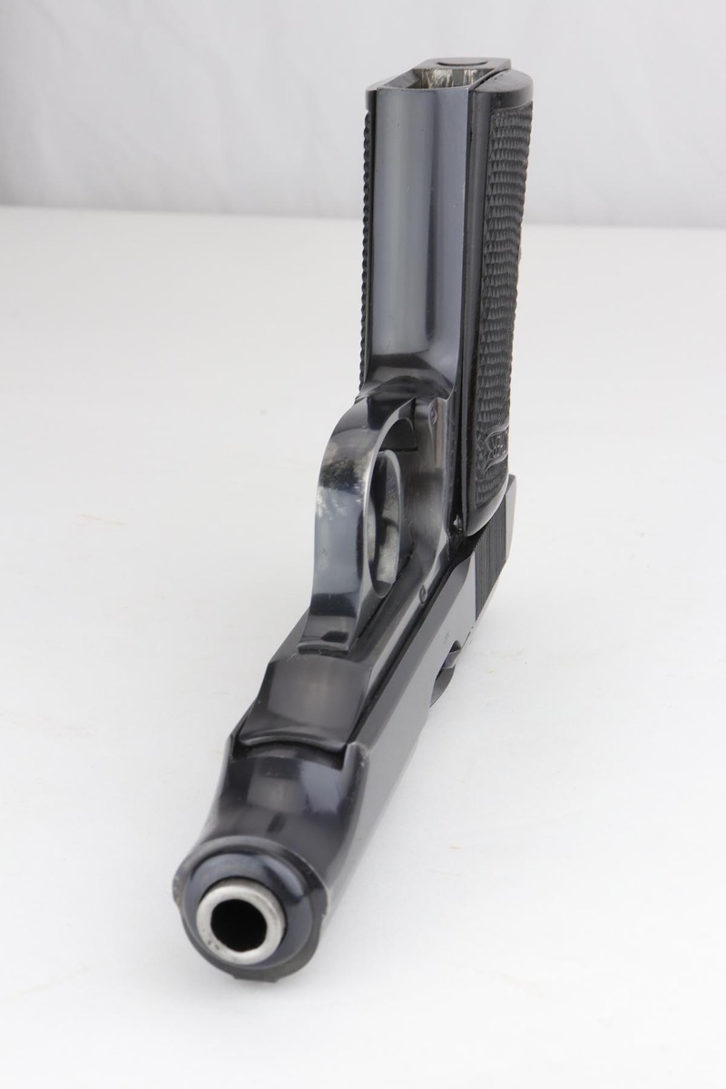 9/18/19 – This is a very early production Walther PP with some unique early features.  First, the grips are the early “X” reinforced grips.   The hammer is “large ring”.   The serial number is reversed, as they are in all 1st year production guns.   90 degree safely.   Rectangular (2 piece) firing pin and extended barrel.  Original finish is about 95-96%, with wear on the trigger guard and bottom of the back strap. Correct banner only magazine.  Excellent bore.