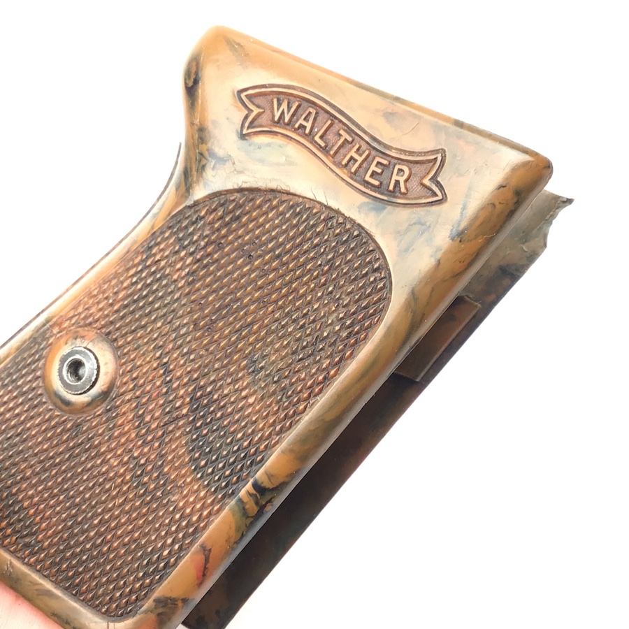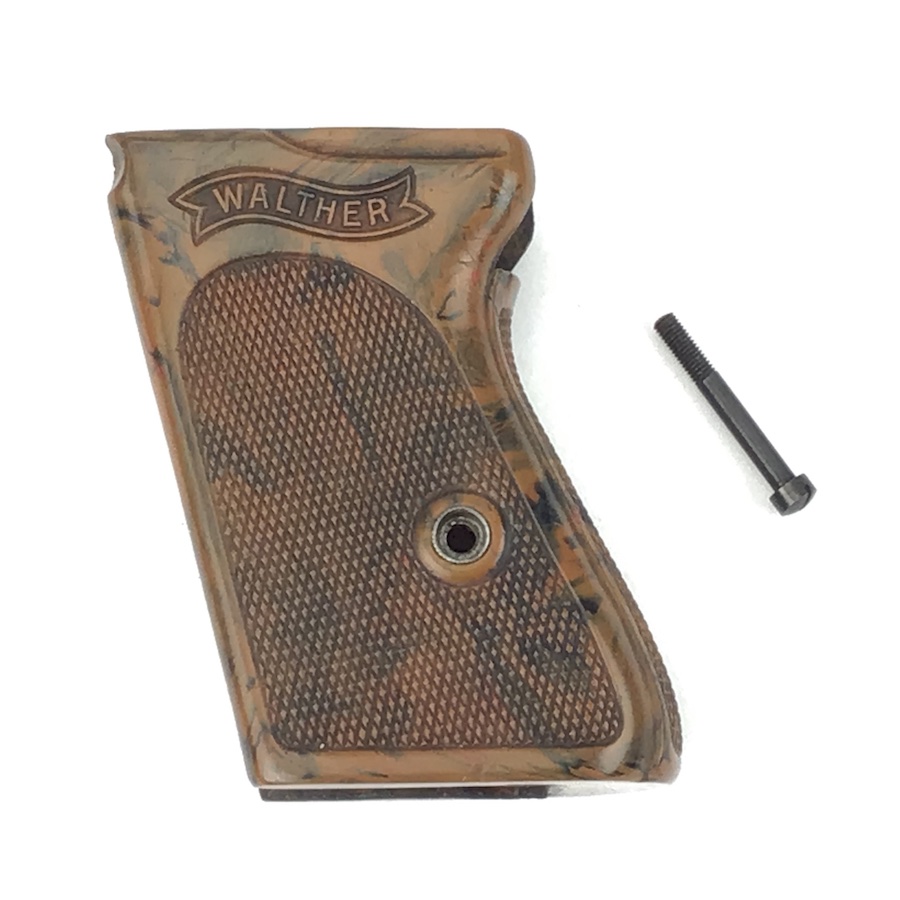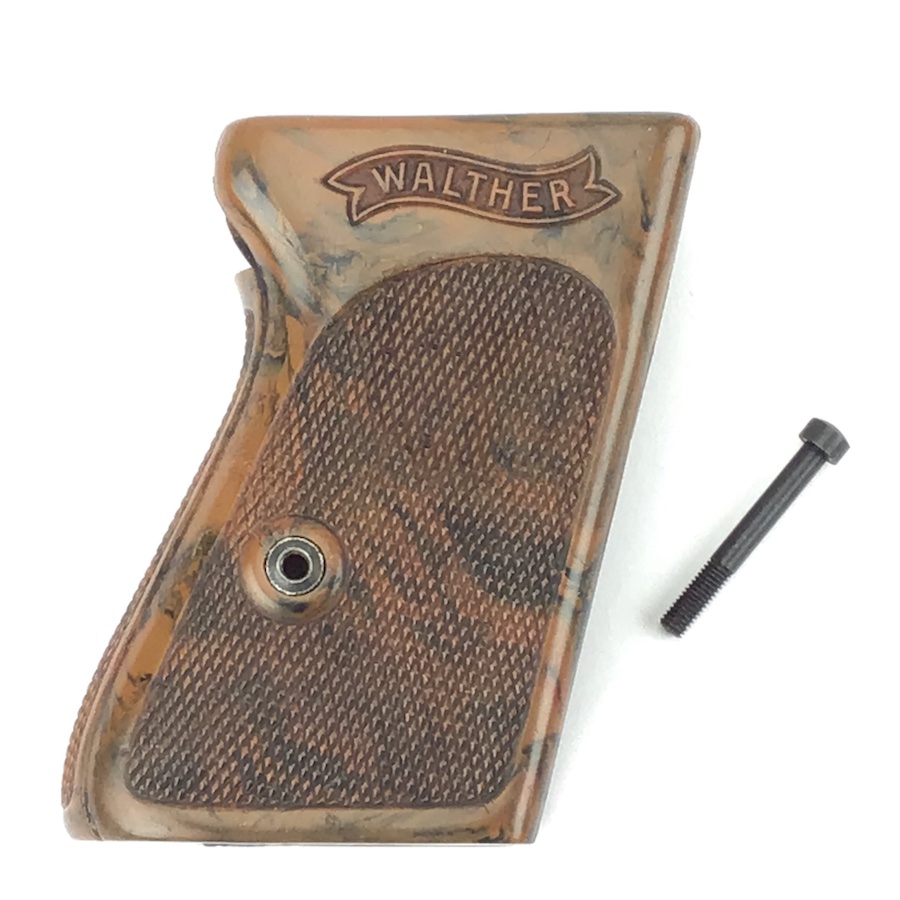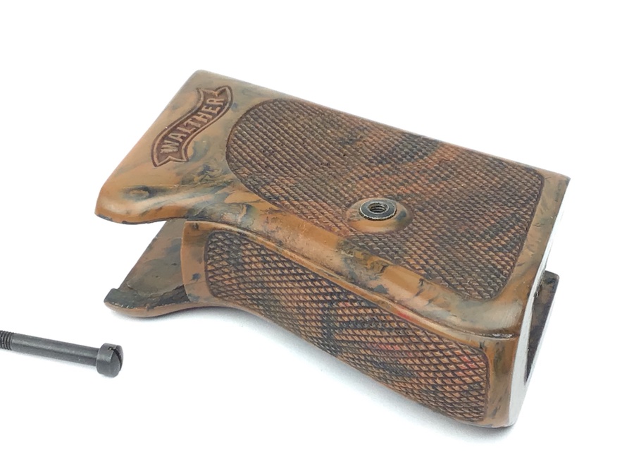 4/27/21 – Original and excellent+ Walther PPK grip and screw. This is the earlier style with a left to right grip screw. Beautiful coloring with no warping, cracks or chips. Sharp checkering with virtually no wear. Hard to upgrade. These grips appear to have had a minor repair on the right side. Other than a layer of epoxy on the internals, there is no outward indication of a problem.