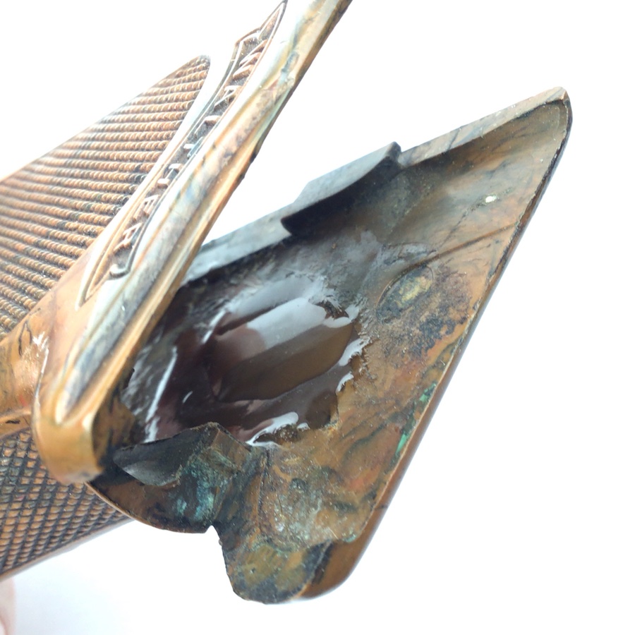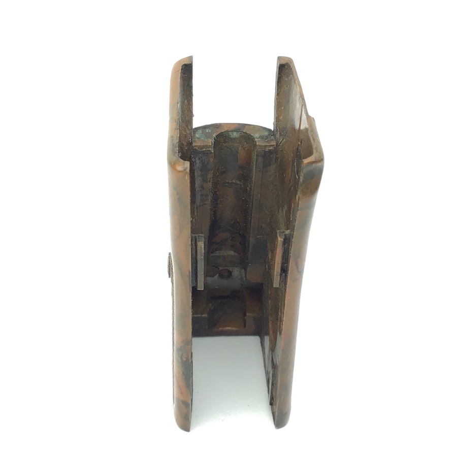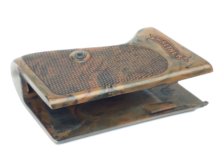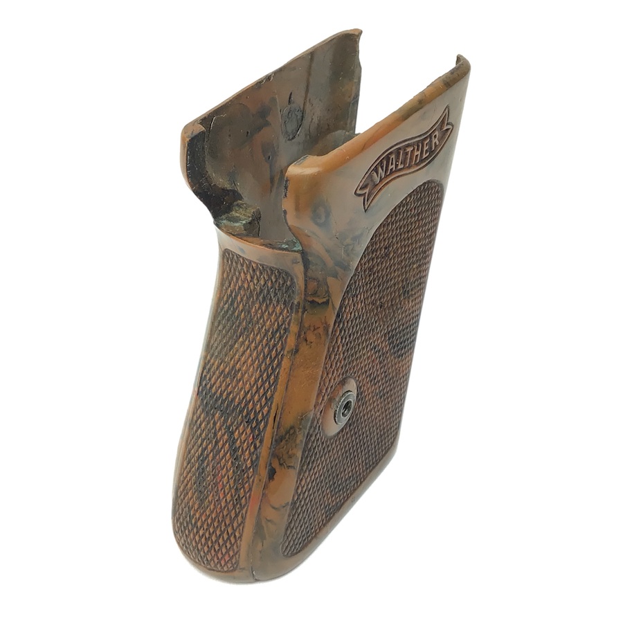 4/27/21 – Original and excellent+ Walther PPK grip and screw. This is the earlier style with a left to right grip screw. Beautiful coloring with no warping, cracks or chips. Sharp checkering with virtually no wear. Hard to upgrade. These grips appear to have had a minor repair on the right side. Other than a layer of epoxy on the internals, there is no outward indication of a problem.