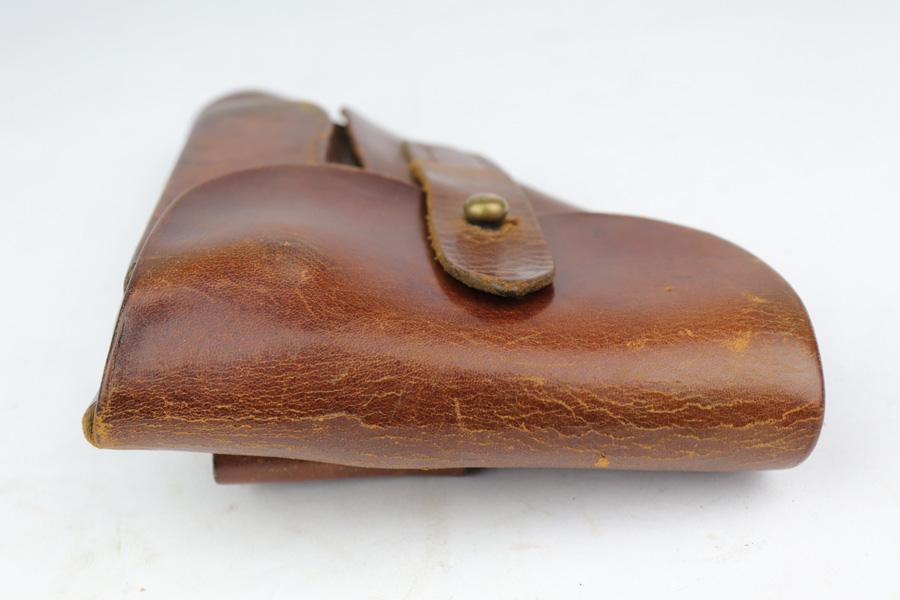 3/21/19 – This is an early / pre WW2 Walther PPK holster. The holster has an early brass closure knob and a very faint WALTHER PPK interior ink stamp. No maker markings or stamps anywhere on this holster. There was an interior knob patch that has since fallen off. The leather is in great condition with normal wear / edge scuffing. Stitching is all original and in tact.