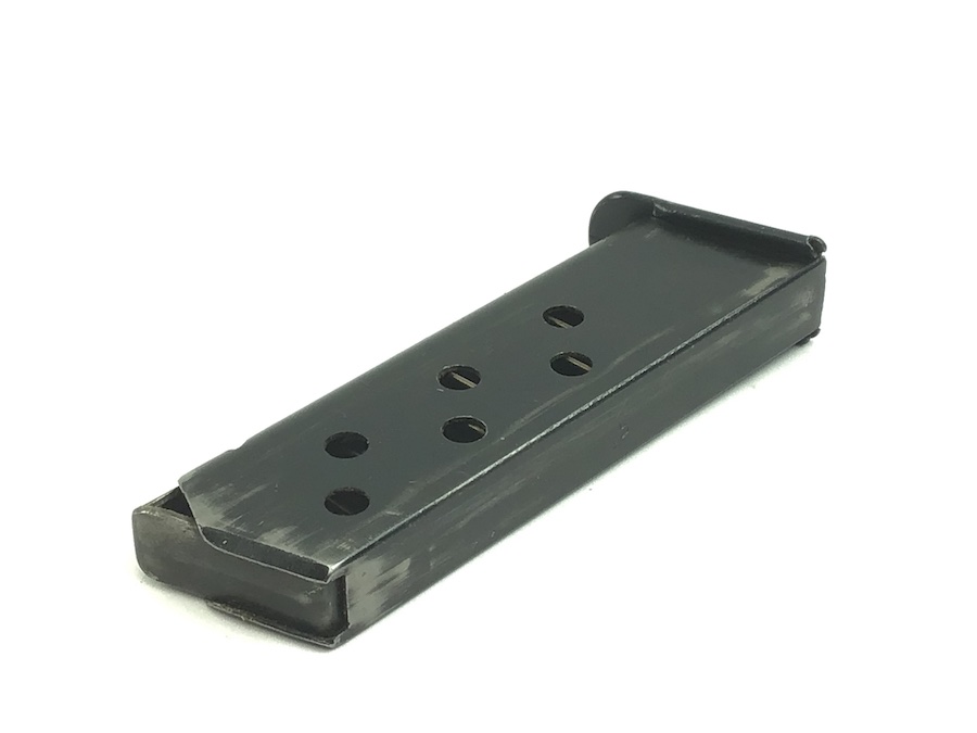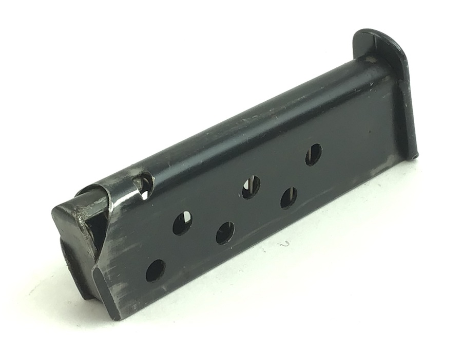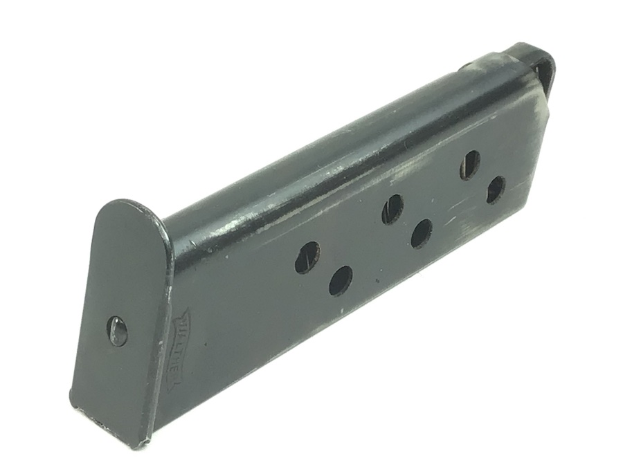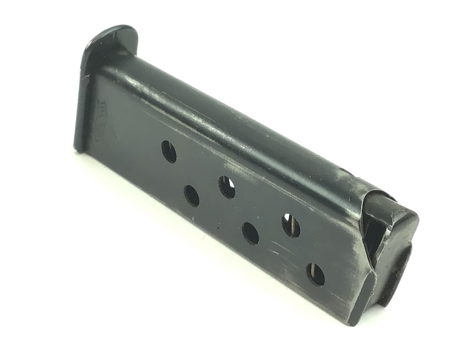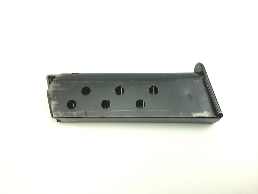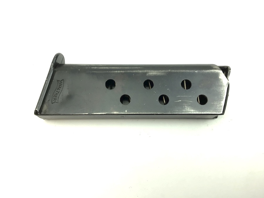 12/17/21 – This is an early WW2 production Walther PPK magazine. The magazine has a high polish blued finish in great condition. There is no rust or pitting. There is a small dimple in the tube on each side near the bottom, but this does not affect the functionality. The magazine spring is strong and fully functional.