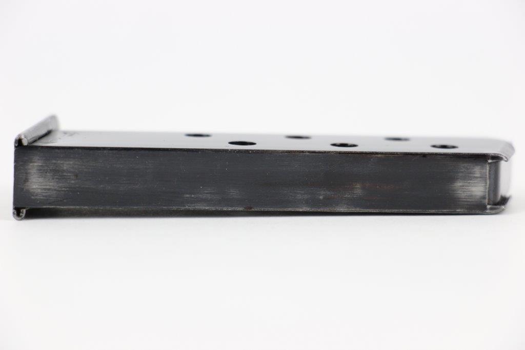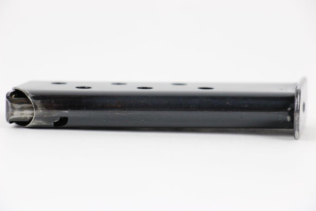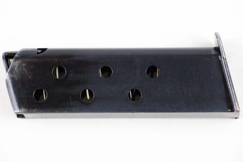 7/16/24 – This is an early WW2 variation Walther PPK magazine. The magazine features a high polish blued finish and Walther banner stamped on the base of the tube, as shown. There’s minimal finish loss and no rust or pitting. Strong, fully functional spring. Excellent base plate as well.