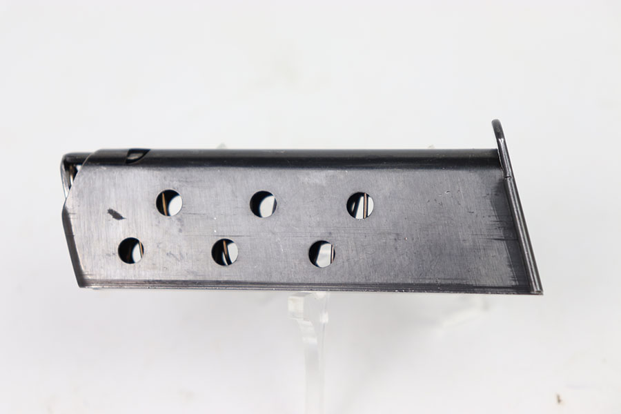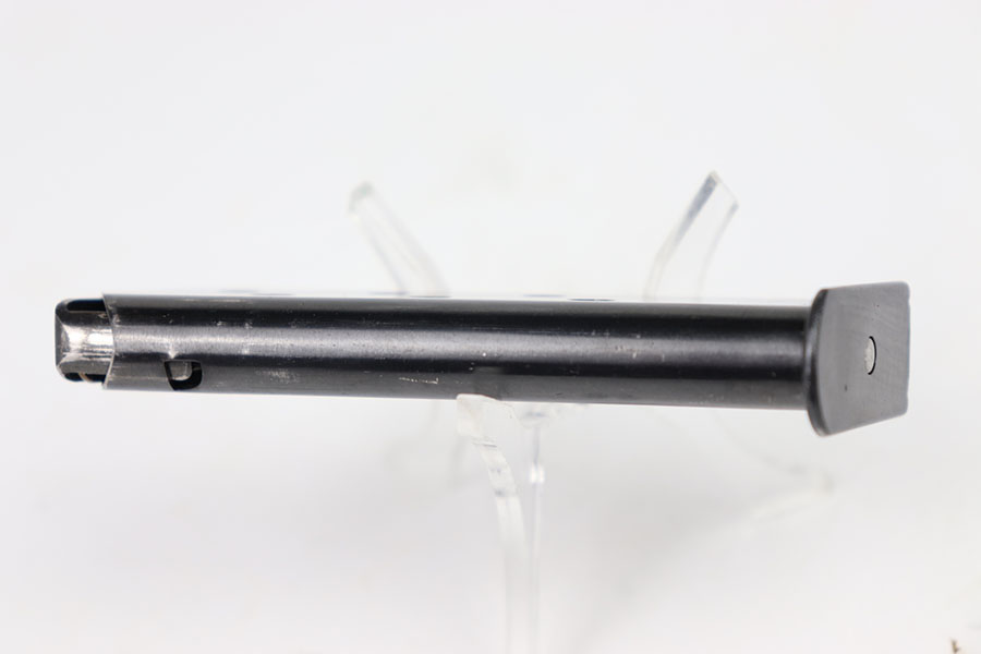 7/19/24 – This is an early WW2 variation Walther PPK magazine. The magazine features a high polish blued finish and Walther banner stamped on the base of the tube, as shown. There’s minimal finish loss and no rust or pitting. Strong, fully functional spring. Excellent base plate as well.