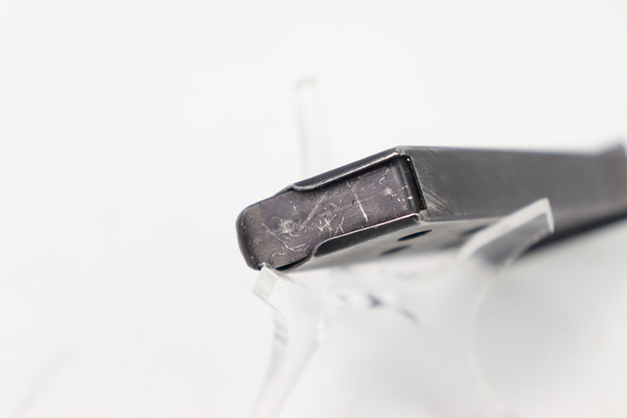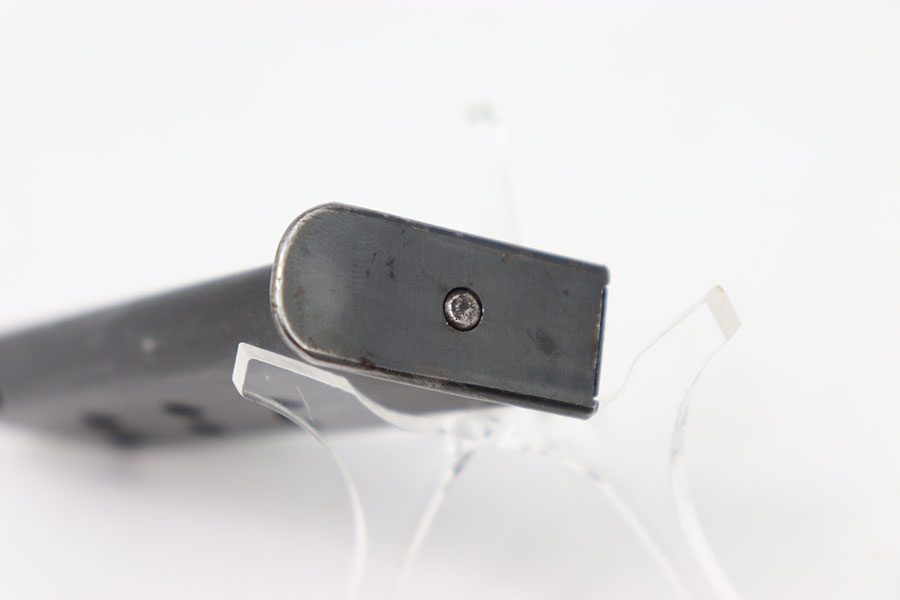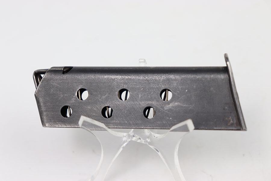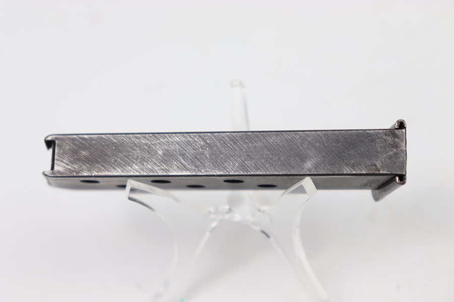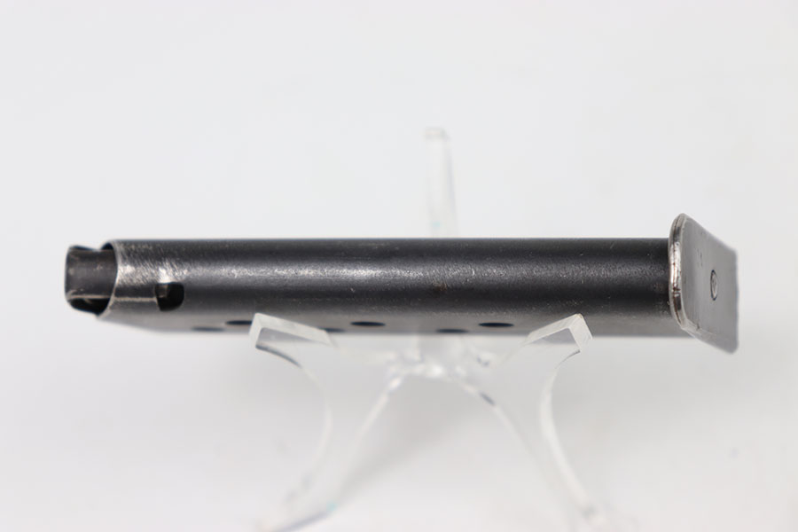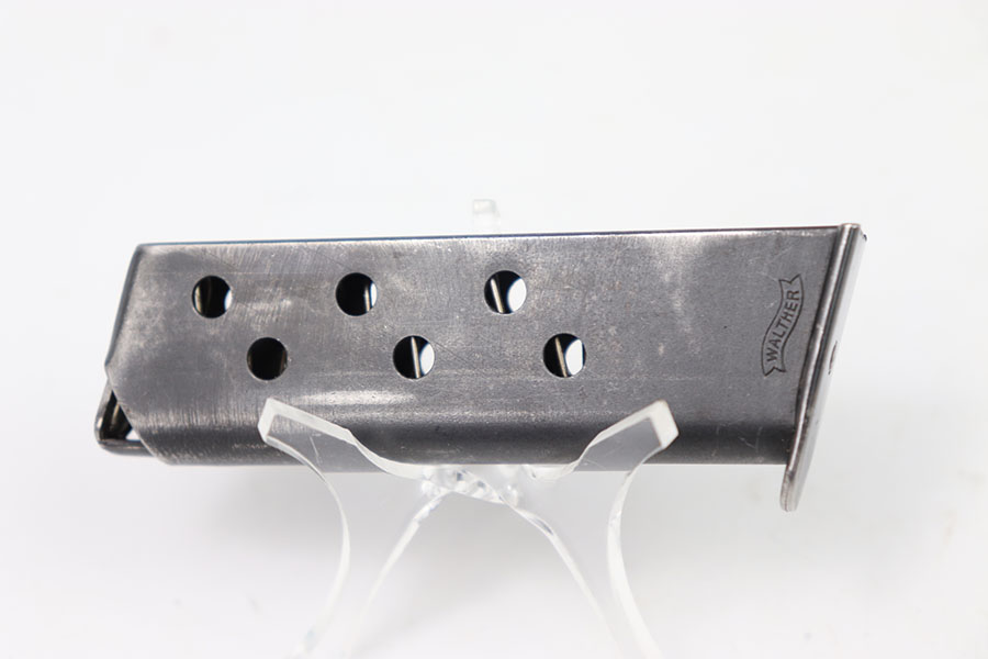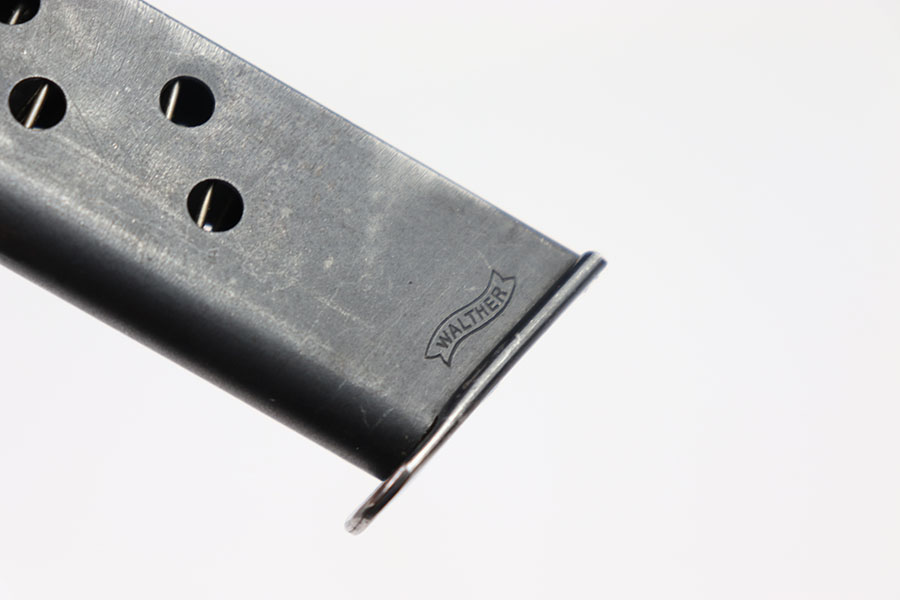 7/22/24 – This is an original, early WW2 production Walther PPK magazine. The magazine has a dull blued finish with some small areas of finish loss but in overall great+ condition. No rust or pitting however, and a fully functional spring. Walther banner stamped on the left side of the tube. Strong and functional spring