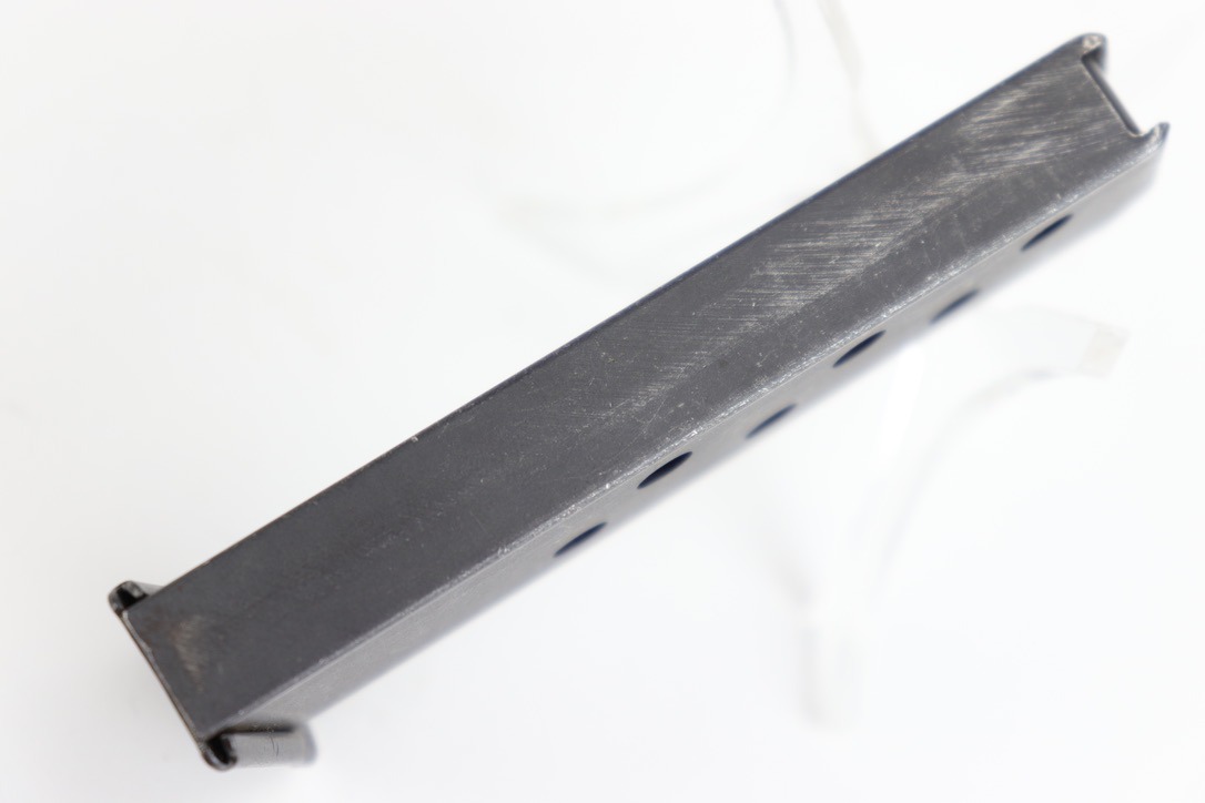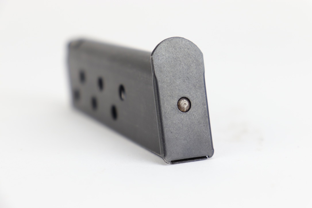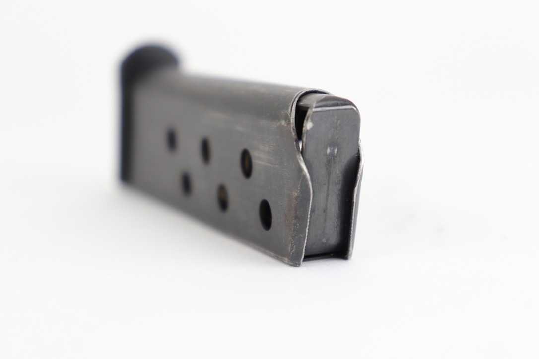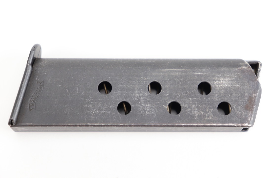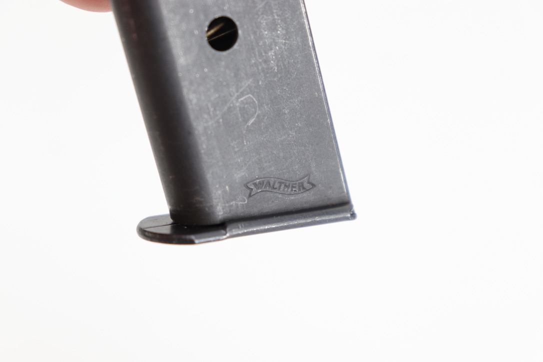 10/2/24 – For sale is an original banner only Walther PPK magazine in 7.65mm. This magazine shows normal use wear with one small spot of rust just under the left feed lip. Spring is strong and functional. Great overall condition.