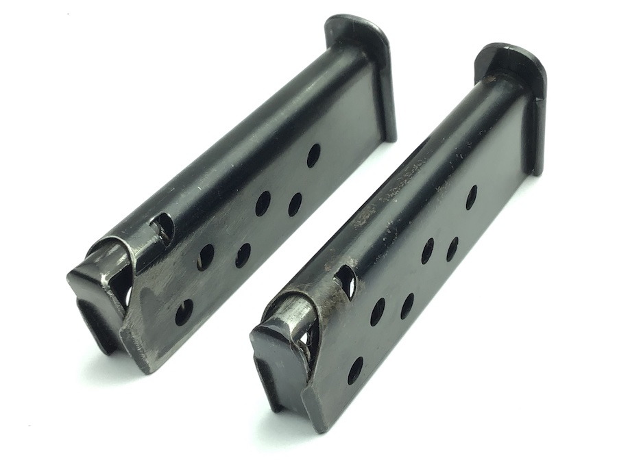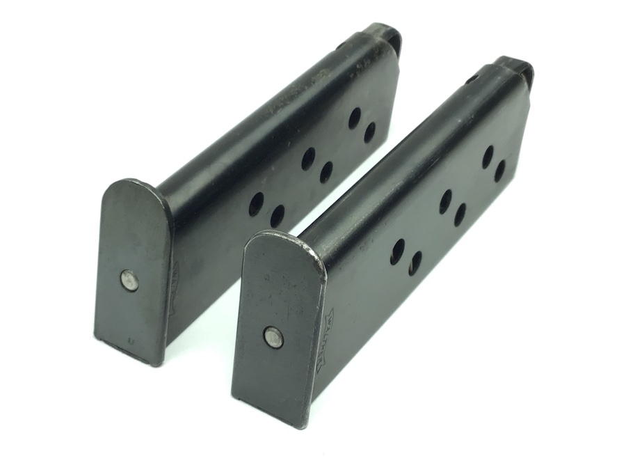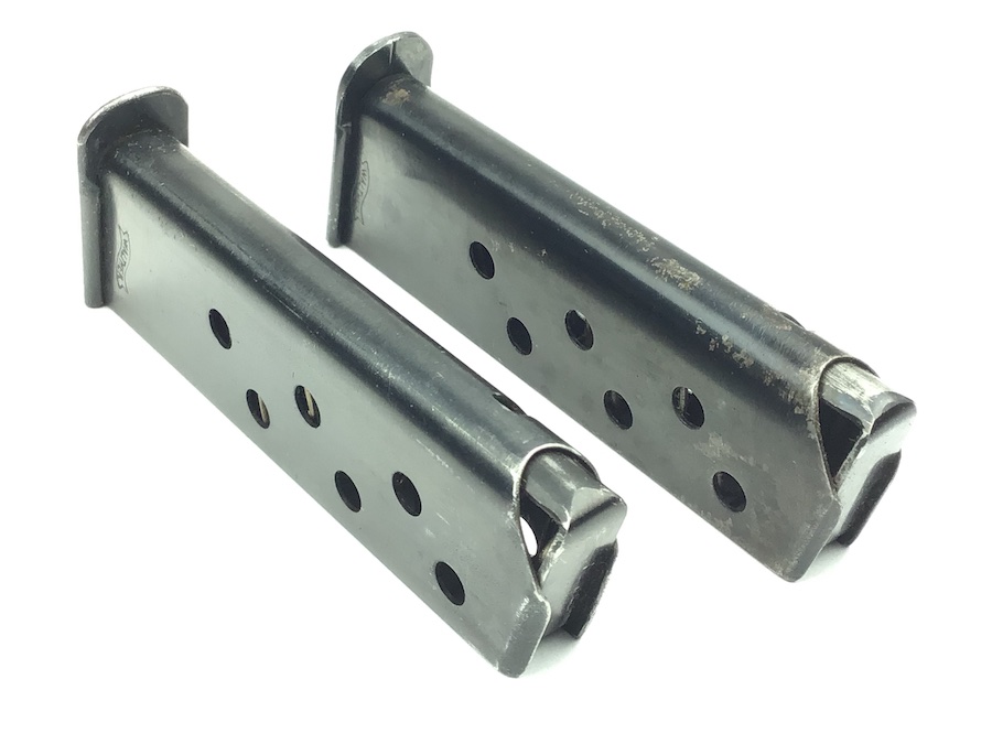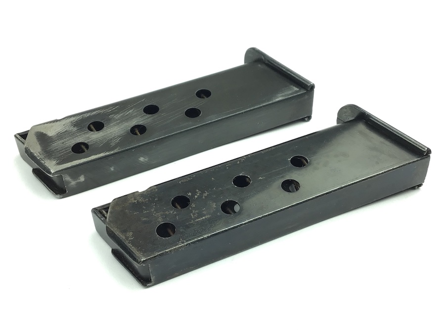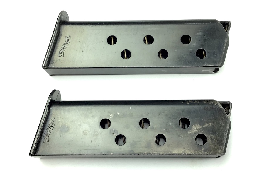 11/25/20 – Set of 2. These are early / pre WW2 production Walther PPK magazines. These magazines have a high polish blued finish in great condition. There is no rust or pitting, but general use wear. The magazine springs are strong and fully functional.