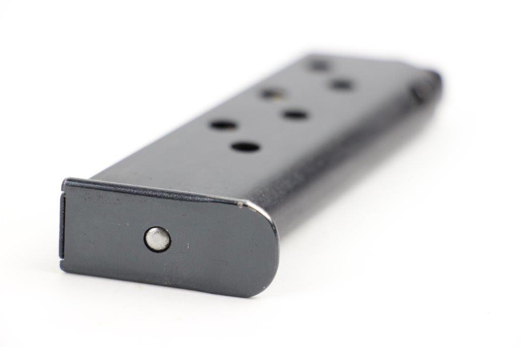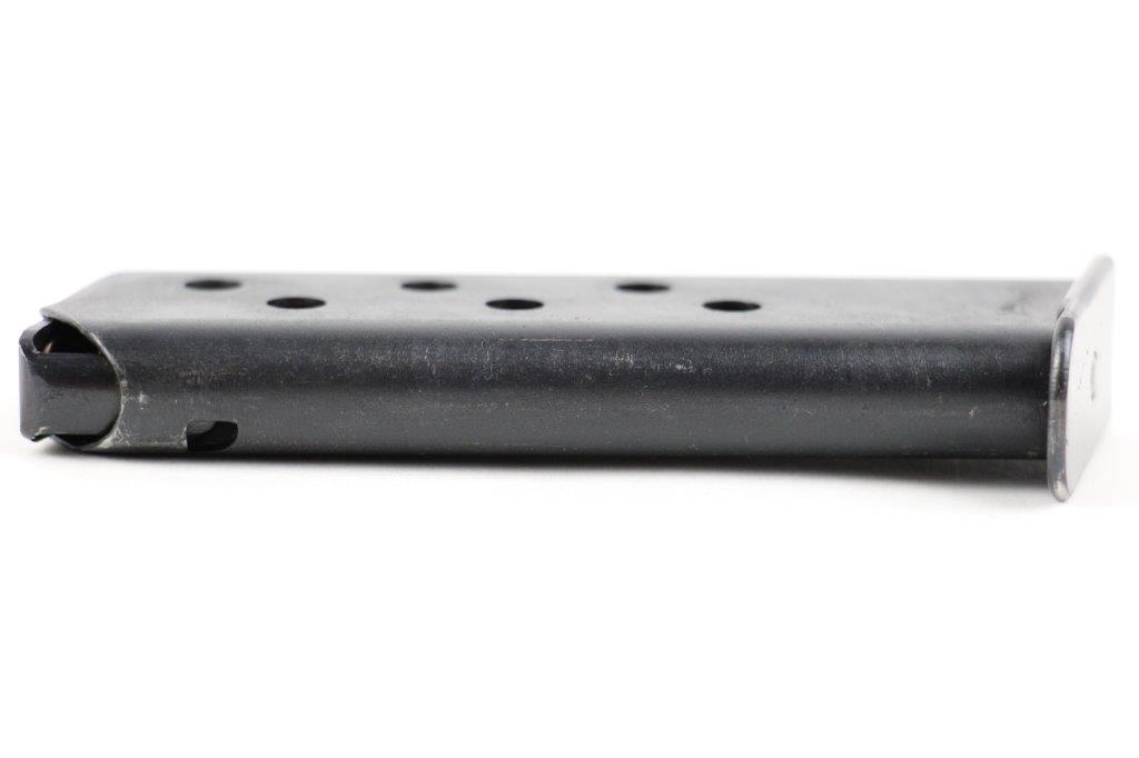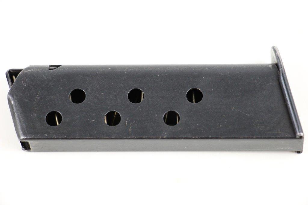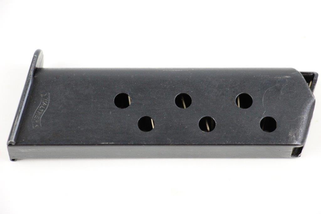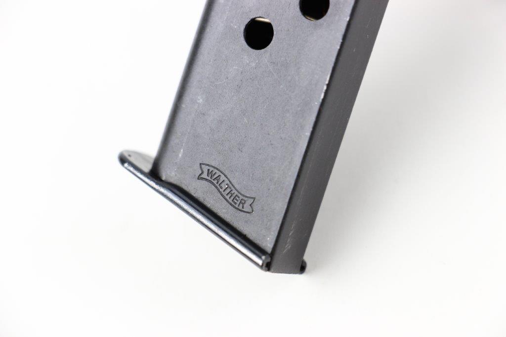 6/3/24 – This is an excellent condition, early WW2 wartime production (transitional) Walther PPK magazine. The magazine is transitional due to the dull wartime blued finish, but early style Walther banner stamp on the left side of the tube. Excellent finish throughout with minimal finish loss and a fully functional spring.
