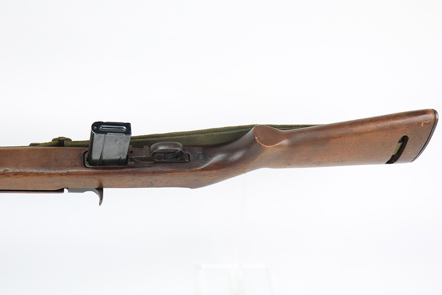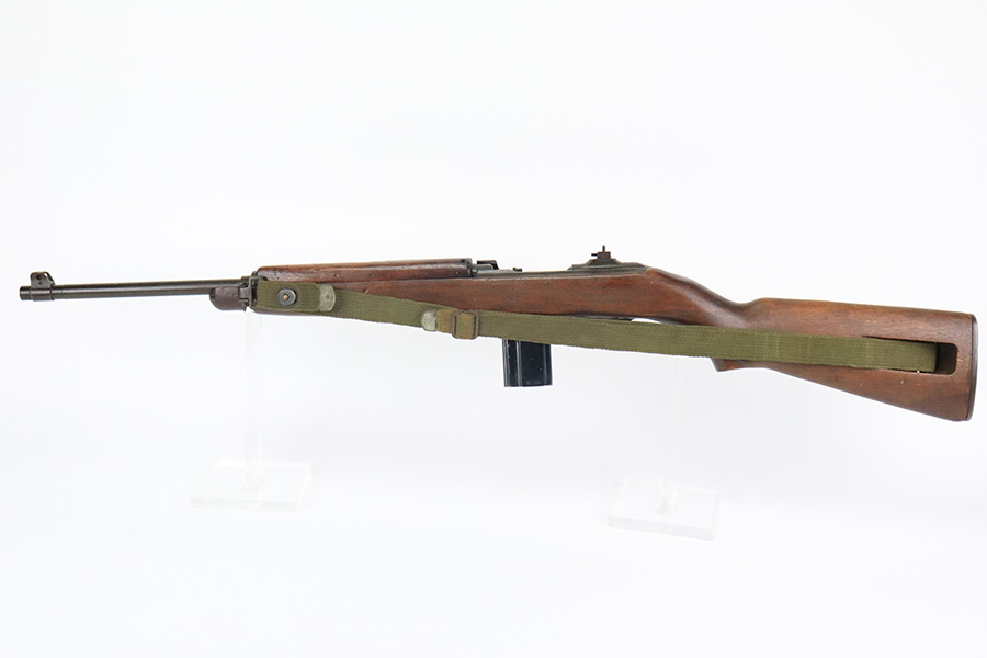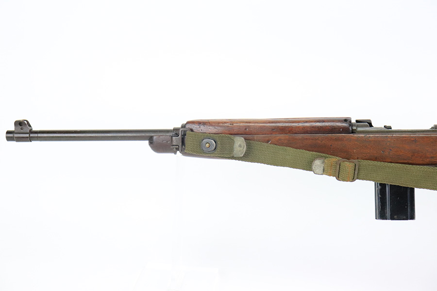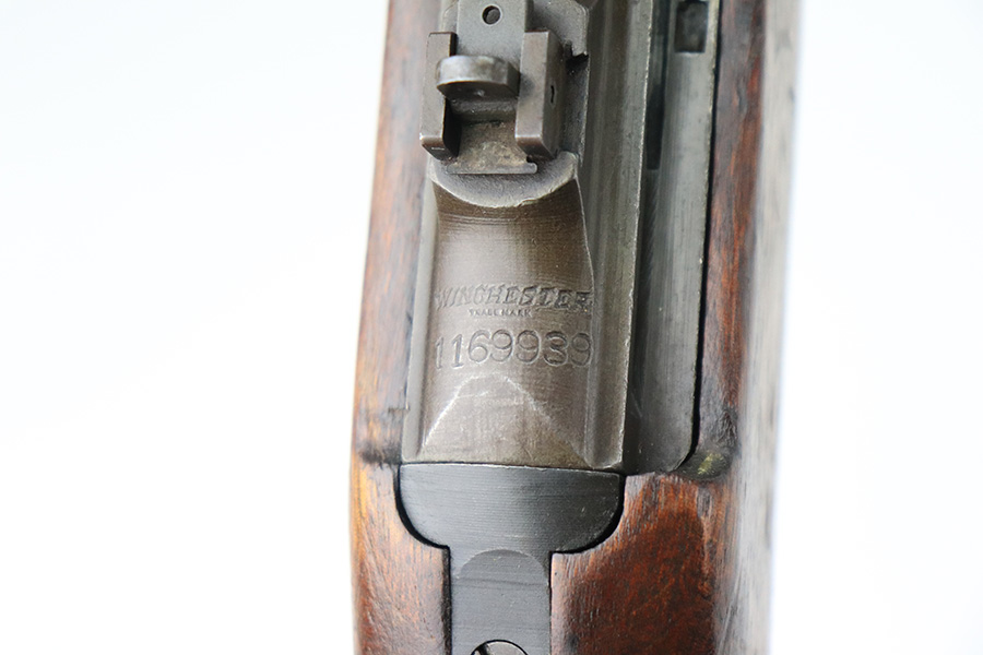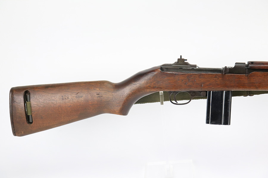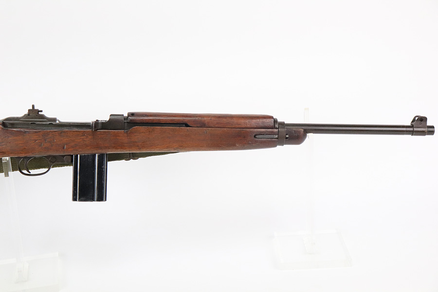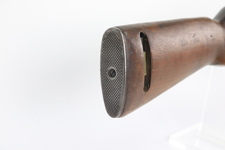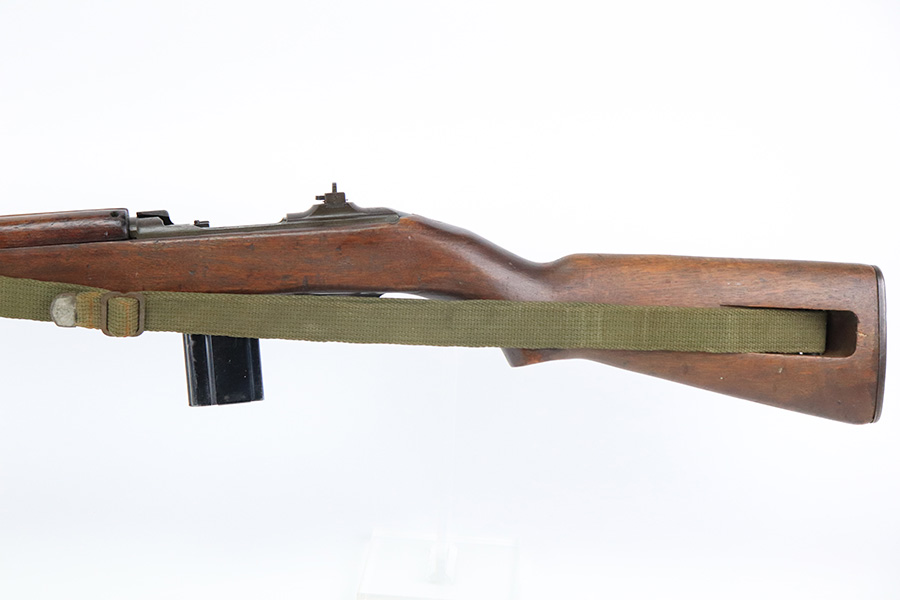 6/17/22 – This is a scarce, early Winchester M1 Carbine from 1943. A full parts list is included, but the rifle is all original and correct except for the recoil plate, which was replaced. Scarce, original “pot belly” stock with proper inspection marks. The finish on the metal is original, with the receiver showing patina and minor thinning throughout. The stock has various dings and handling wear but no cracks. Bore is shiny with strong rifling but there’s a thin ring of wear near the muzzle end.